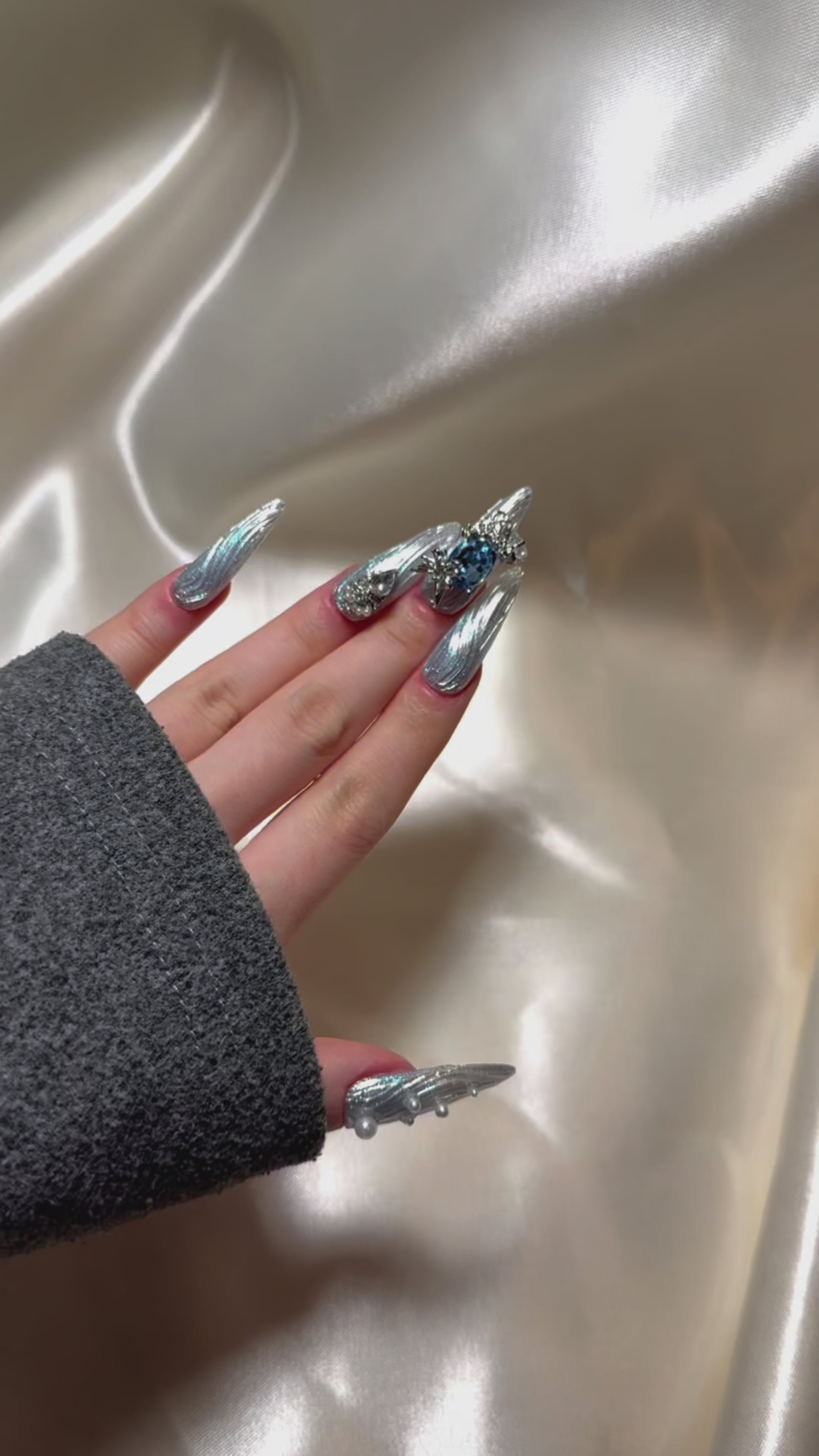 A tribute to the icy elegance of the far north, Arctic Jewel shimmers with a glacial silver-blue base that mirrors the soft iridescence of moonlight on snow. Sculpted gel textures flow like frozen waves, while scattered pearl accents and faceted rhinestones evoke frost-kissed dew and crystallized sea spray. At the center of the design, a brilliant sapphire gem is cradled by intricate silver embellishments, recalling a mythical relic lost in the depths of a frozen sea. Sophisticated and luminous, this design is ideal for winter soirées, snow-themed events, or any moment deserving of a statement.