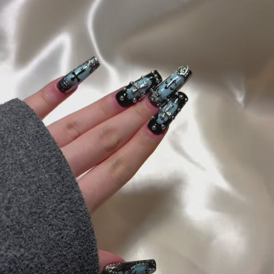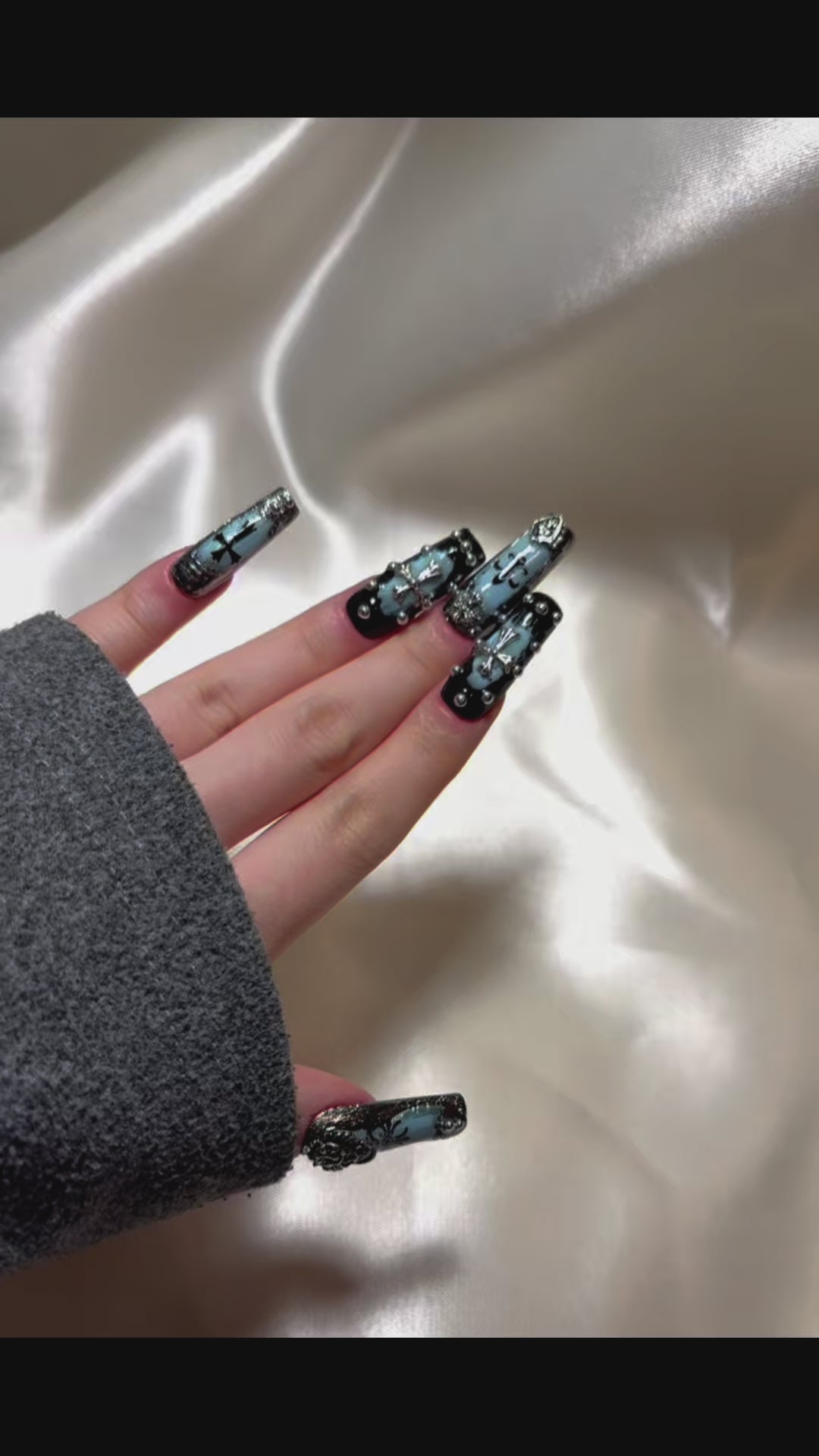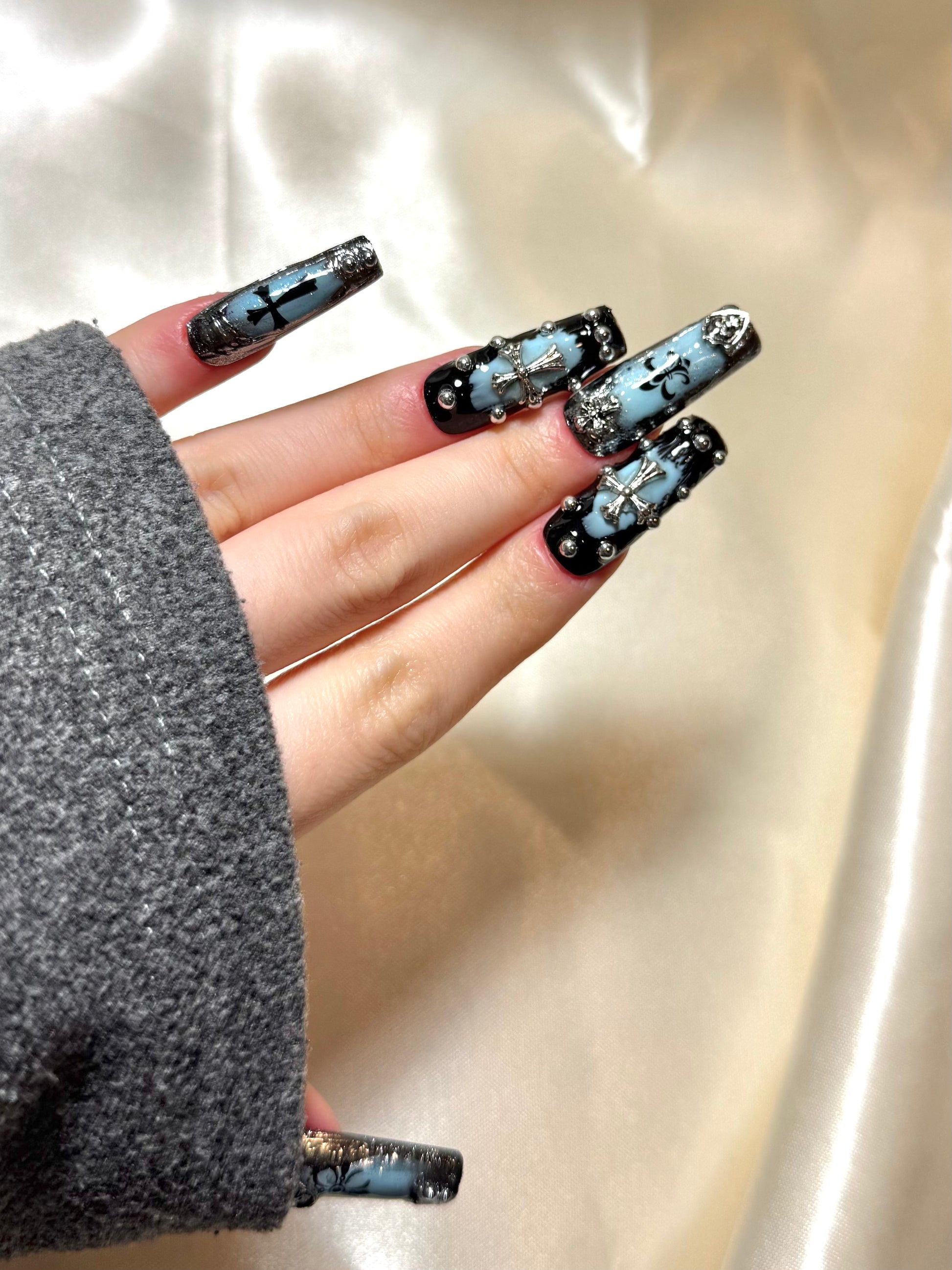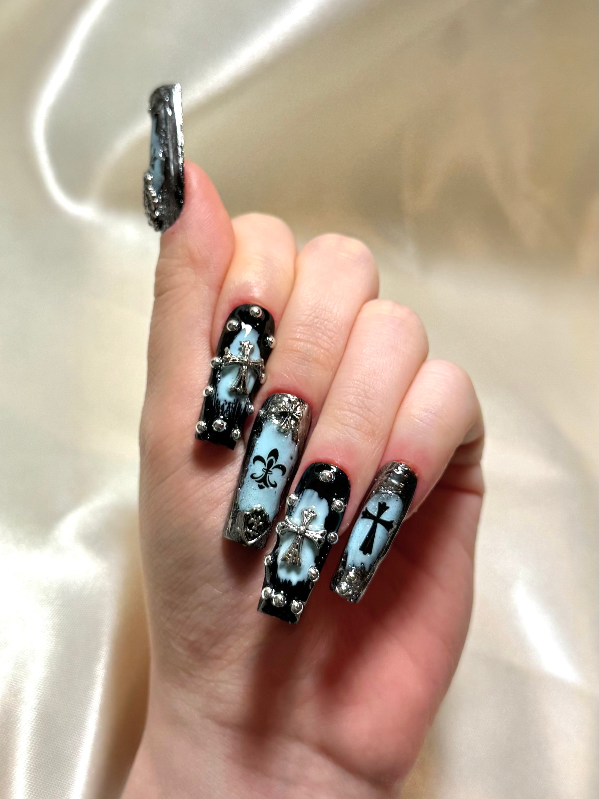 Something about the cool sheen of steel meeting the solemn glow of blue gives Azure Oath its unshakable presence. The base transitions from misty cerulean to deep navy, framed in sculptural silver accents that echo medieval armor. Embellished with gothic crosses, sword motifs, and heraldic crests, each detail carries a quiet gravitas—equal parts sacred and defiant. With its balance of ornate structure and austere symbolism, this design evokes baroque elegance with a warrior’s soul.