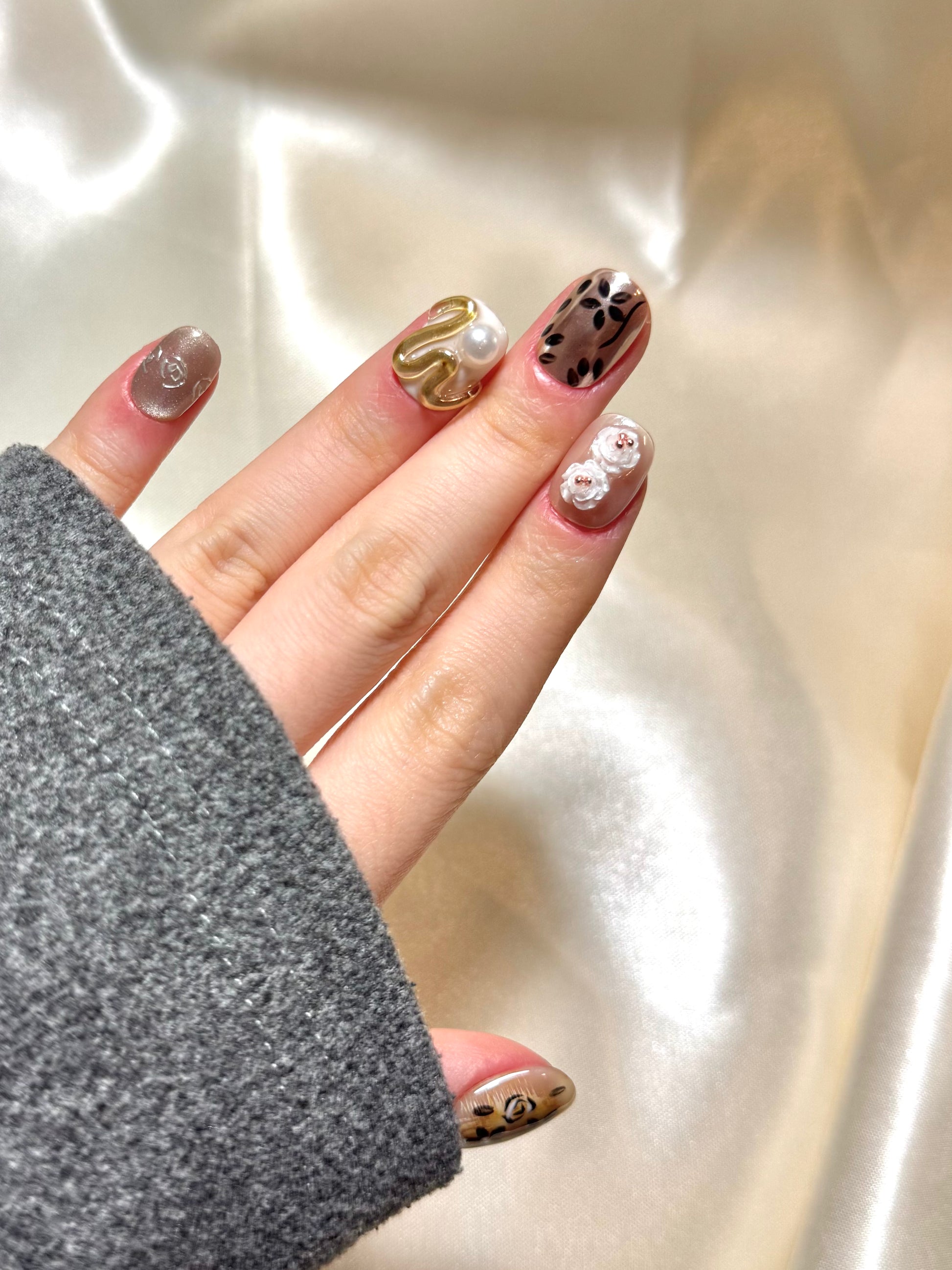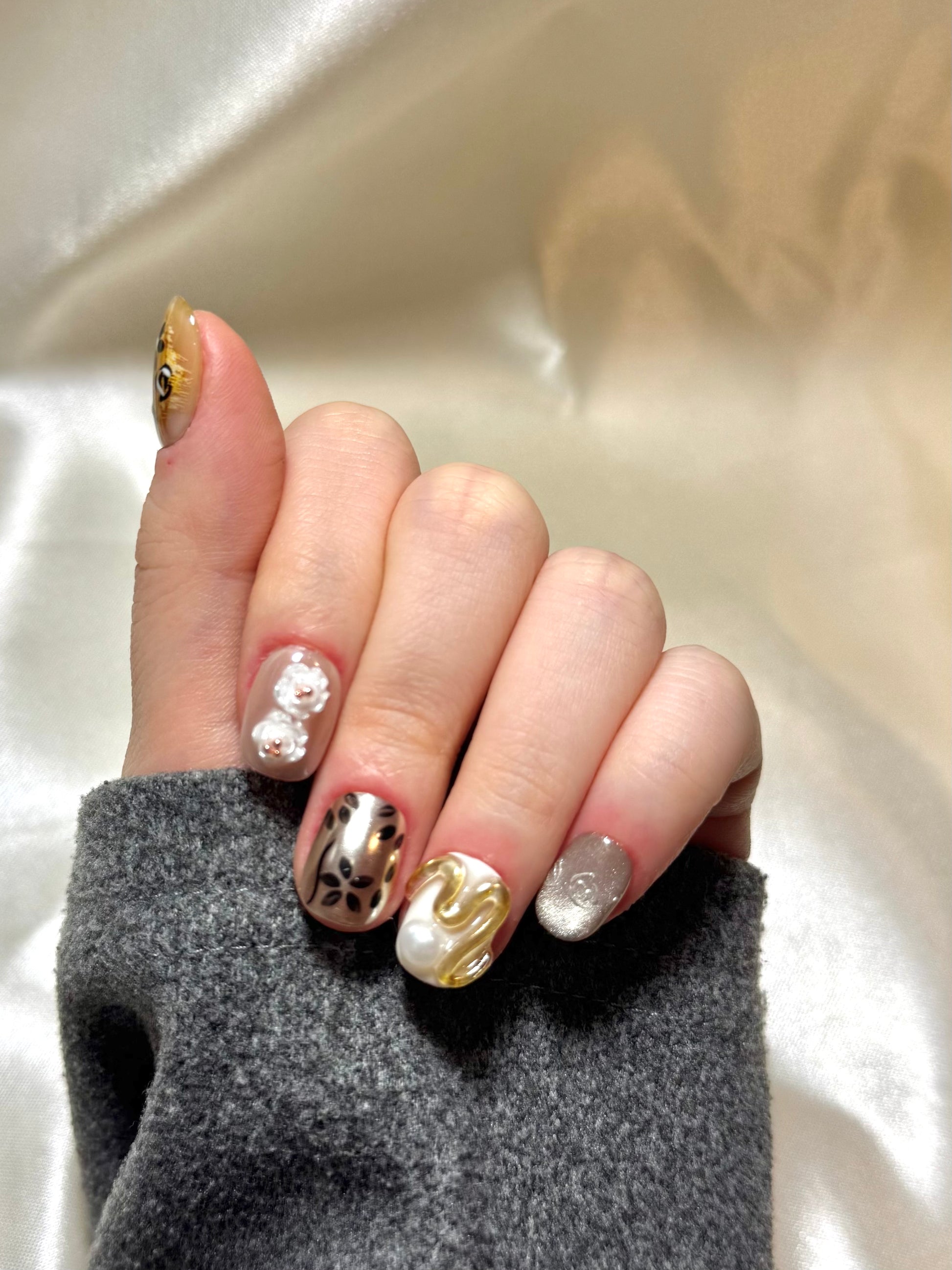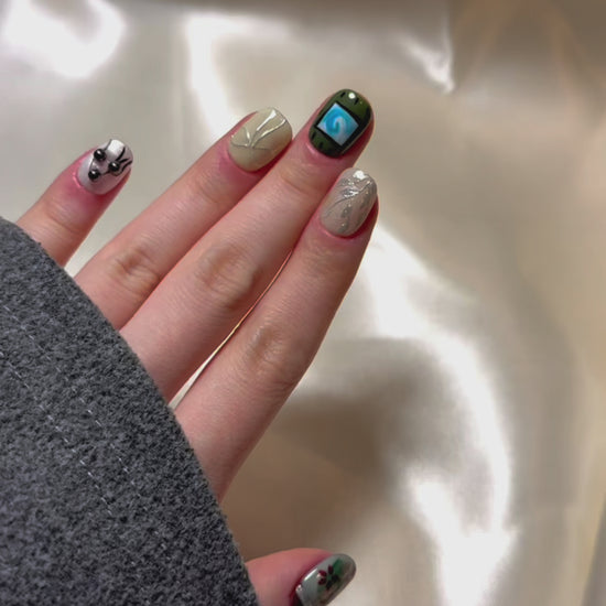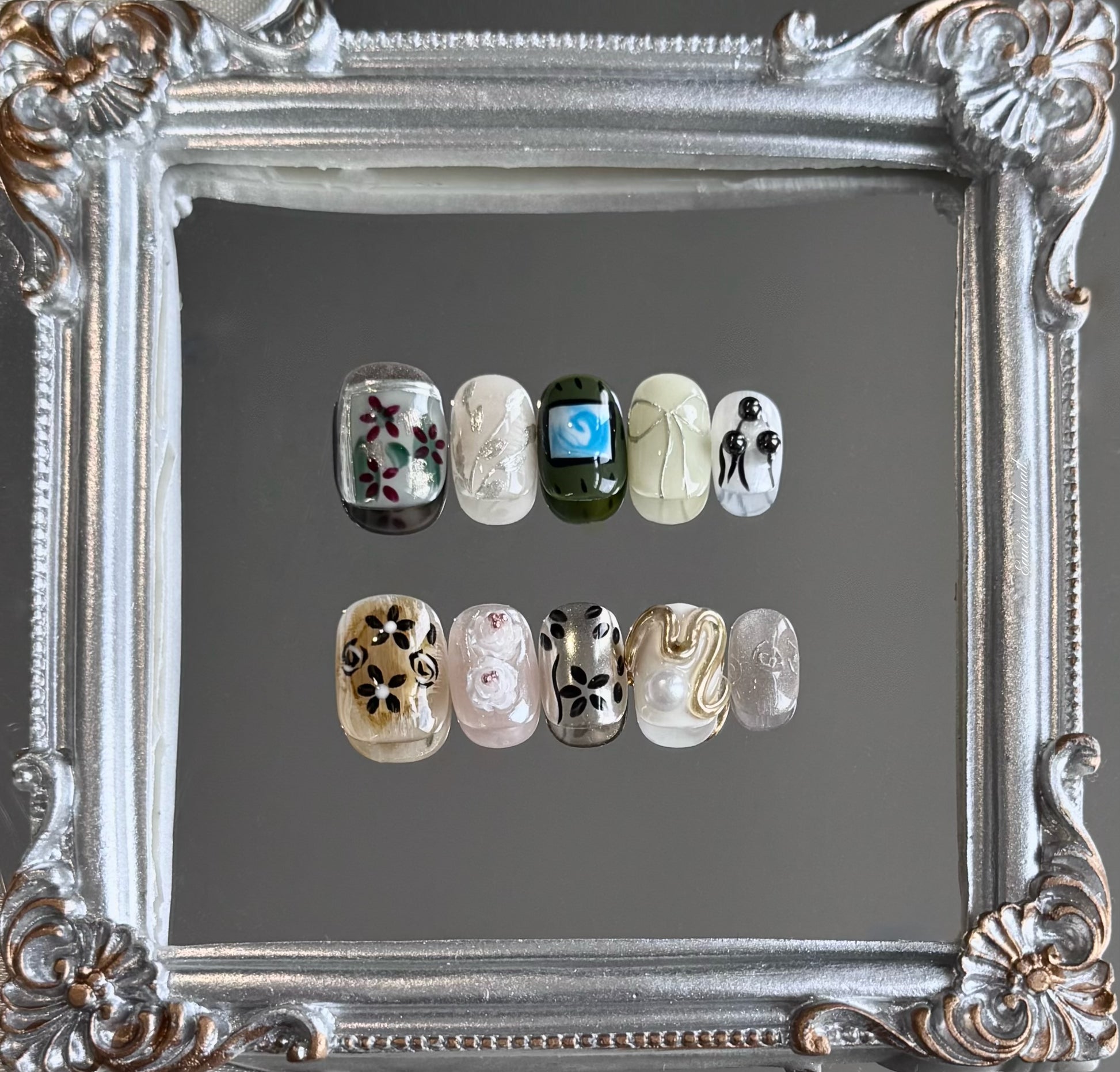 Botanical Collage begins like a page torn from an artist’s sketchbook—where pressed flowers, pencil doodles, and collected textures meet in gentle harmony. A soft canvas of muted neutrals and olive tones lays the foundation for layered hand-drawn florals in deep plum and inky black, while silver etched leaves and an outlined bow add a refined, almost whimsical charm. A blue rose encased in a green frame echoes the feel of a preserved bloom, quietly bold yet deeply nostalgic. Tactile accents like 3D blossoms, sculptural pearls, and molten gold swirls lend an artisanal touch. Perfect for those with a fondness for nature’s quiet elegance and collage-inspired creativity.
