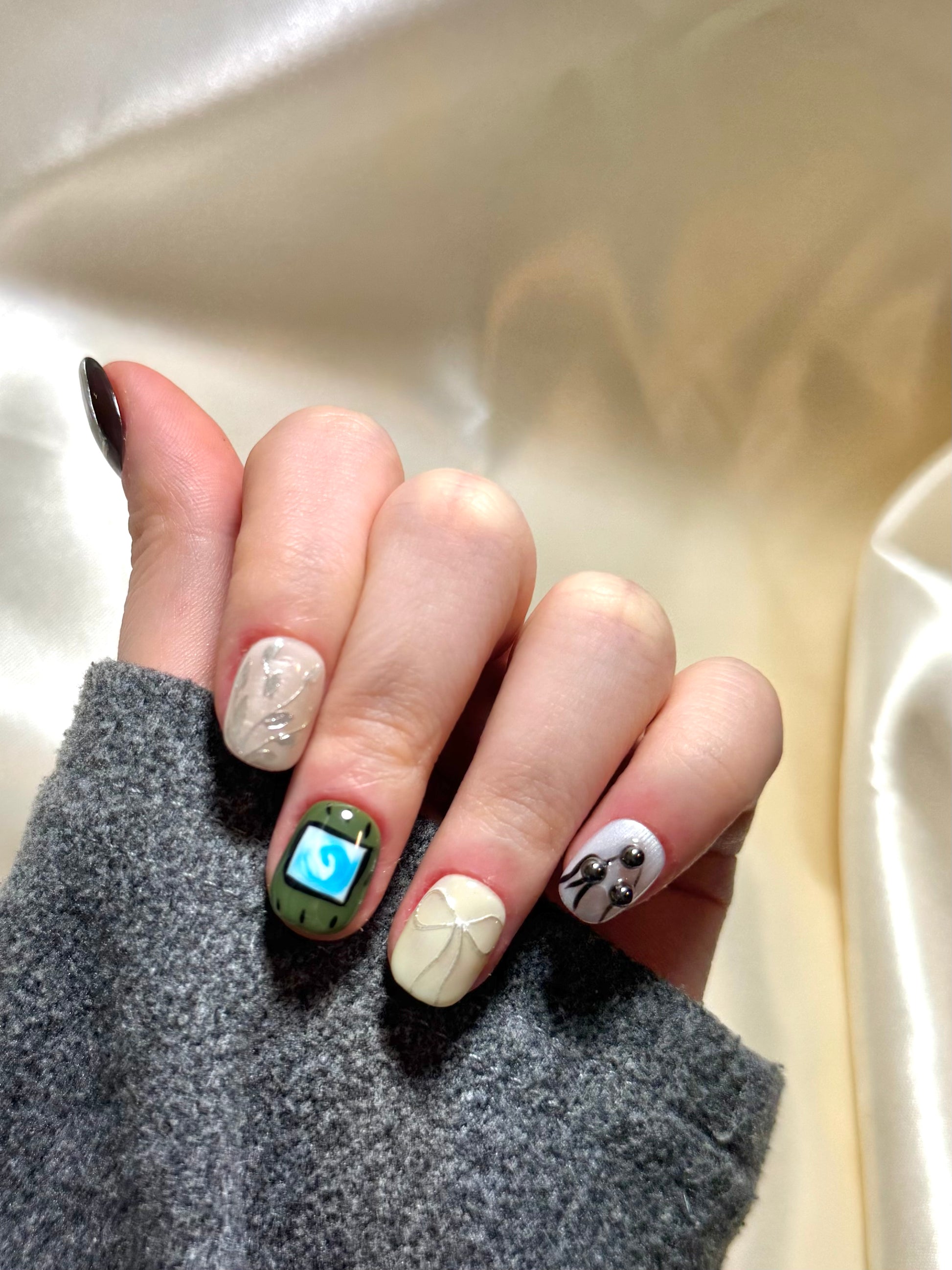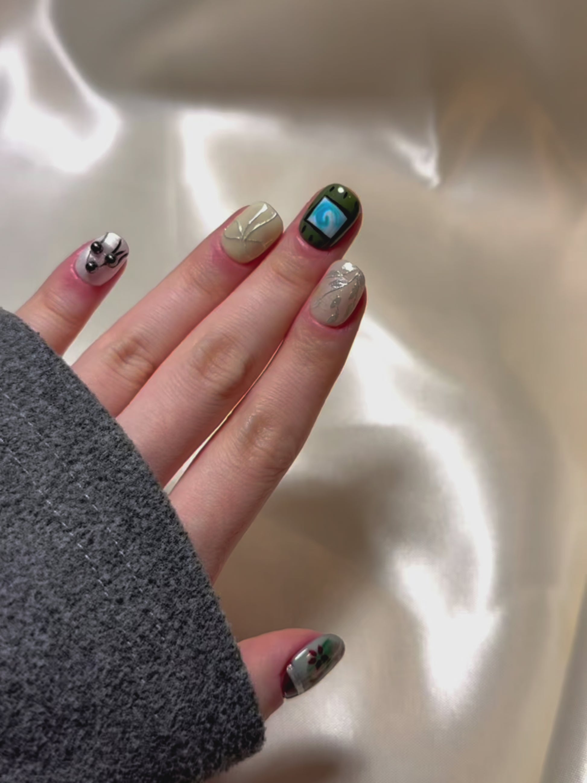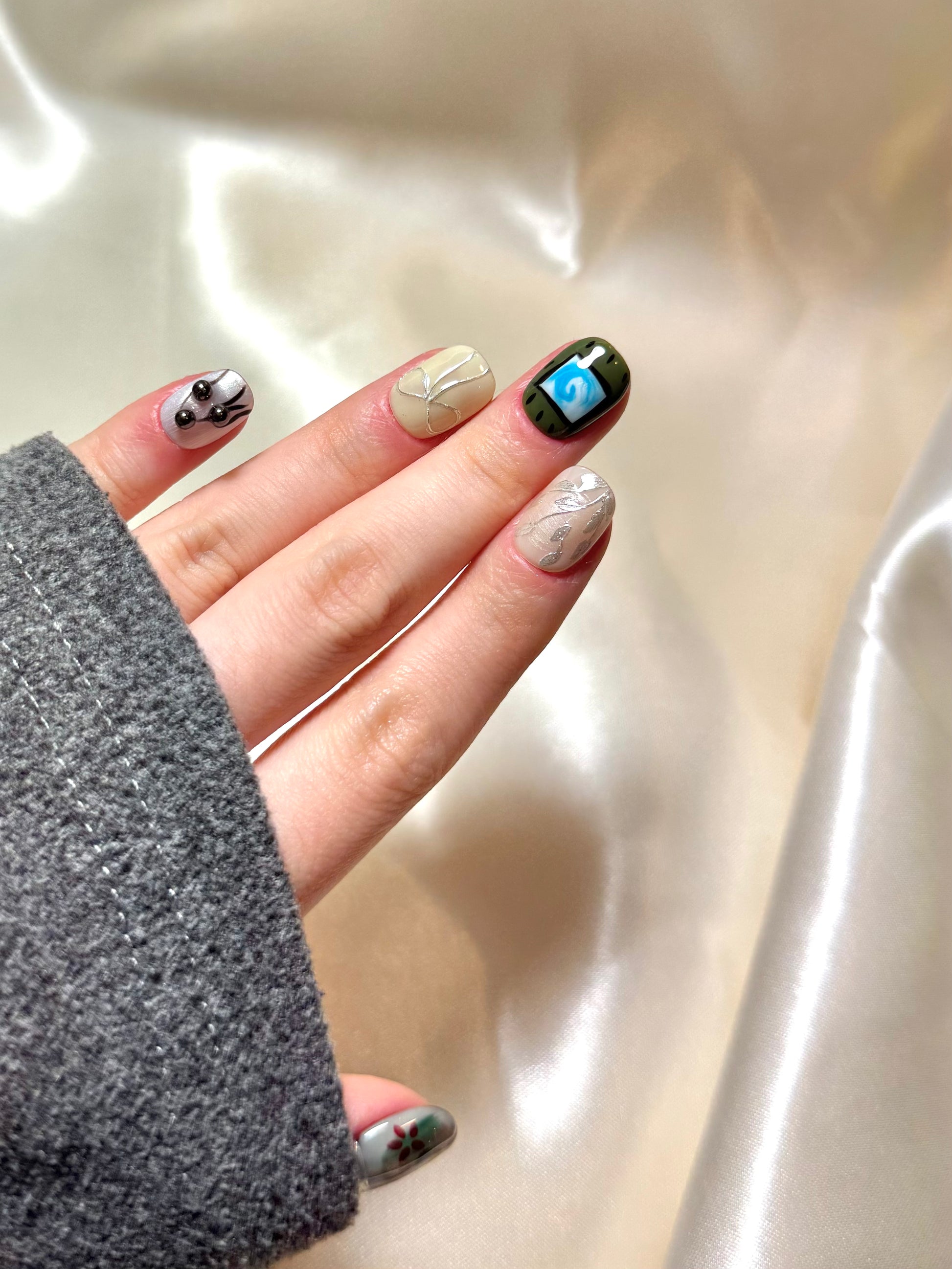Botanical Collage begins like a page torn from an artist’s sketchbook—where pressed flowers, pencil doodles, and collected textures meet in gentle harmony. A soft canvas of muted neutrals and olive tones lays the foundation for layered hand-drawn florals in deep plum and inky black, while silver etched leaves and an outlined bow add a refined, almost whimsical charm. A blue rose encased in a green frame echoes the feel of a preserved bloom, quietly bold yet deeply nostalgic. Tactile accents like 3D blossoms, sculptural pearls, and molten gold swirls lend an artisanal touch. Perfect for those with a fondness for nature’s quiet elegance and collage-inspired creativity.