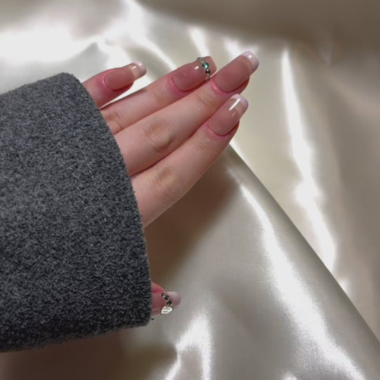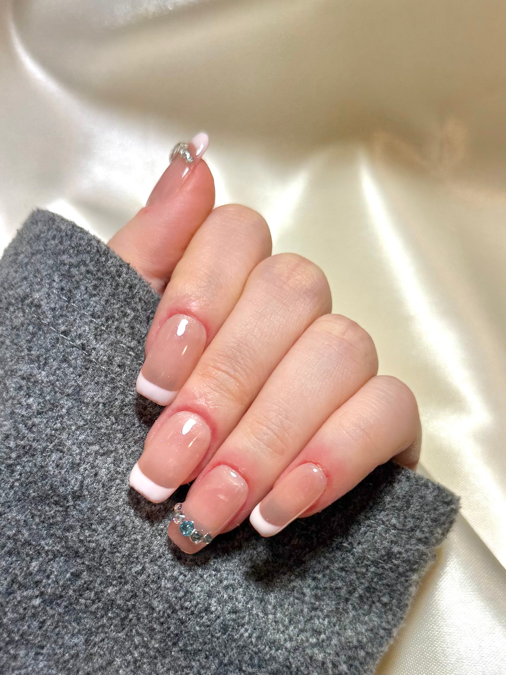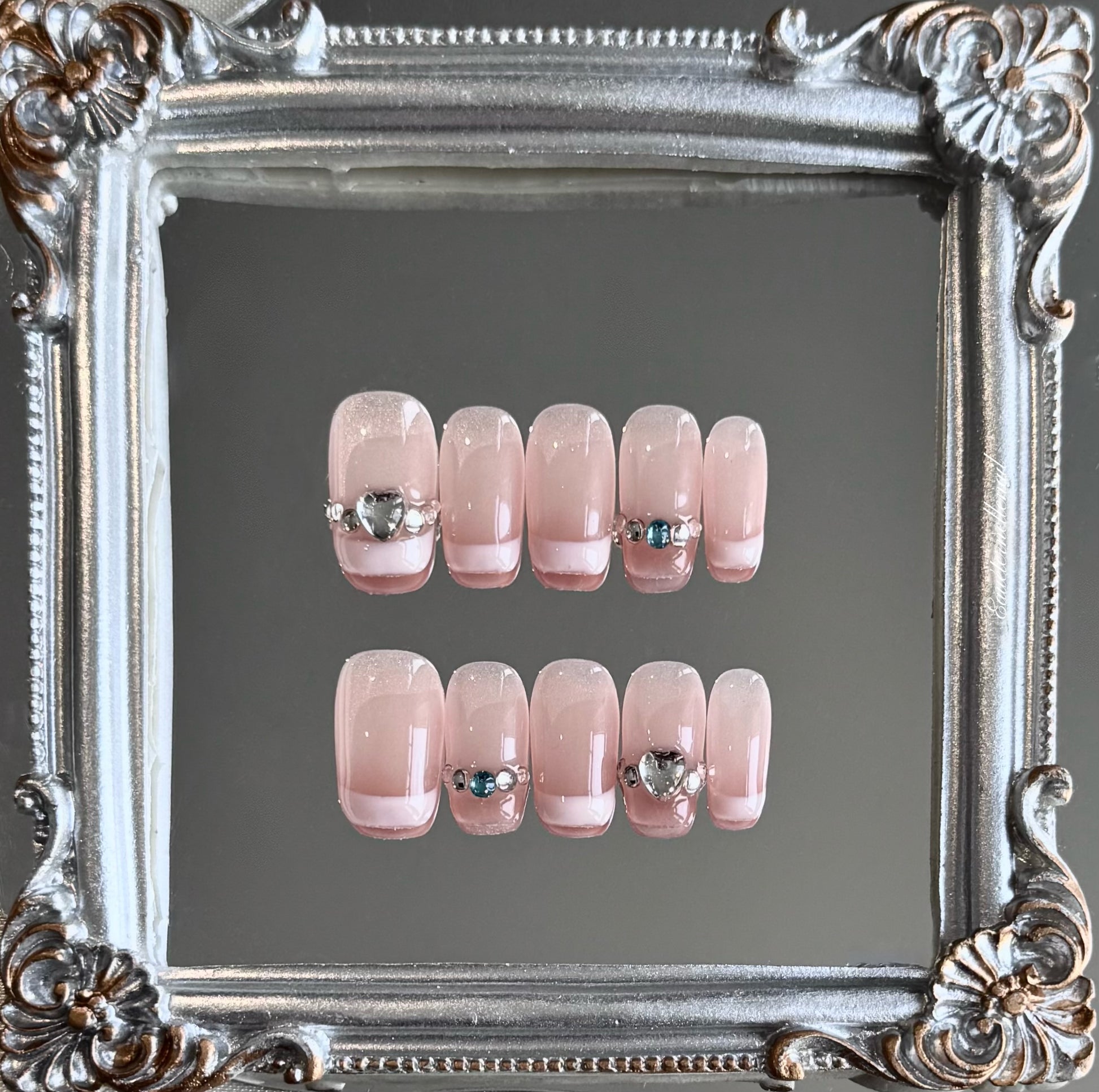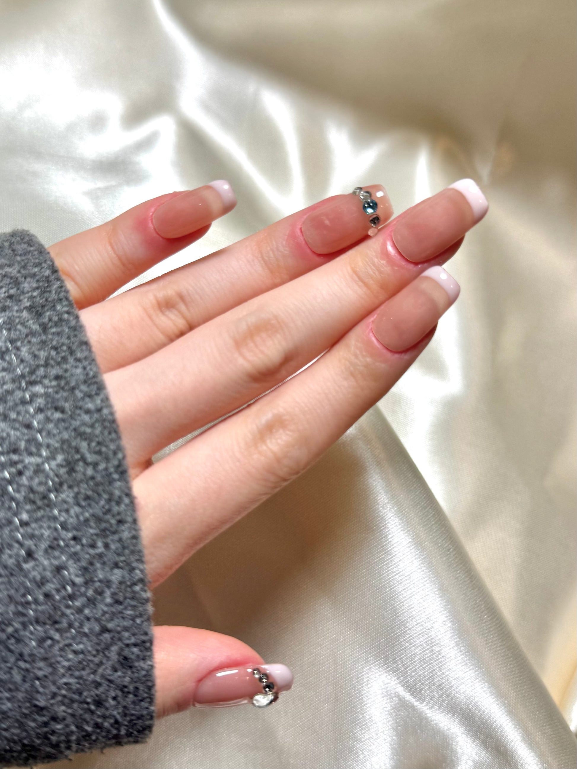 Soft ivory tips melt seamlessly into a translucent nude base in Creamy Romance, capturing the quiet sophistication of a modern-day heirloom. Scattered crystal arcs and a single statement gem lend just the right amount of sparkle, balancing minimalism with ornamental grace. With its timeless palette and refined details, this design suits both elegant everyday wear and intimate occasions.
