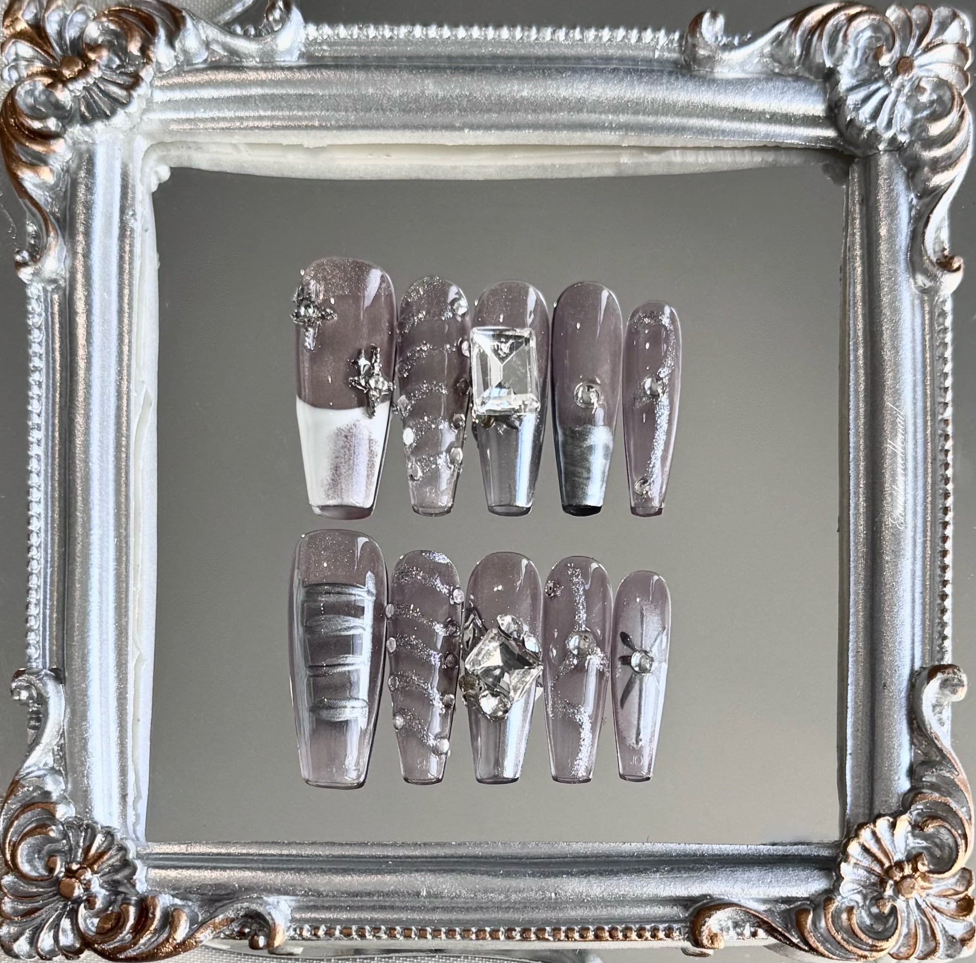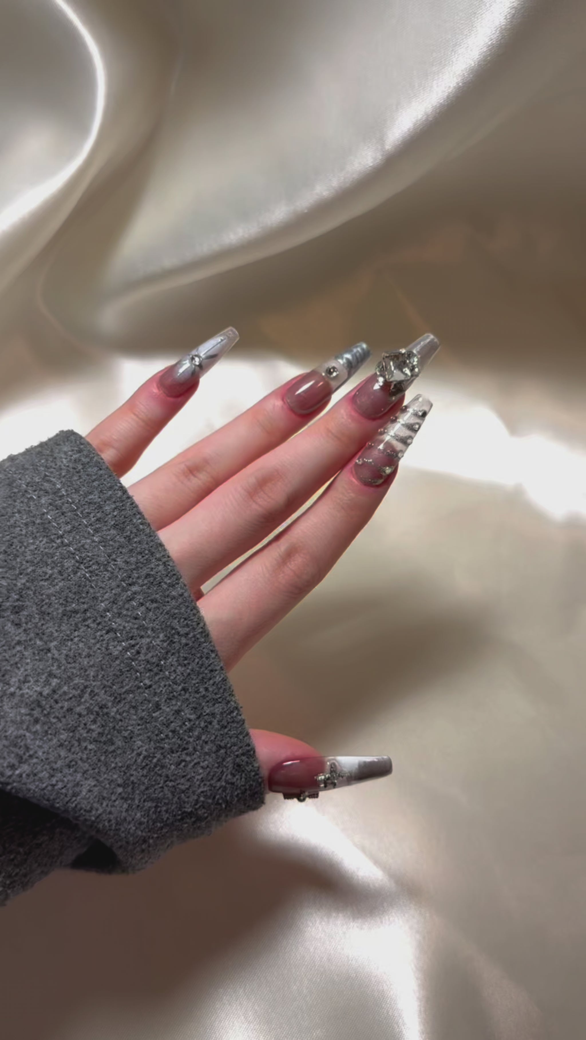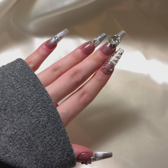 A translucent nude-pink base sets the stage for Diamanté Cobweb, where oversized gemstone rhinestones, star crystals, and silver bead chains create a look of bold sophistication. Metallic French tips and spiral screw details add an industrial-chic edge, while delicate spiderweb motifs glimmer subtly beneath the glossy finish. Perfect for upscale evening events, fashion-forward parties, or anytime you want your fingertips to steal the spotlight.