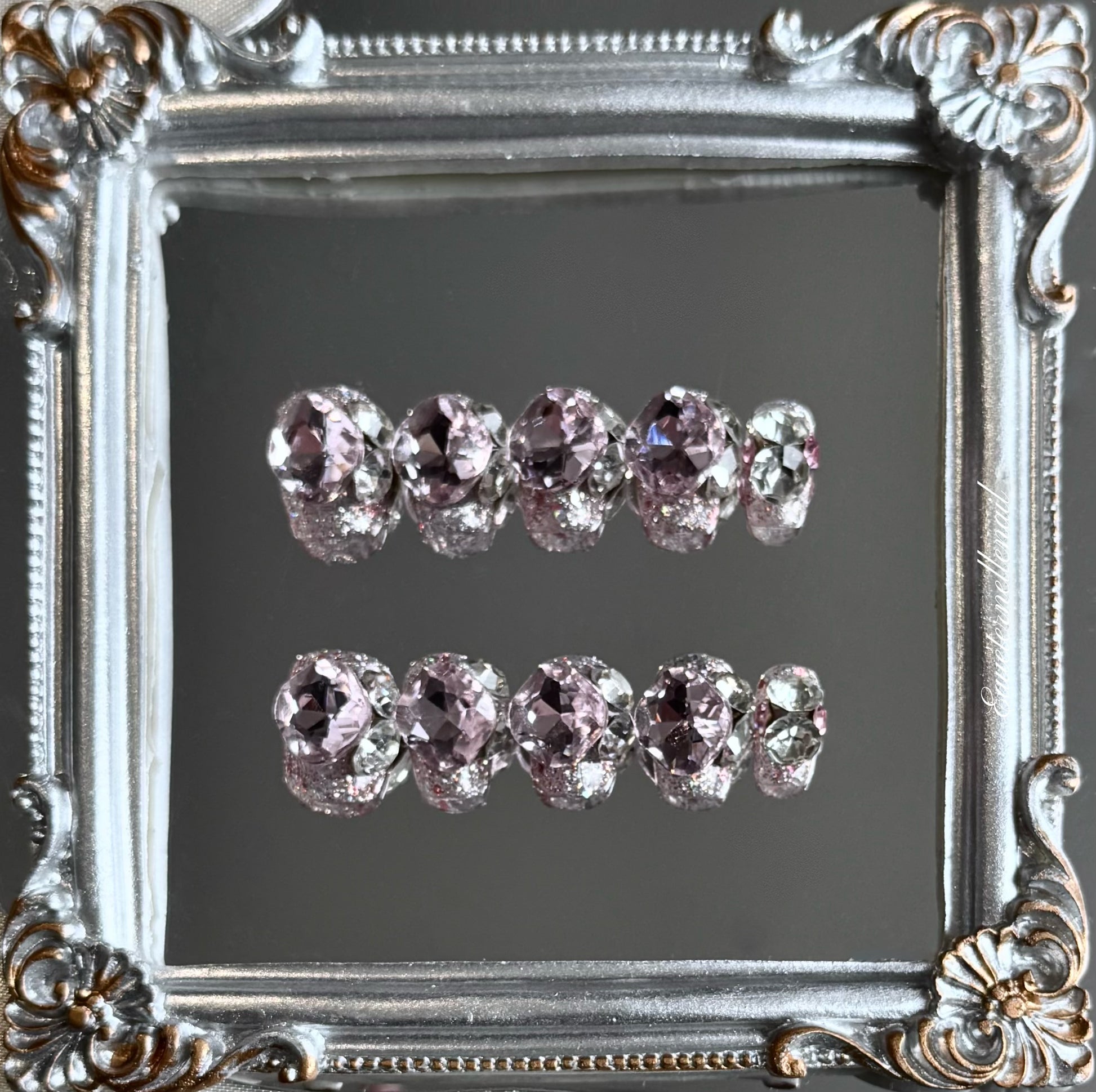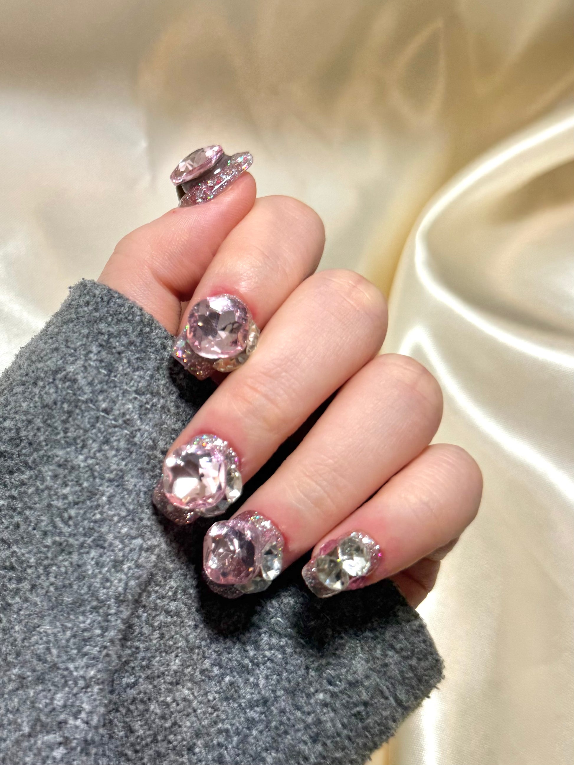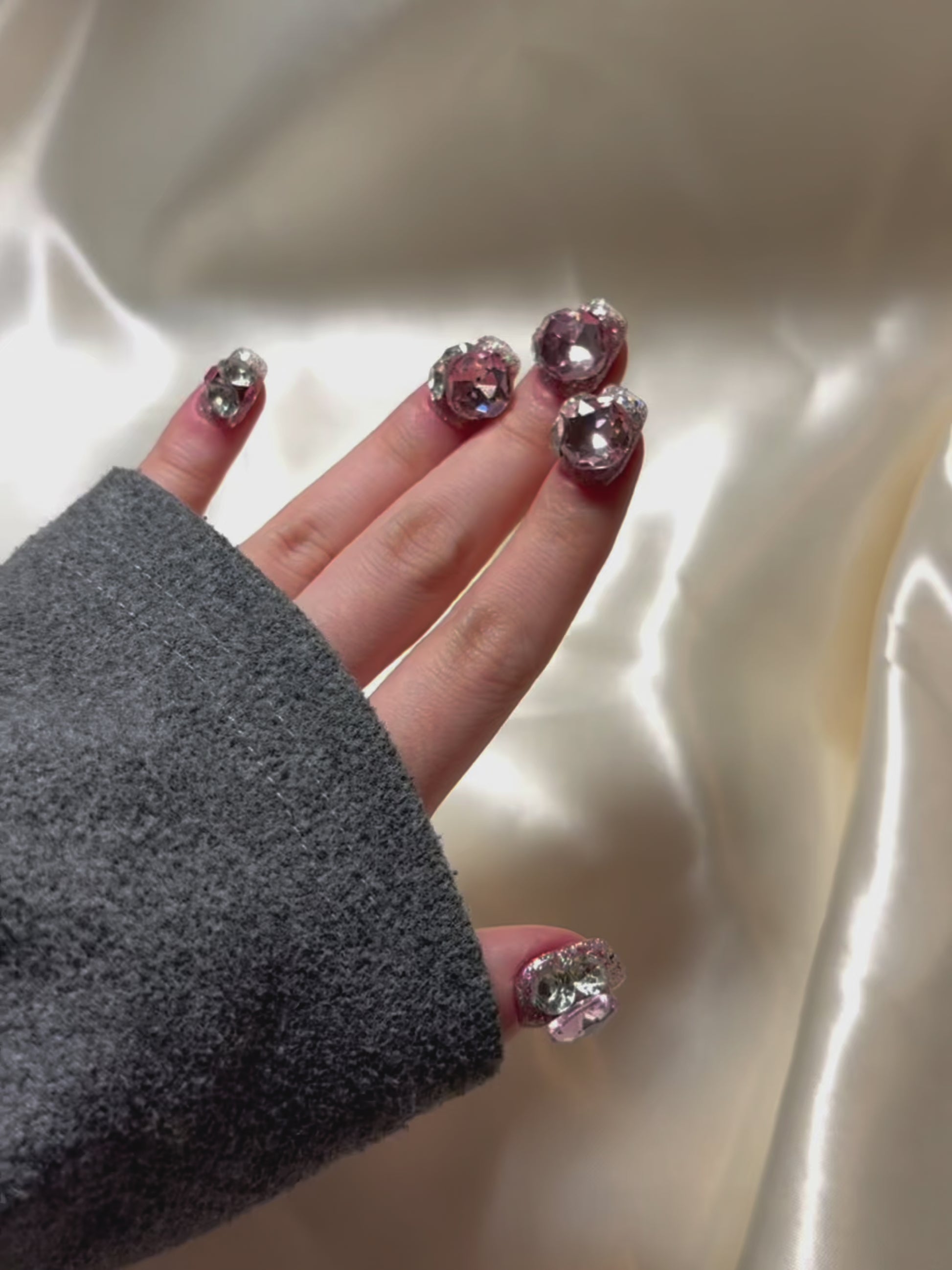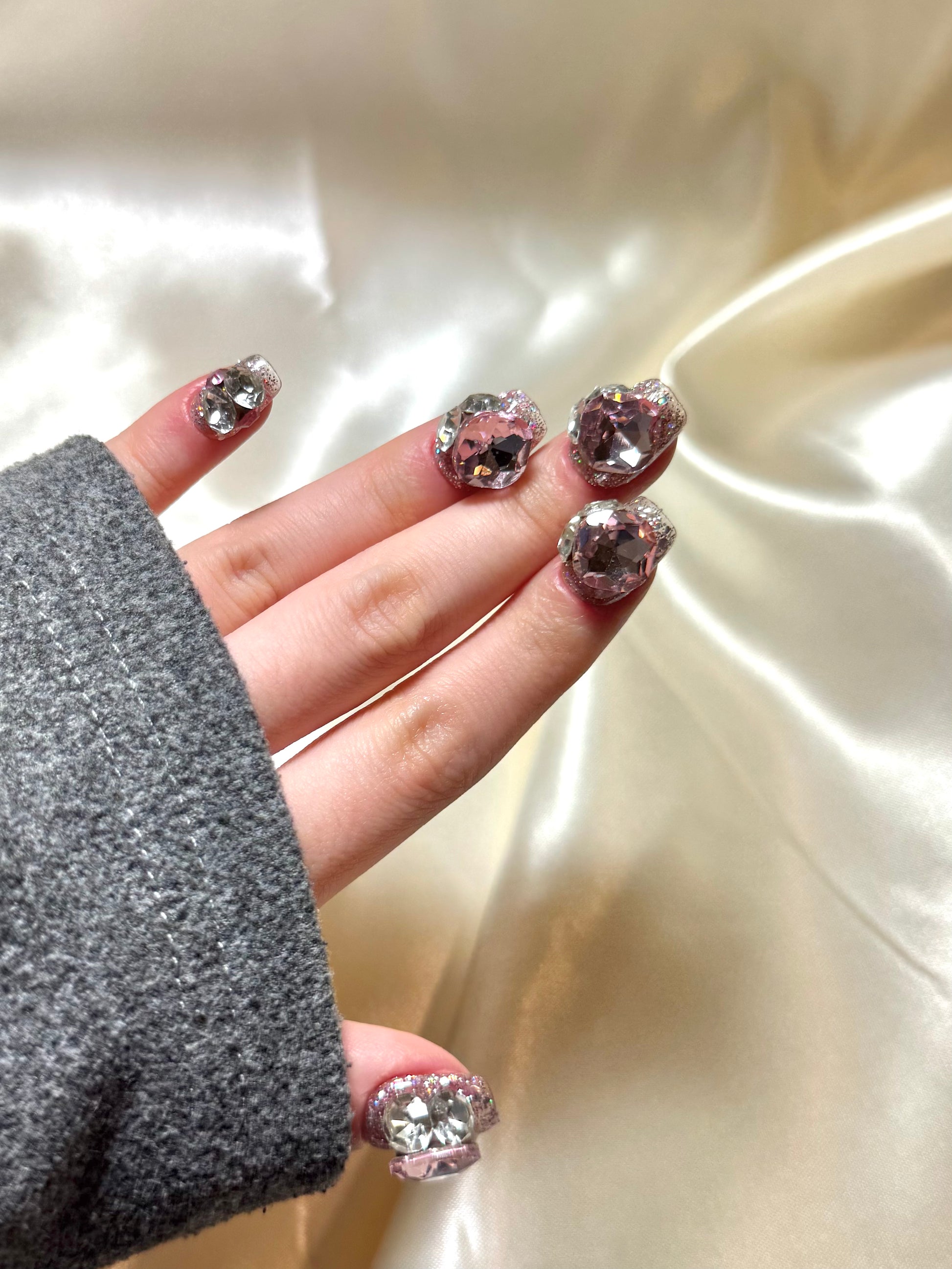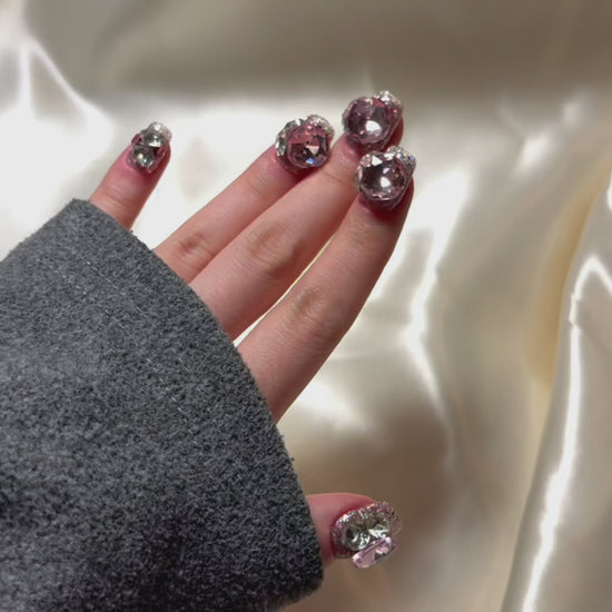 Like a miniature stage set for a dream in blush tones, Diorama Rose invites you into a world where every facet glows. Layered with sculptural pink crystals and clustered clear gems, each nail captures light with theatrical brilliance, as if frozen mid-curtain in a glittering ballet. The full crystal encrustation sits atop a soft pink-toned base, evoking vintage glamour without losing its modern sparkle. This is a look unapologetically extravagant yet exquisitely composed—ideal for formal evenings, fashion-forward events, or any occasion where your hands deserve the spotlight.