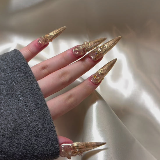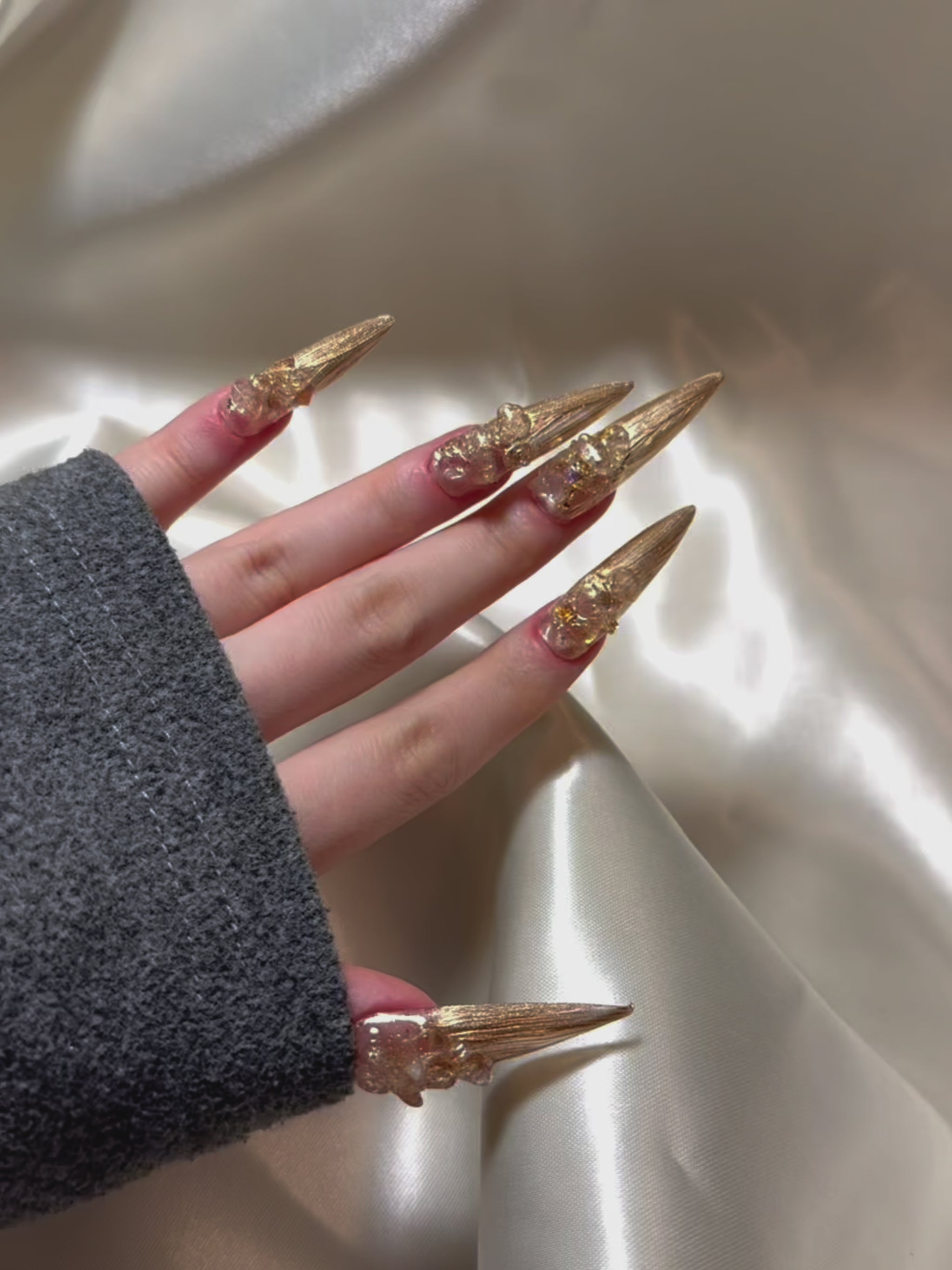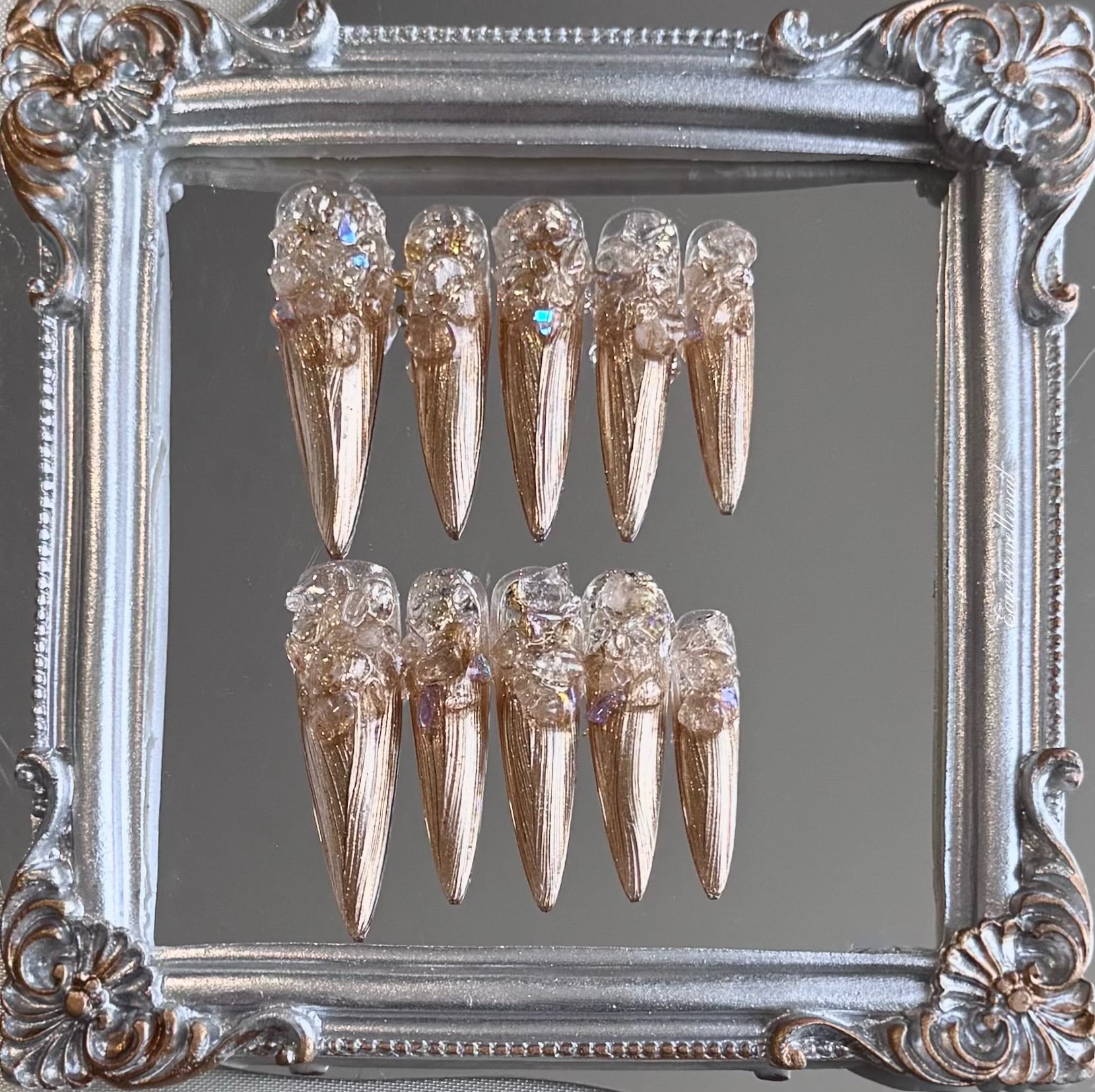 Mystical and radiant, Golden Secret is a stiletto-shaped design featuring high-shine golden mirror tips with a brushed metal texture. The upper portion of each nail is adorned with clustered 3D clear crystals and gold foil accents, creating a striking contrast between solid metallic and gem-like transparency. The embellishments reflect light from every angle, offering a luxurious, dimensional effect that feels like wearable jewelry. Best suited for glamorous evenings, photoshoots, or celebratory occasions where drama and elegance are welcome.