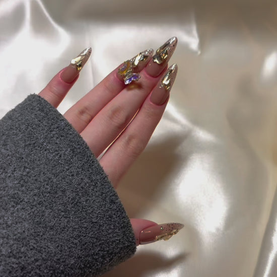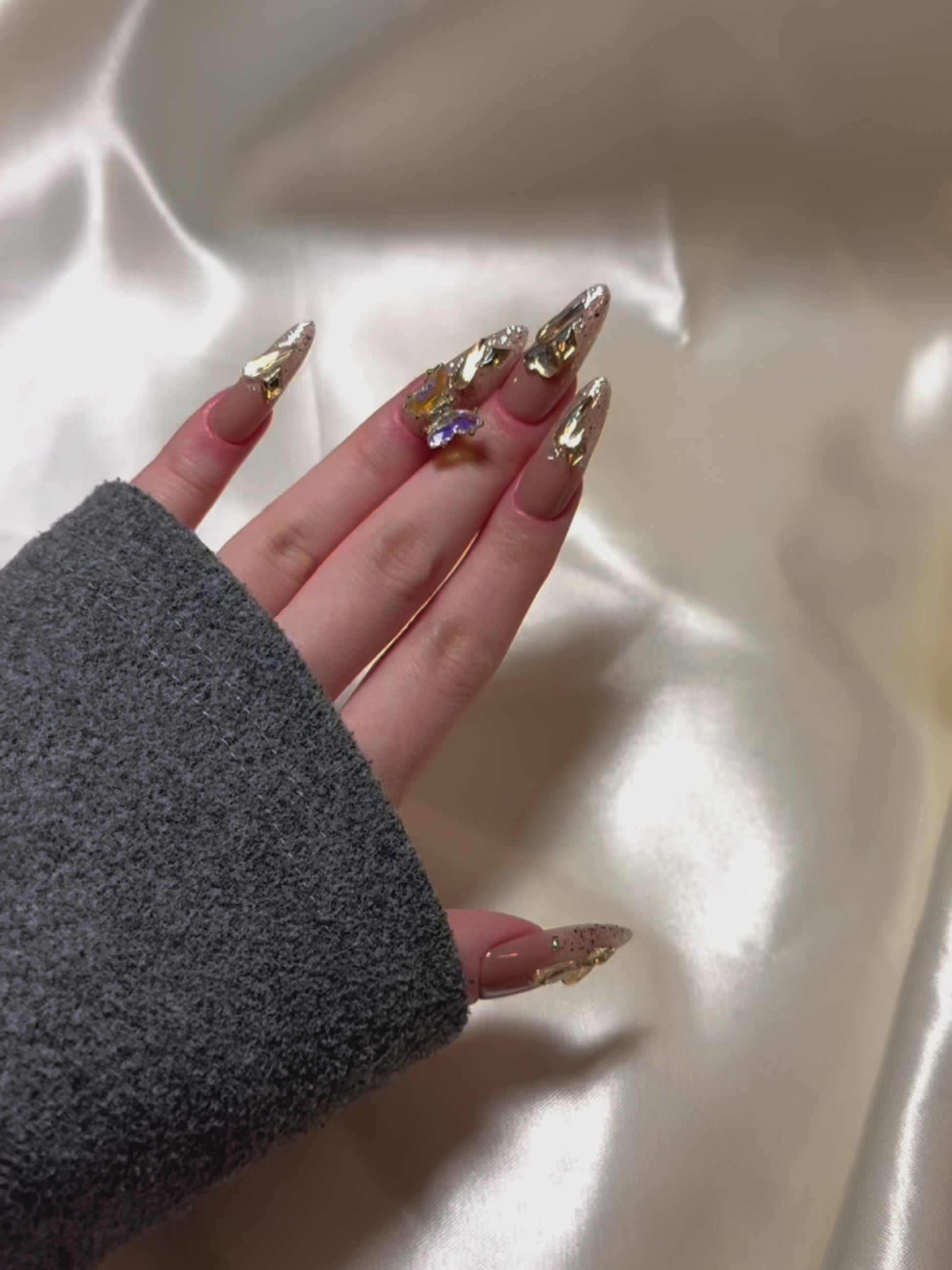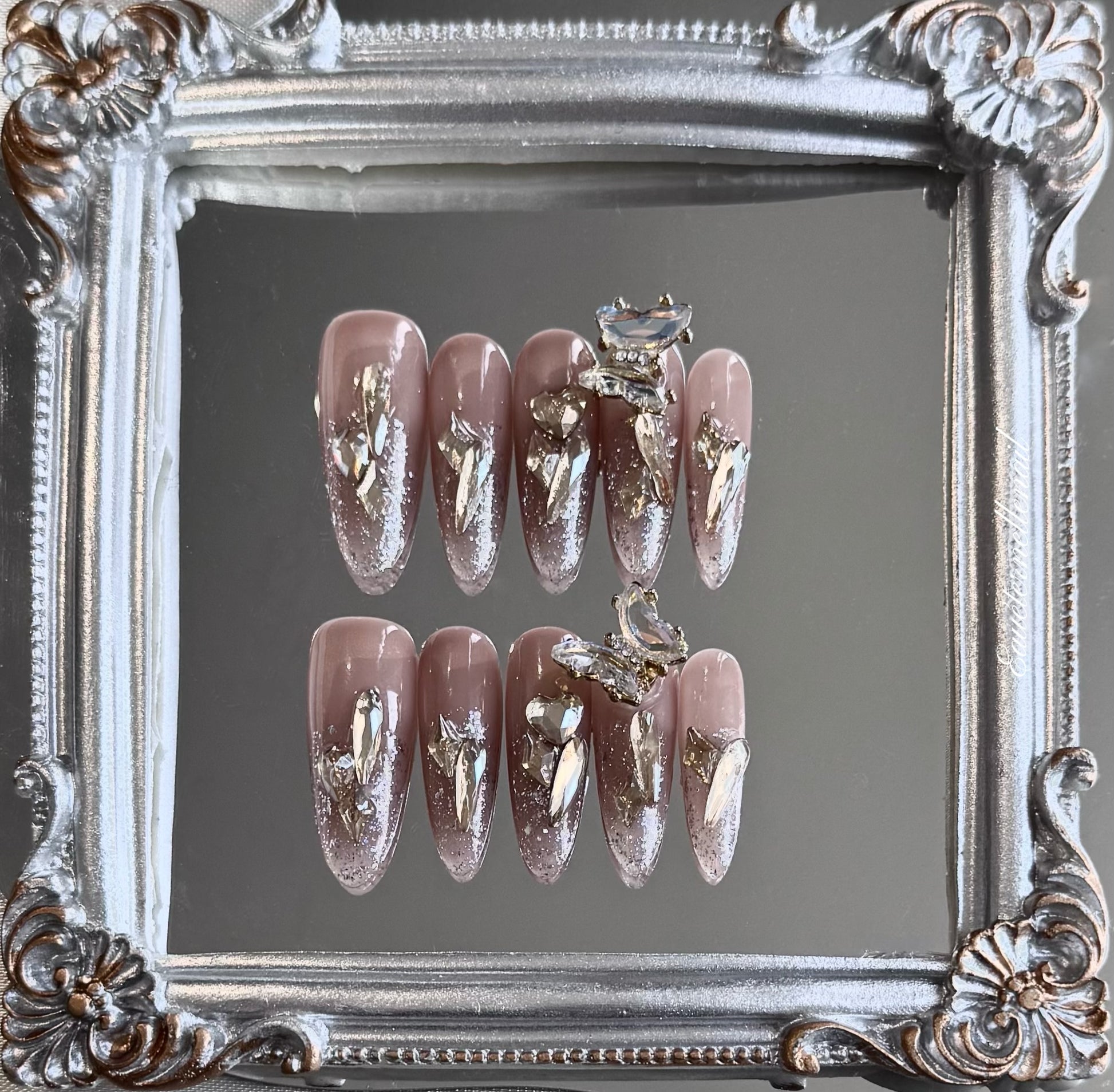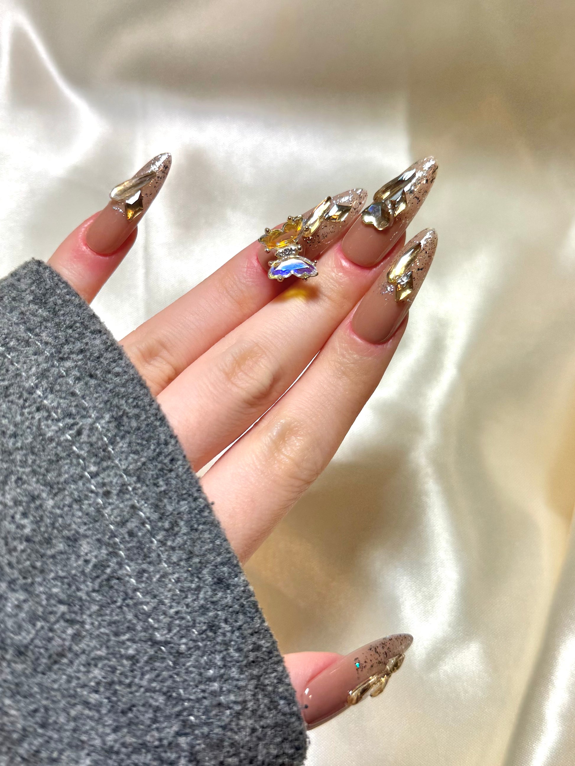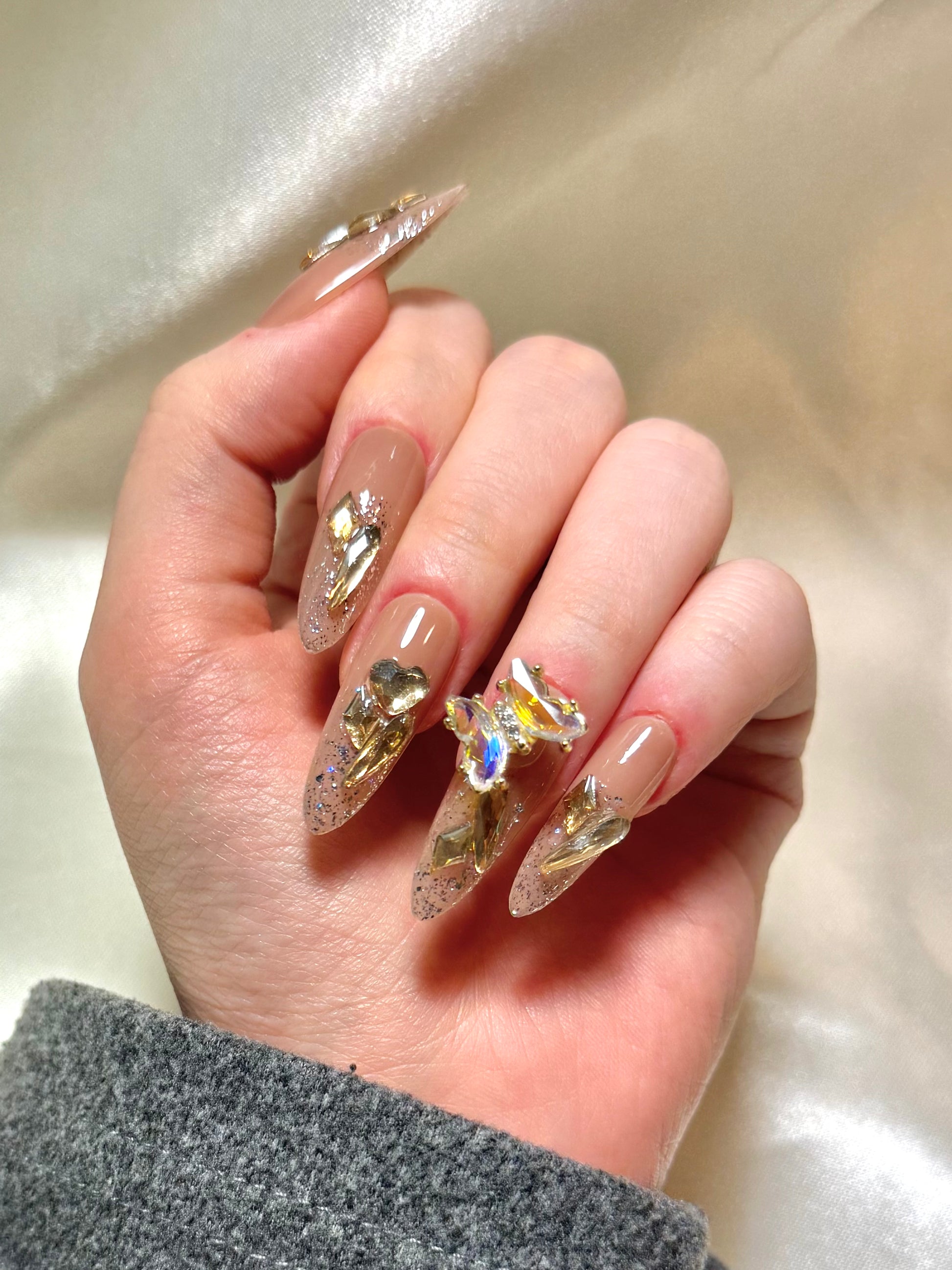 Elegant with a hint of whimsy, Innocent Freedom blends a dark nude base with a glittering ombré effect on medium oval nails. At the heart of the design lies a rare, rotating butterfly-shaped diamond—an eye-catching kinetic accent that brings this look to life with every movement. Paired with angular gold crystals and reflective shimmer, this dynamic centerpiece adds an elevated touch of fantasy. Ideal for date nights, birthday celebrations, and elegant soirées where charm meets individuality