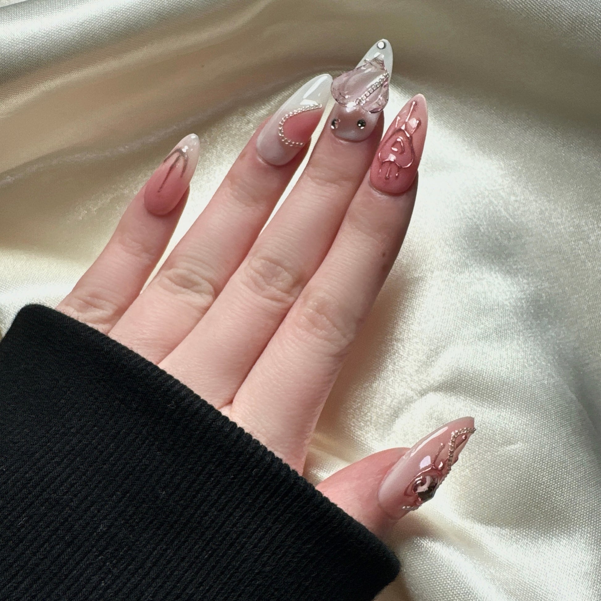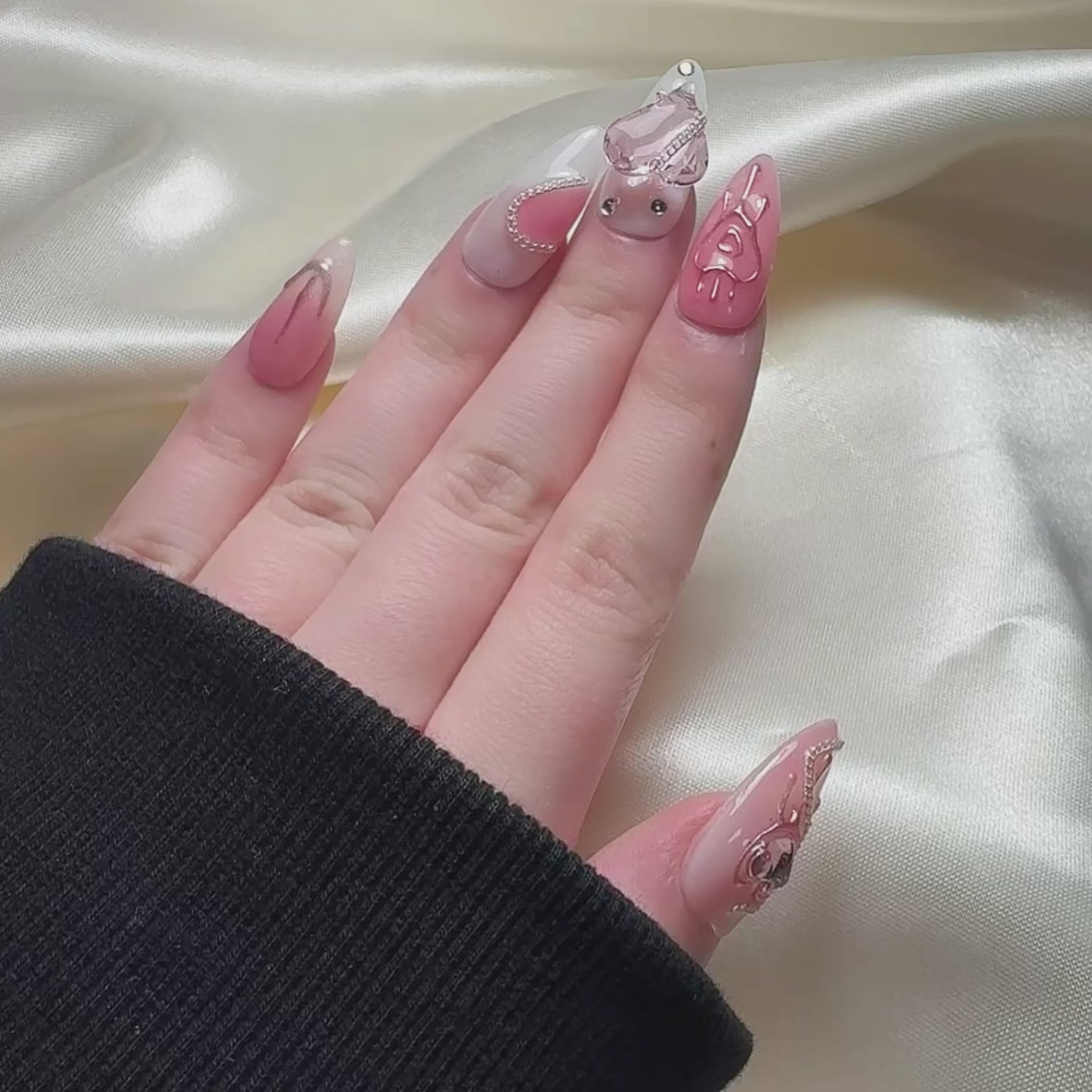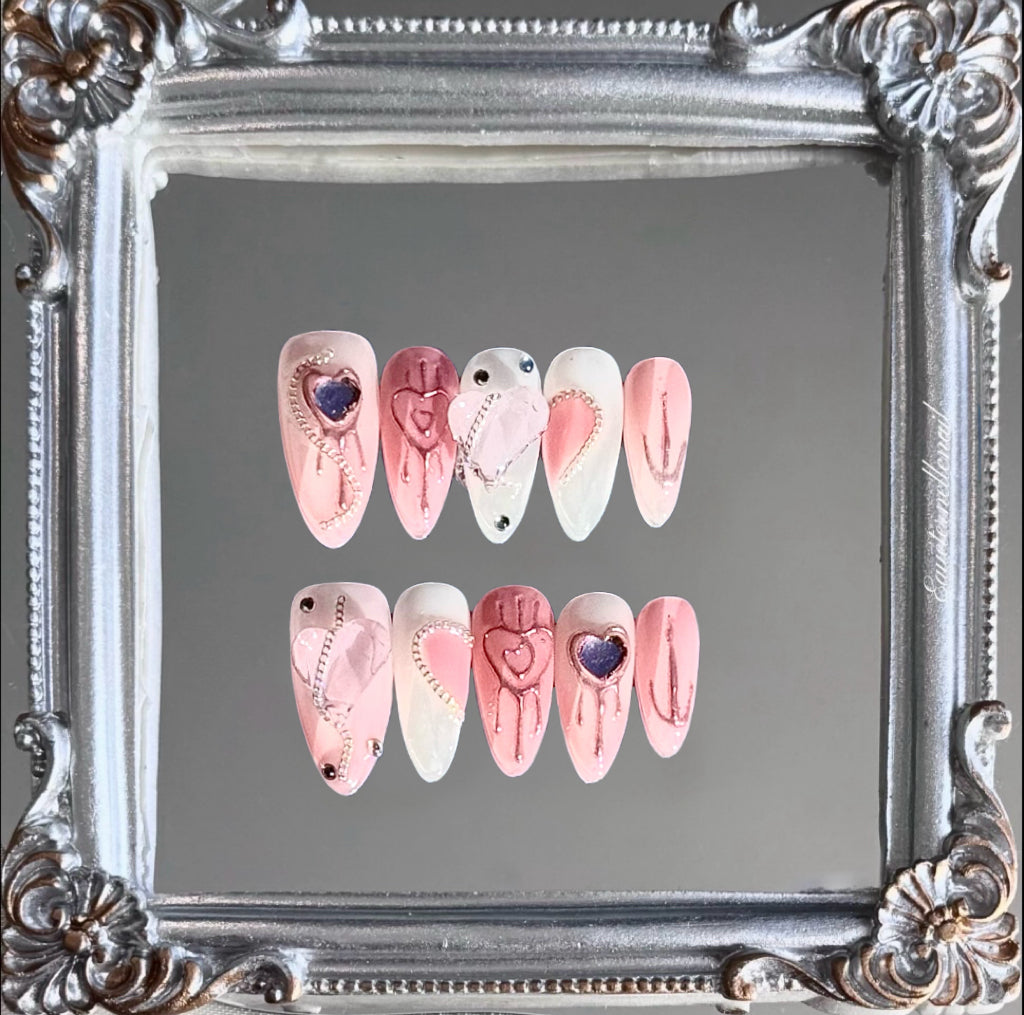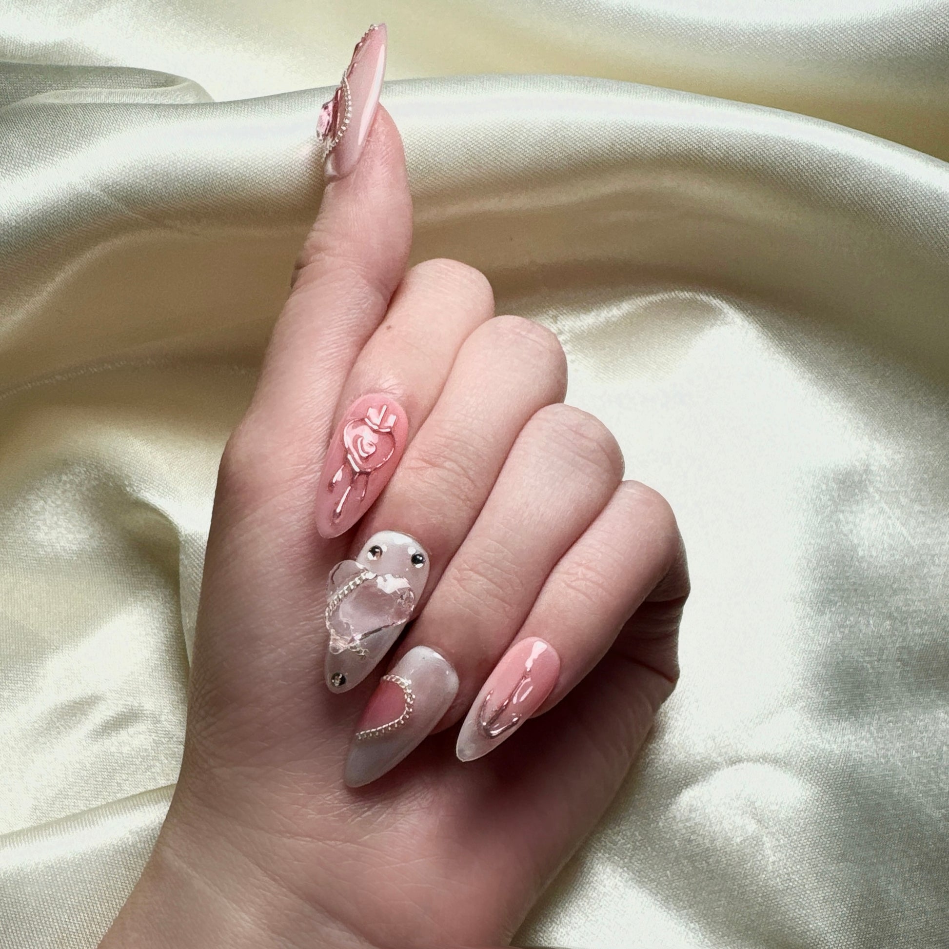 Charming yet commanding, Locked in Love blends blush pink, milky white, and bold chrome accents into a romantic rebellion. Each medium almond-shaped nail features sculpted heart motifs, bubble-like gems, and metallic chains that wind like whispered secrets across the surface. The design is both playful and intense — soft candy tones meet bold 3D textures, creating a wearable love letter with an edge. This set is perfect for Valentine’s Day, anniversary dinners and romantic date nights.