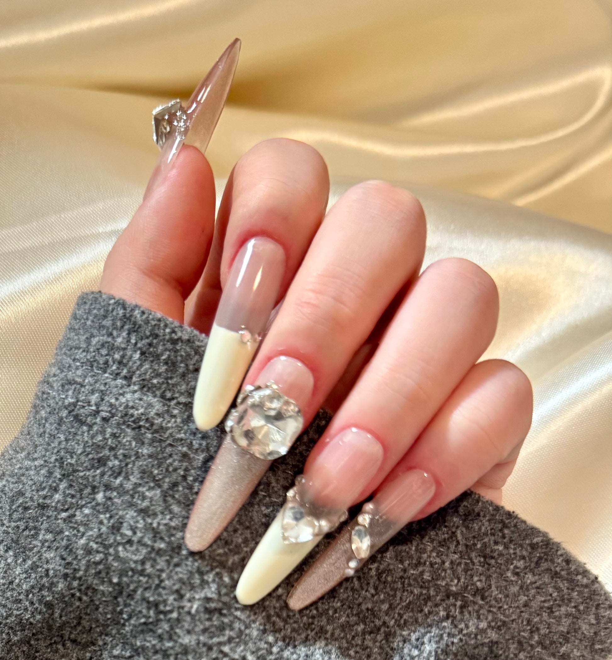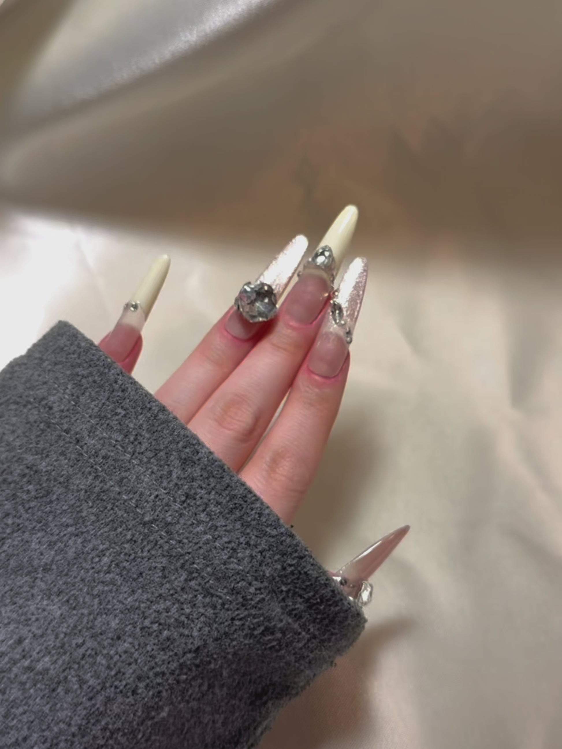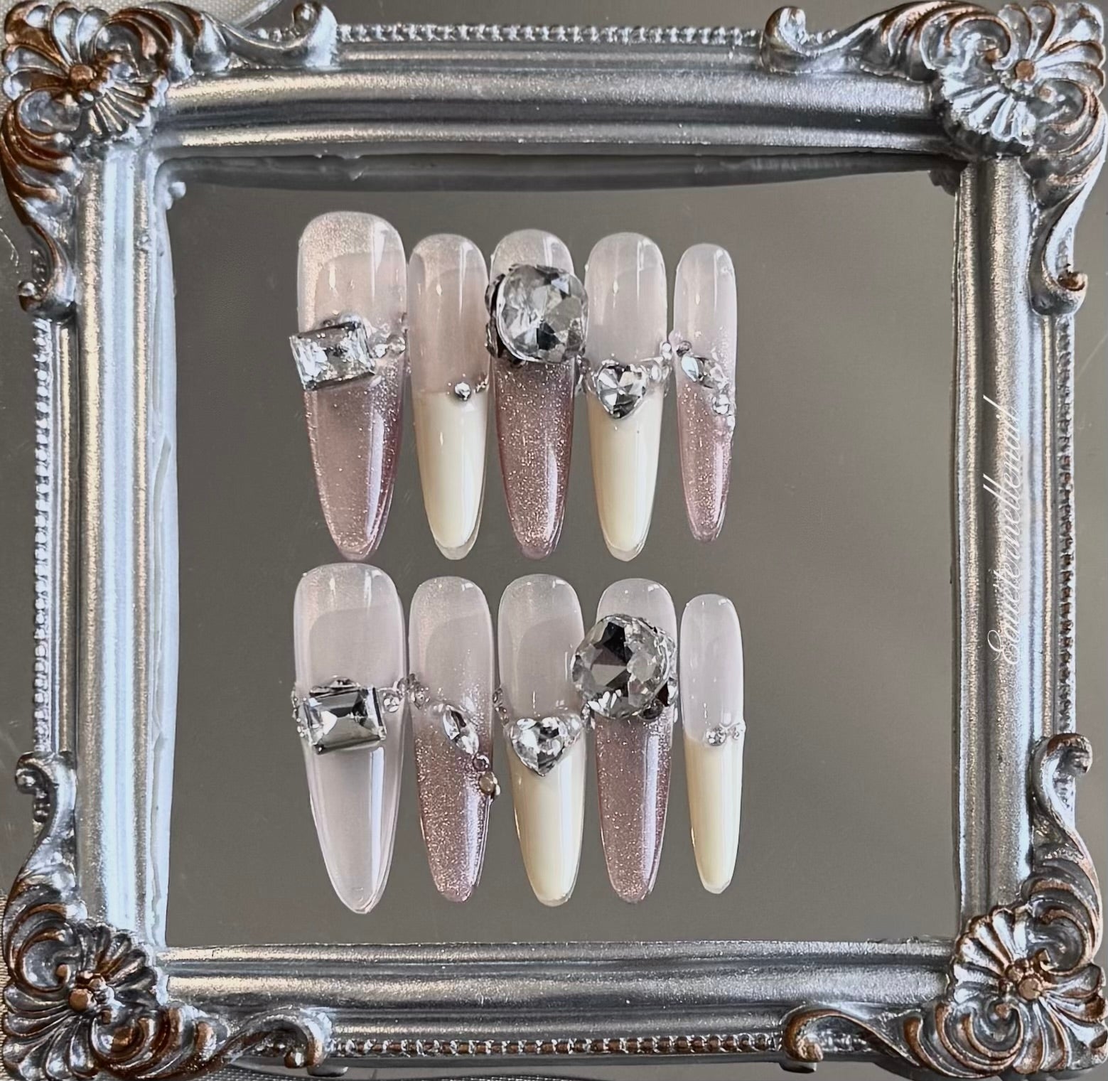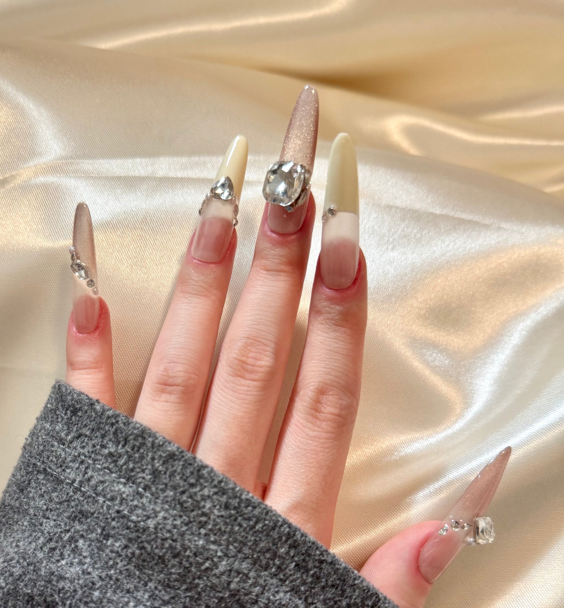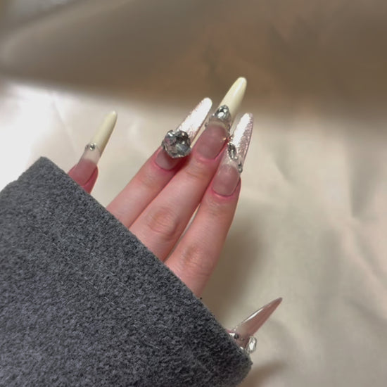 Modern and luminous, Opal Whisper features a translucent nude base paired with soft pink cat eye accents and creamy white French tips. The oval-shaped nails are elevated by oversized diamond and pearl embellishments, adding a radiant touch without overwhelming the design. Subtle yet sophisticated, this set brings a soft-focus glow to your look — perfect for garden parties, bridal showers, or elegant daytime events where polished charm speaks louder than words.