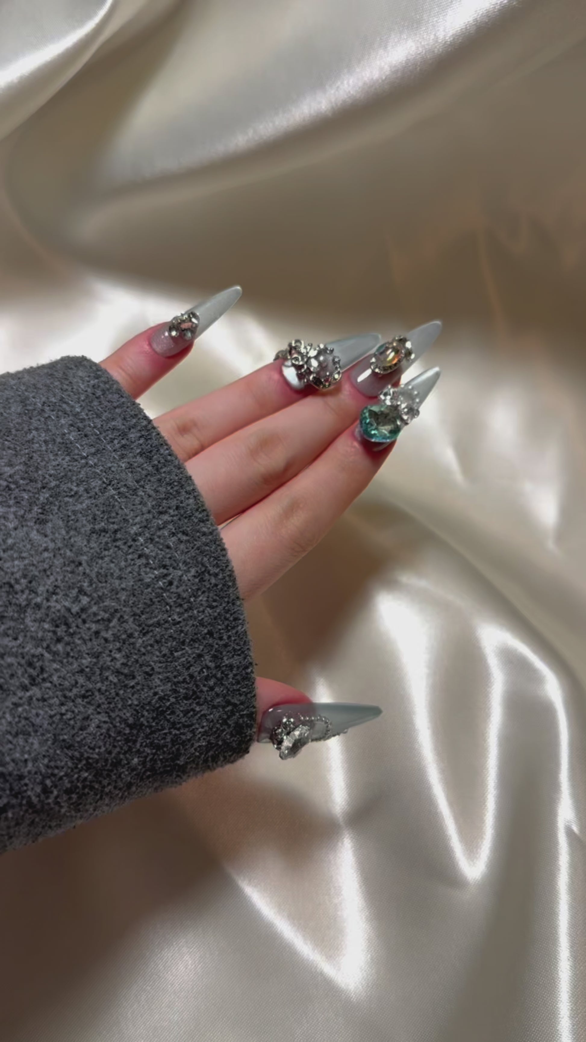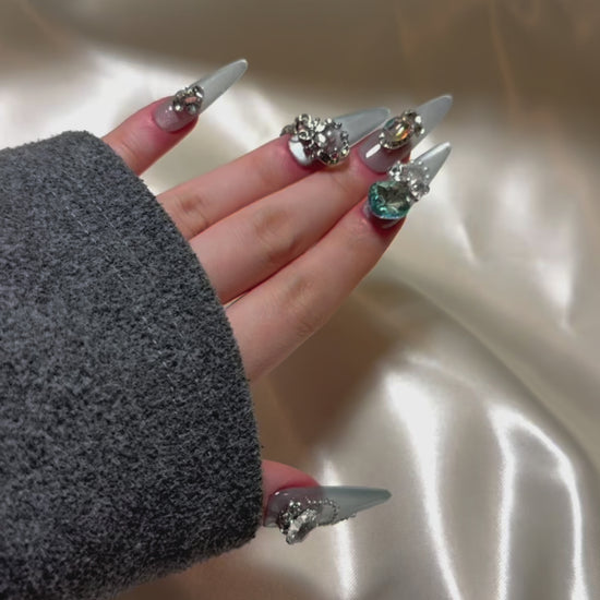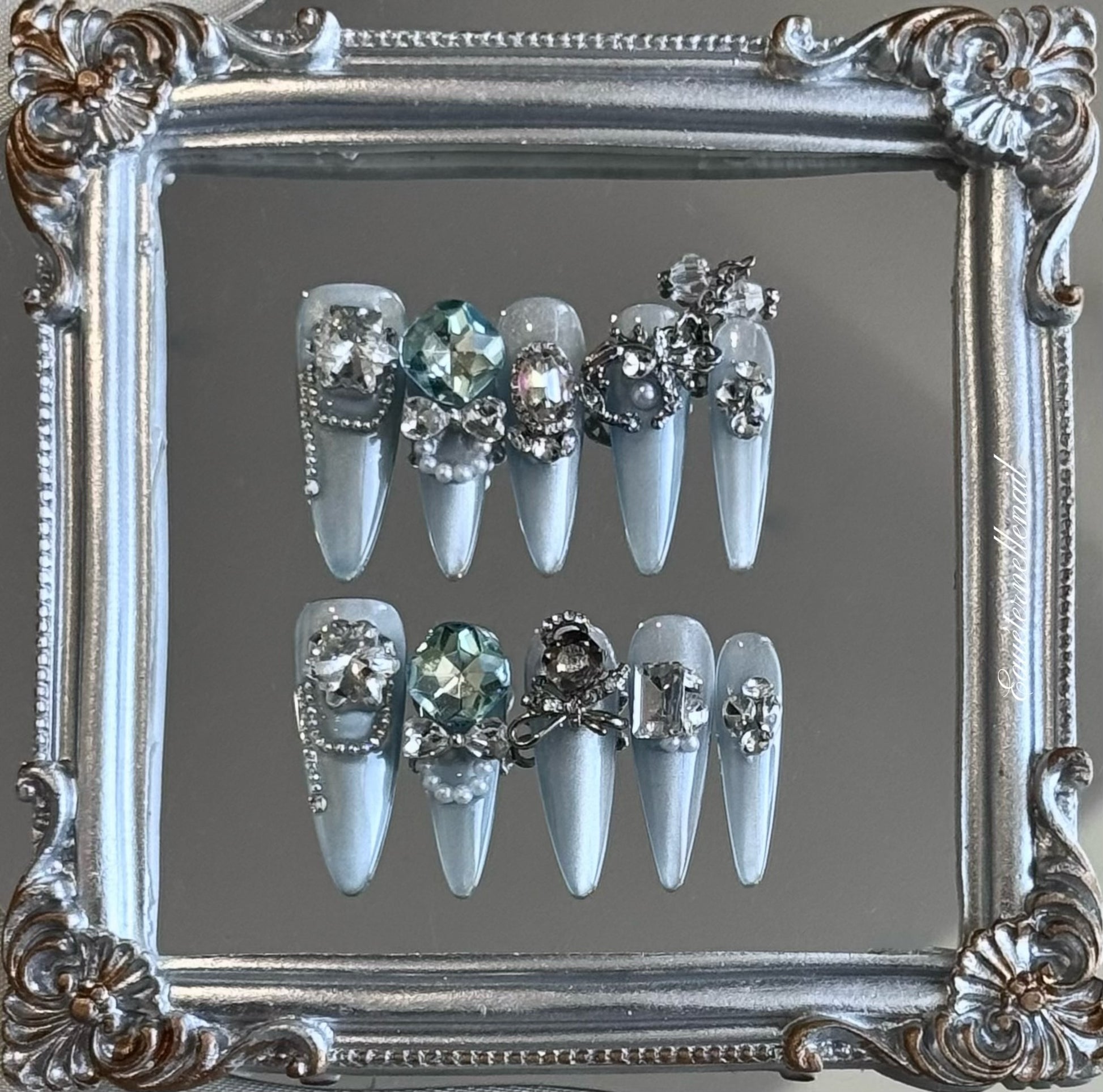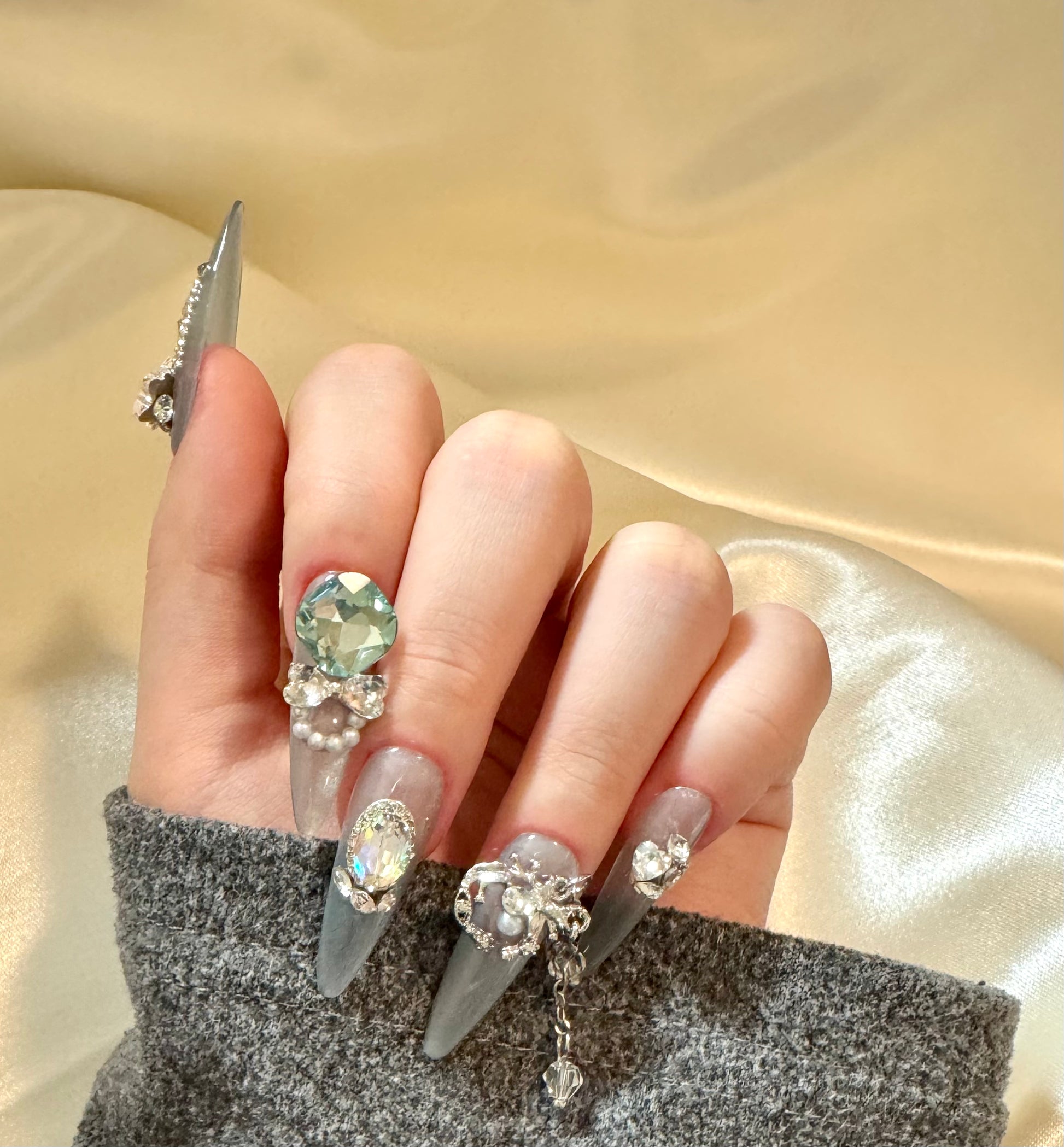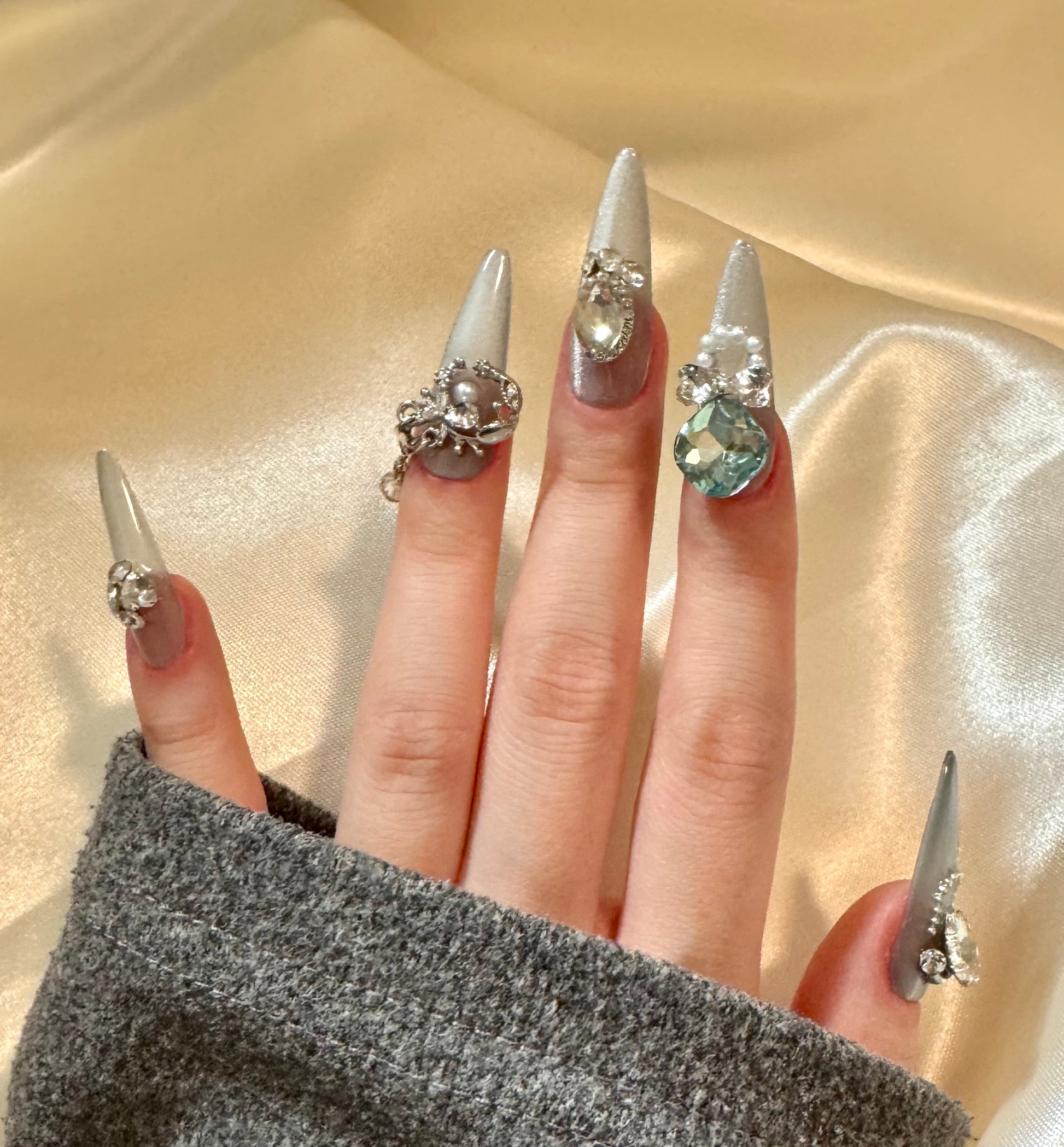 Sleek and luminous, Ornate Mist glows with an ethereal bluish-gray cat eye sheen, sculpted into a long stiletto silhouette. Each nail becomes a miniature sculpture, layered with oversized rhinestones, soft pearl details, and icy gemstones. A silver bow and delicate chain accents add a touch of antique charm to the futuristic shimmer. The balance of bold sparkle and fine embellishment creates a look of contemporary grandeur — poised yet opulent, like mist gilded in moonlight. Perfect for winter galas, upscale evening events, or any occasion that calls for soft drama with high-impact shine.