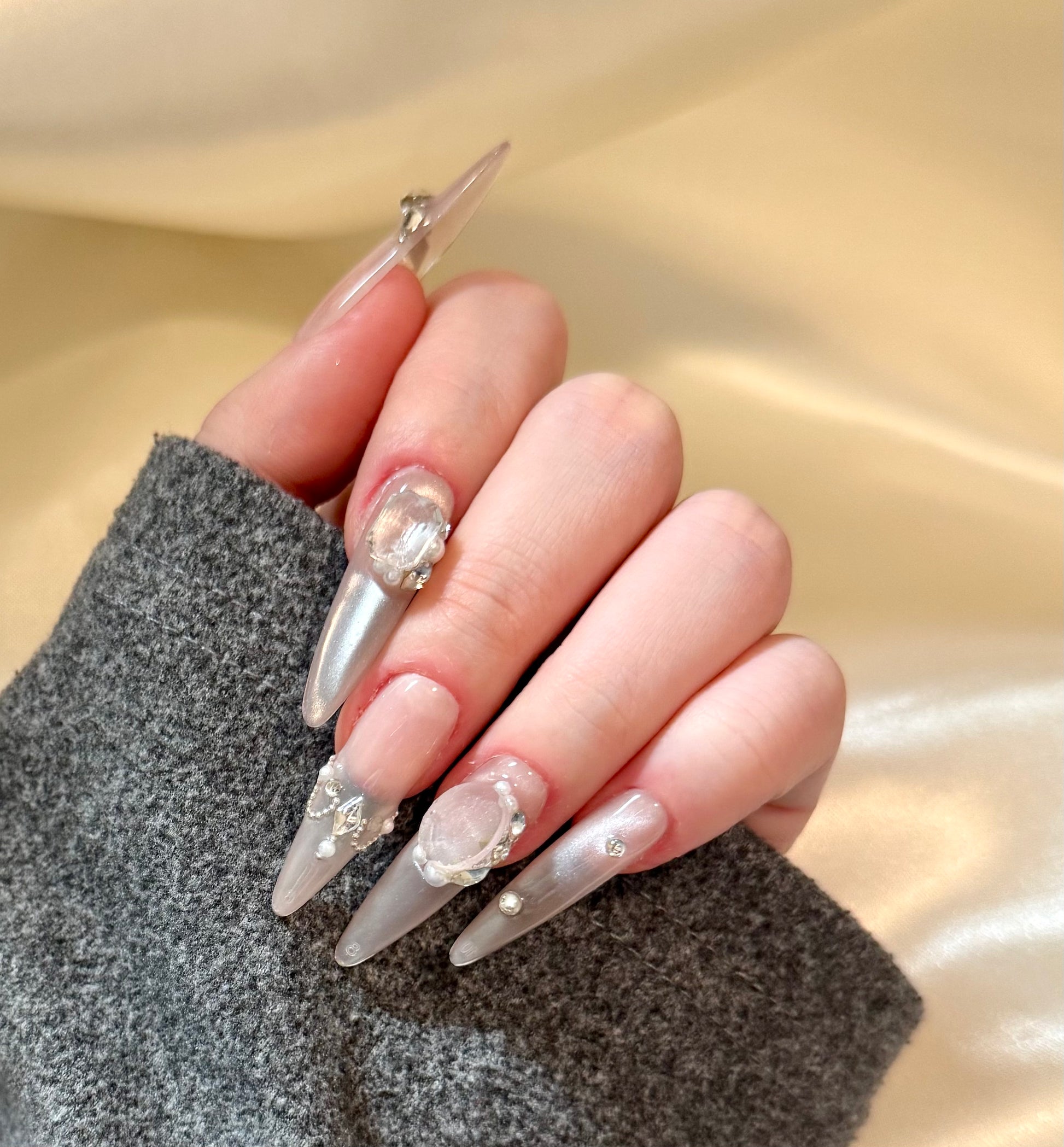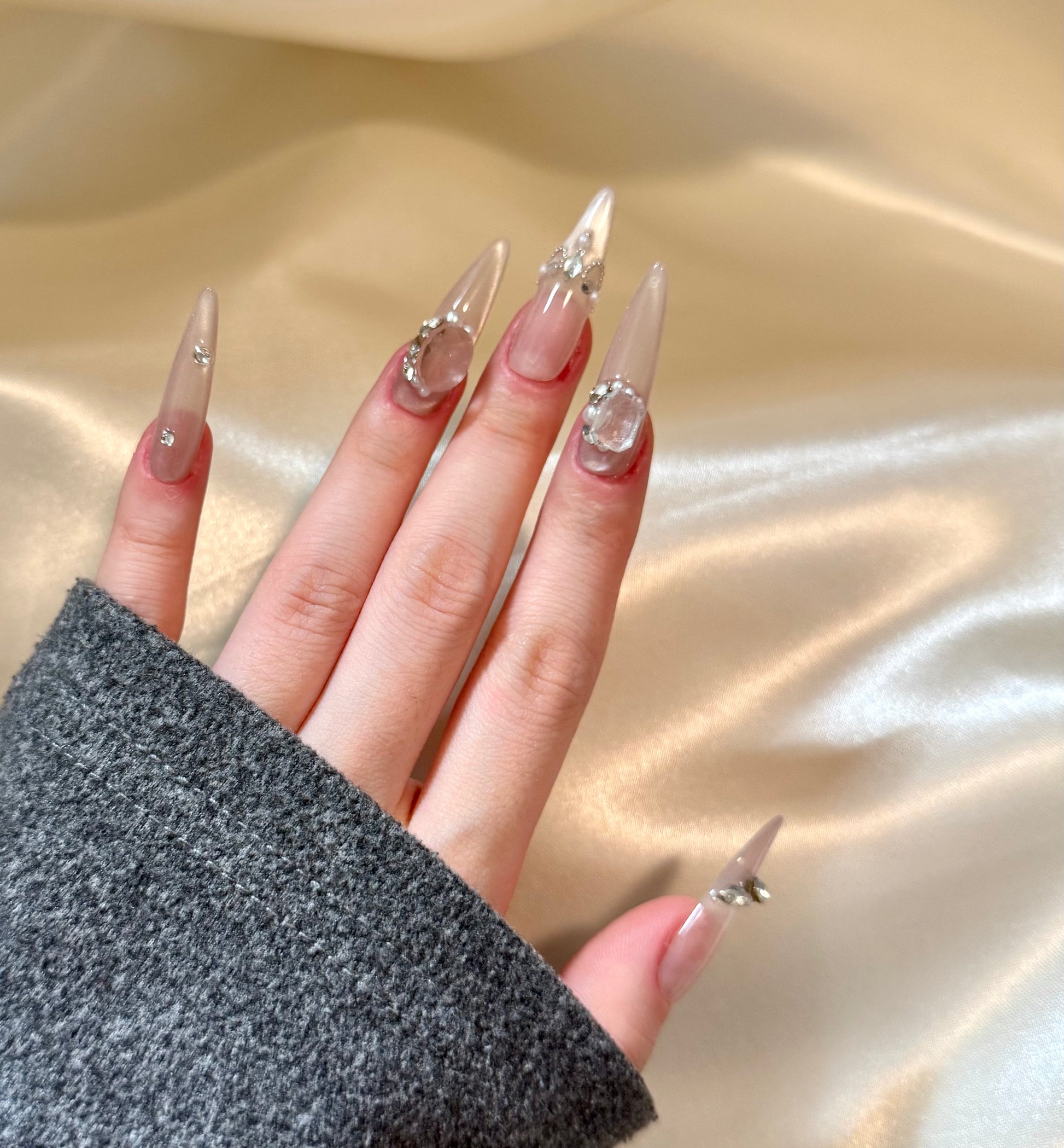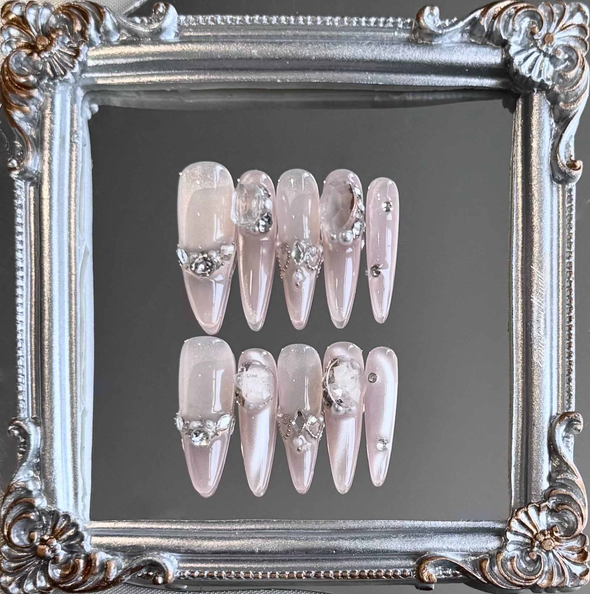 Striking and opulent, Palace Drops features long oval nails with a translucent nude base and side-swept golden cat eye detailing. Finished with metallic beads, rhinestones, and diamonds in a French-inspired layout, this design evokes regal elegance with modern precision. Perfect for formal galas, weddings, high-end dinners, or whenever you want your hands to steal the spotlight.