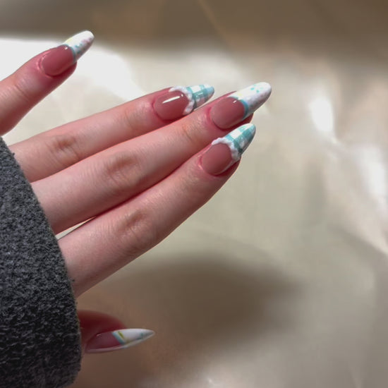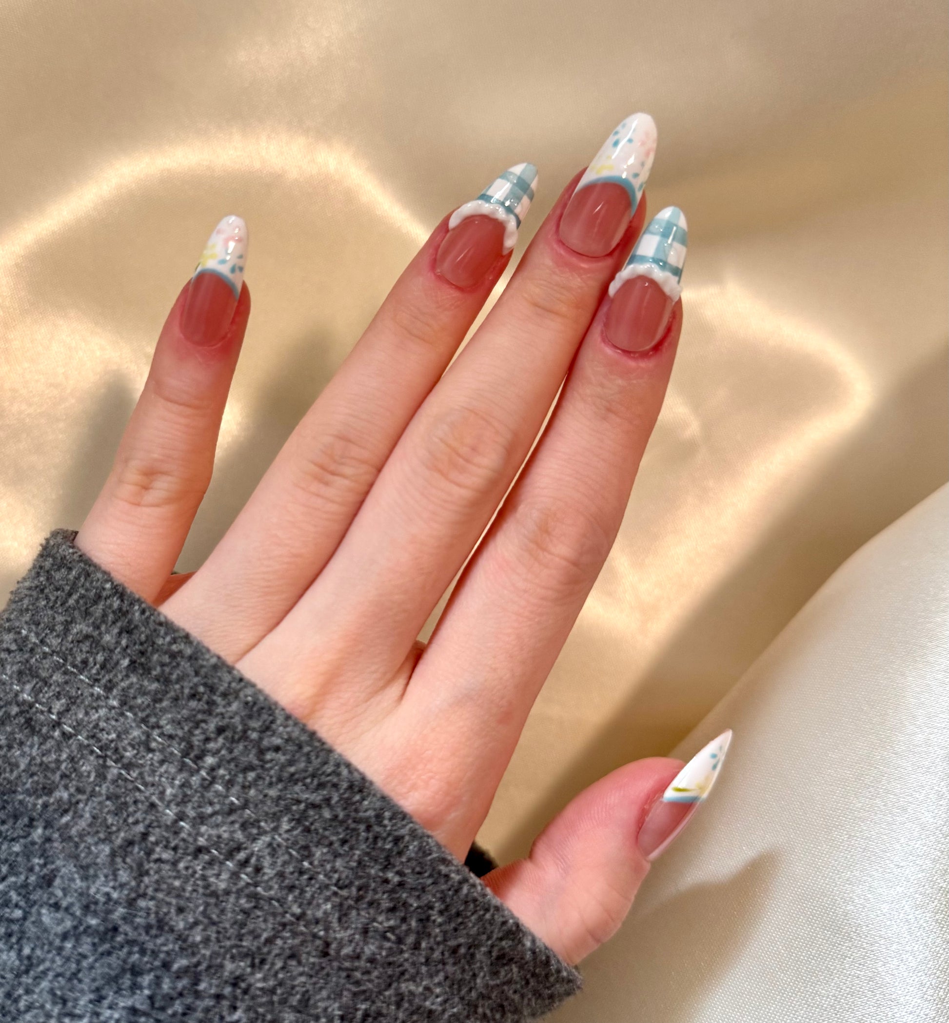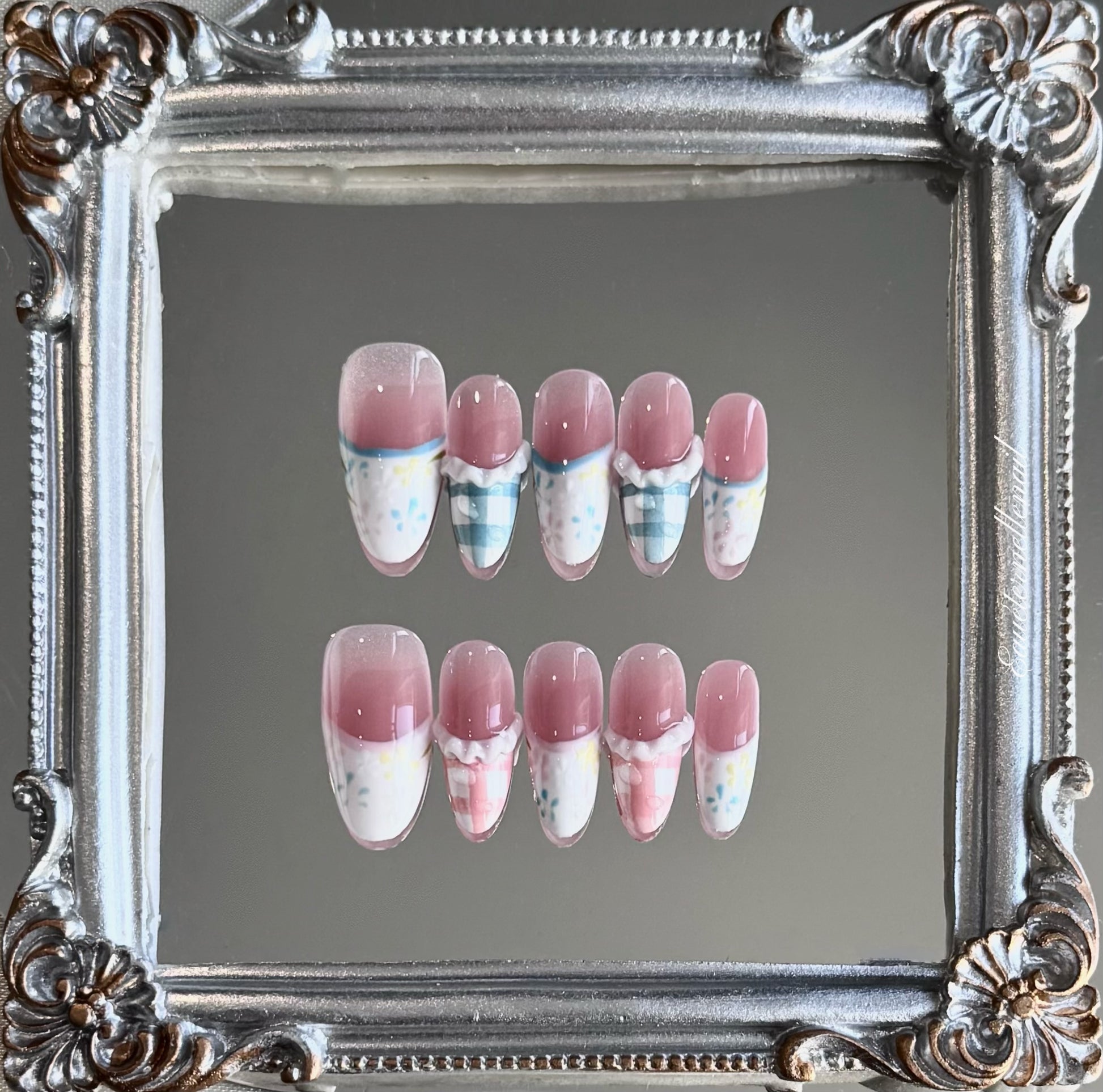Charming and nostalgic, Pastoral Gingham layers ombré nude French tips with hand-painted florals and timeless blue and pink gingham accents. Finished with a scalloped lace border, it channels the warmth of a countryside afternoon. Ideal for spring picnics, weekend brunches, or adding whimsy to everyday looks.