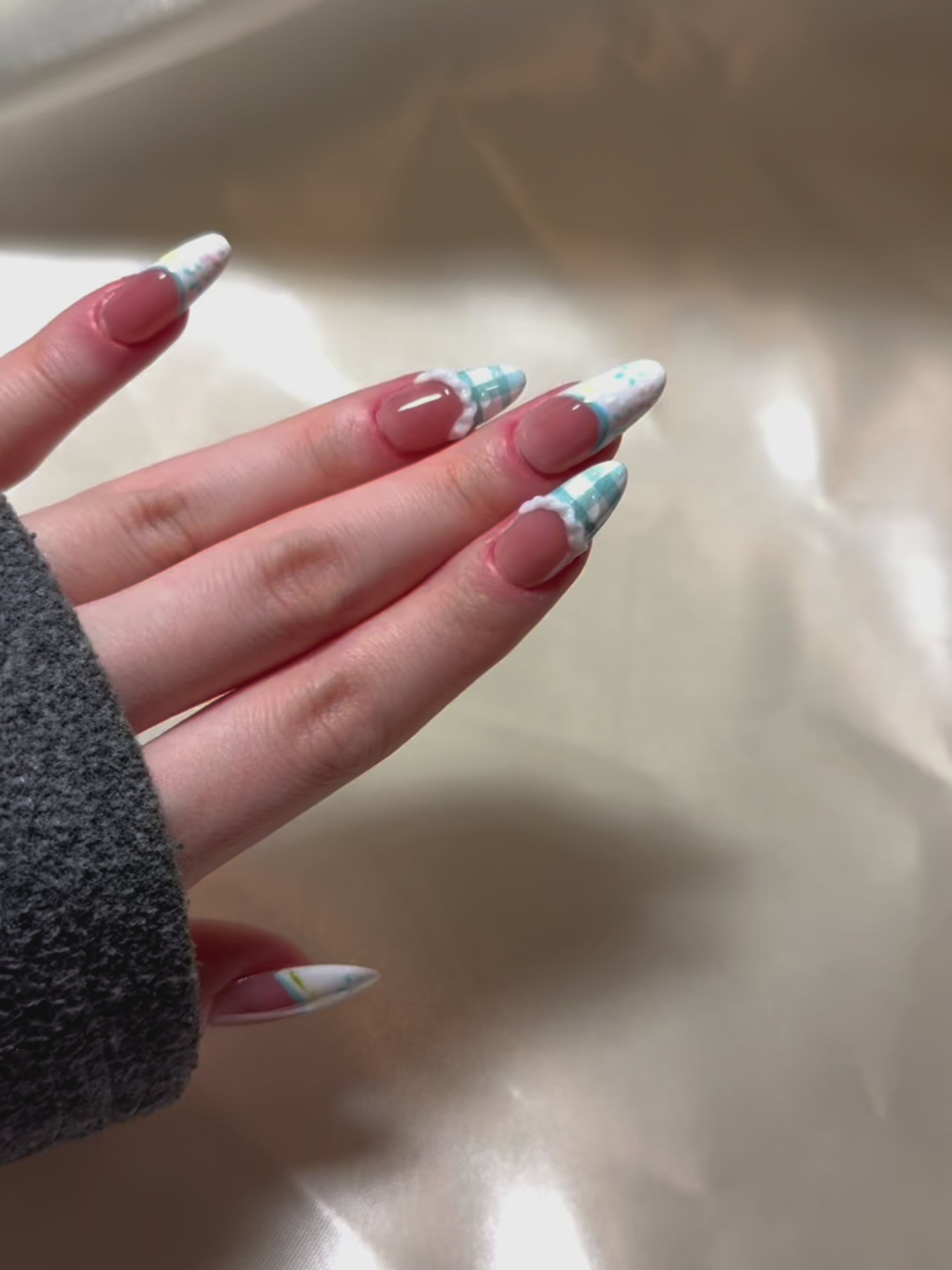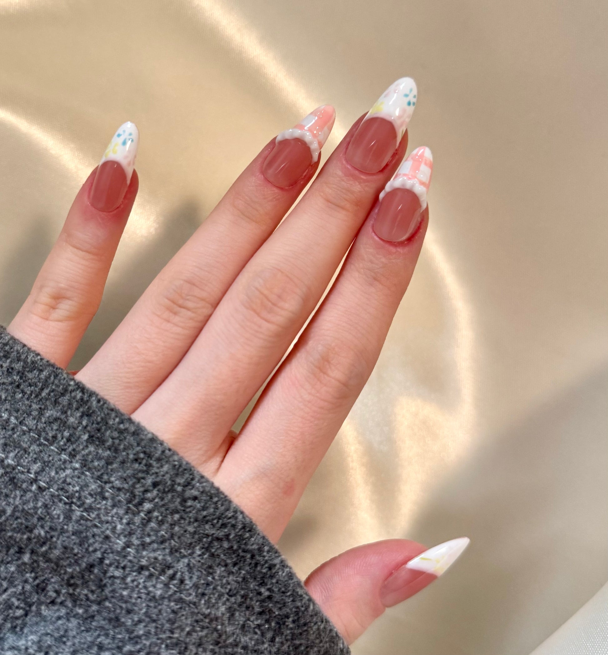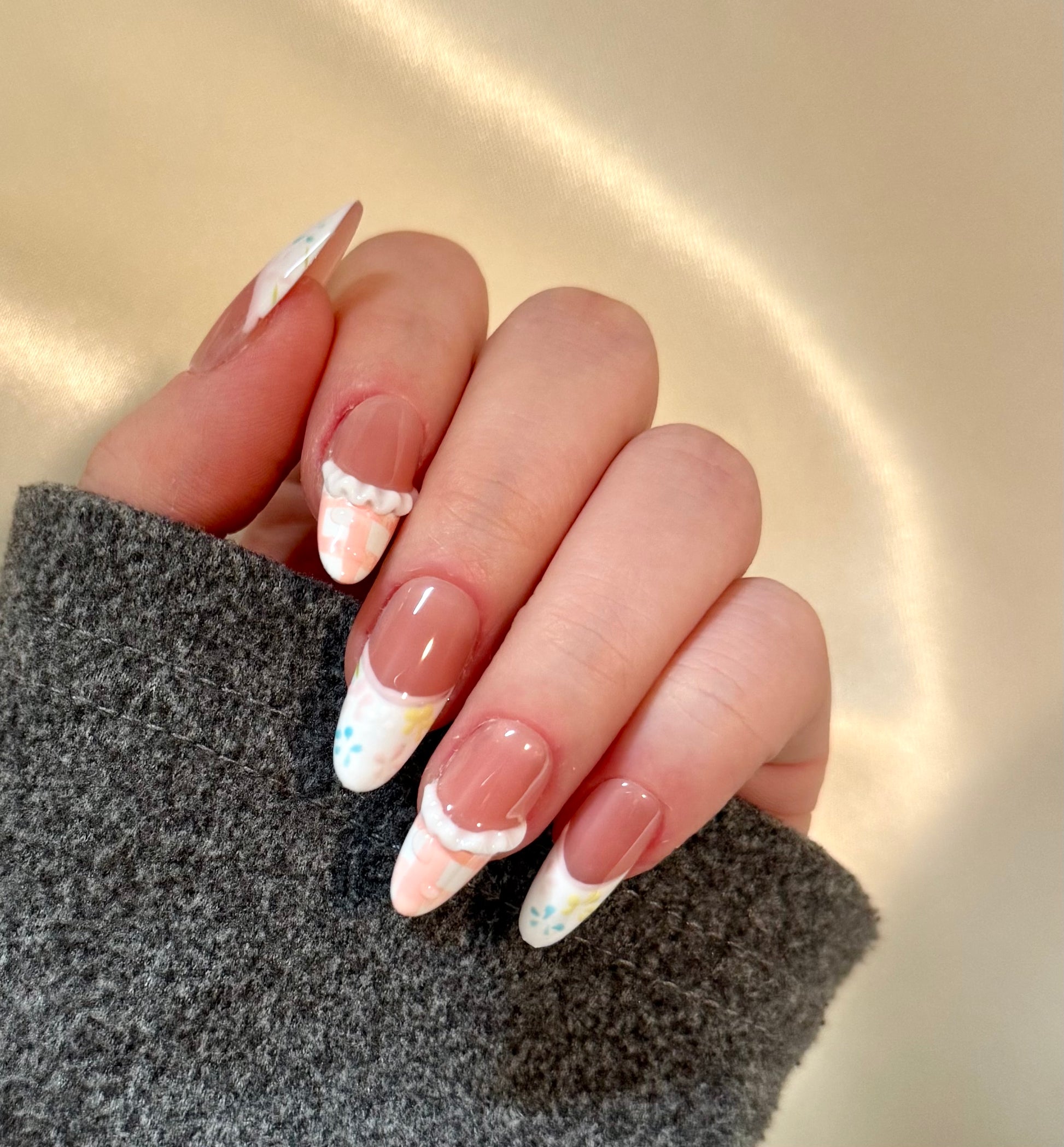 Charming and nostalgic, Pastoral Gingham layers ombré nude French tips with hand-painted florals and timeless blue and pink gingham accents. Finished with a scalloped lace border, it channels the warmth of a countryside afternoon. Ideal for spring picnics, weekend brunches, or adding whimsy to everyday looks.