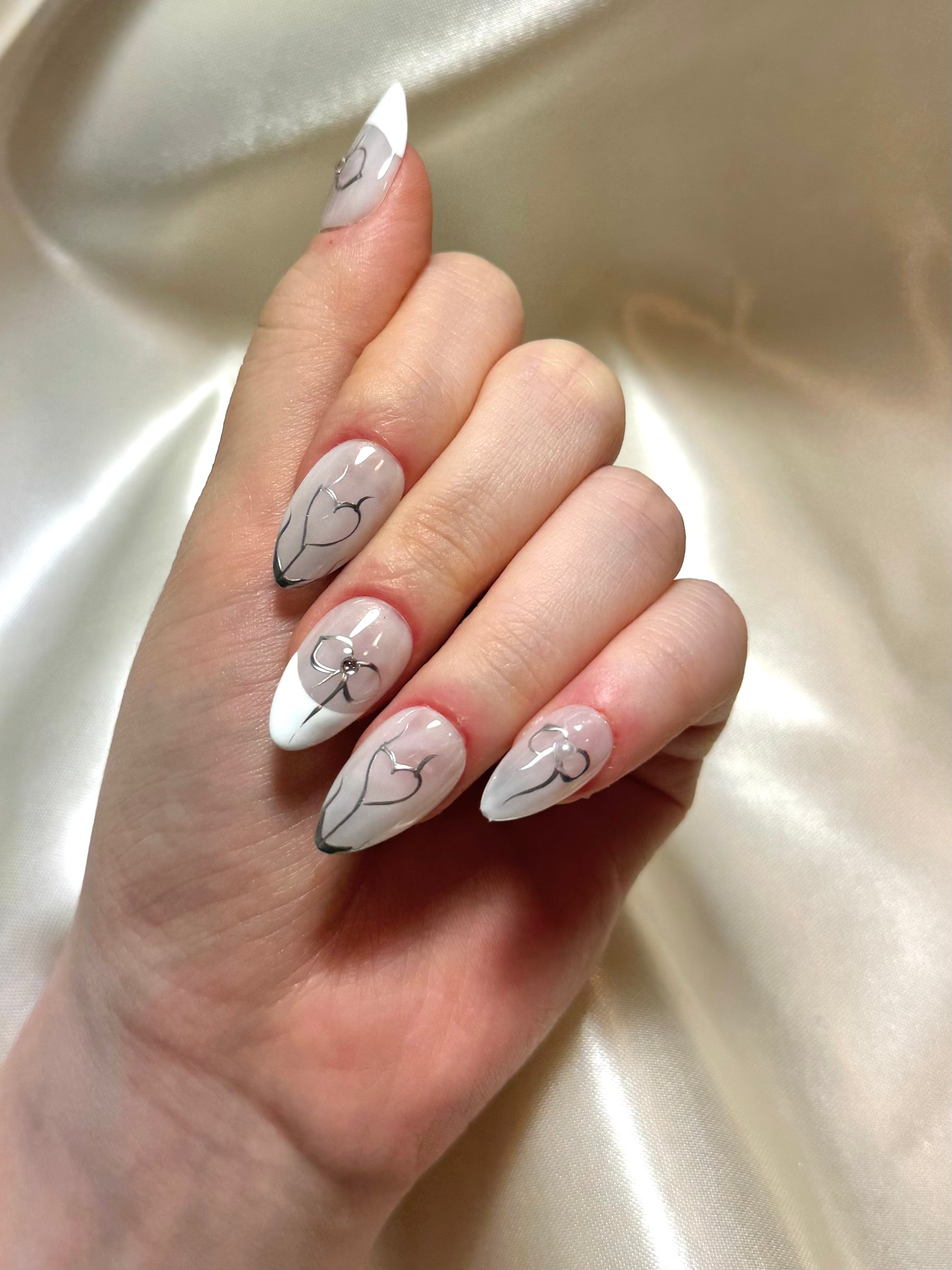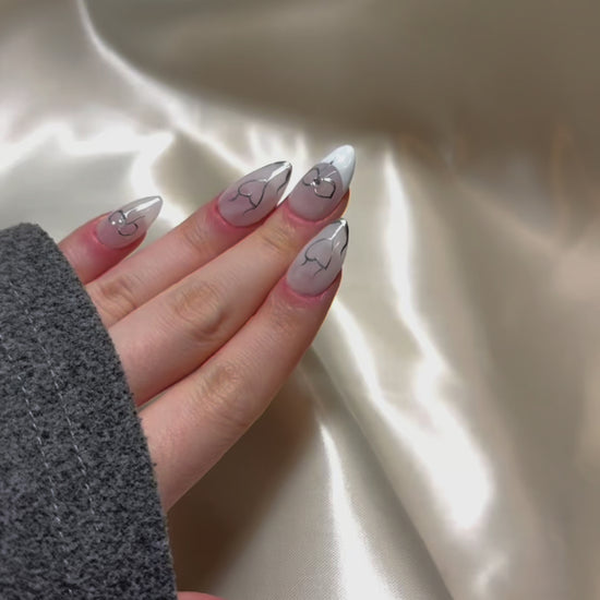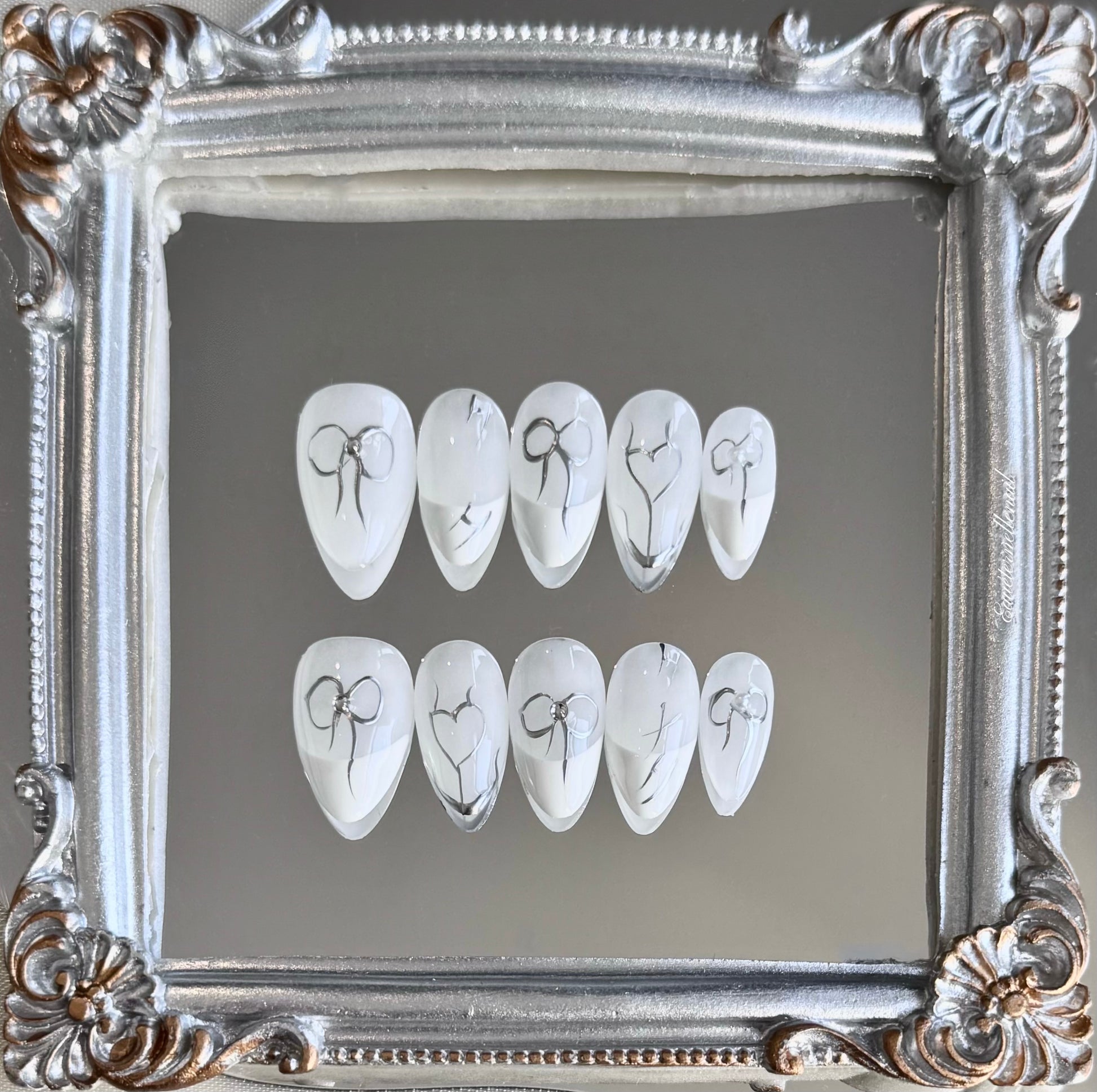 Ribbon Charme captures the playful spirit of hand-drawn elegance with a monochrome twist. Set against a translucent white base that mimics the soft glow of frosted glass, each nail features silver metallic ribbon and heart motifs sketched with deliberate imperfection - like ink on silk. The three-dimensional effect is enhanced by glossy gel layering and a touch of crystal embellishment, lending depth and texture without overwhelming the composition. This design exudes modern girlish charm with an artsy edge, making it a perfect choice for fashion-forward outings, gallery dates, or styled street looks.