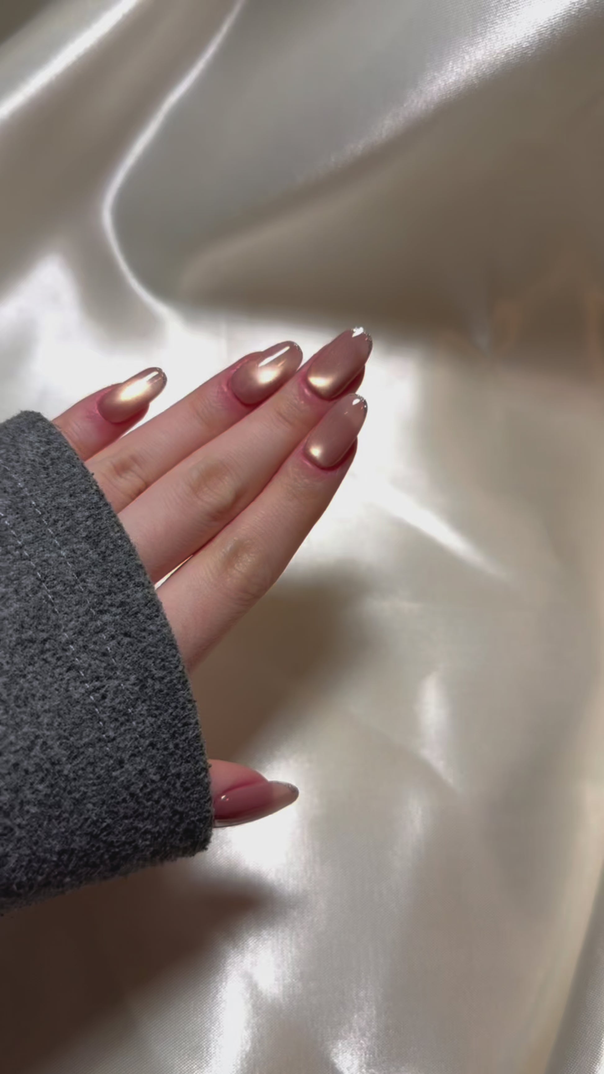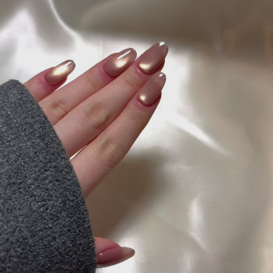 This set showcases a short oval shape for understated elegance. The luminous cat eye design shifts with light, featuring both wide and side glows for a multi-dimensional, refined finish. Delicate silver French tips add a touch of sophistication. Perfect for everyday elegance, intimate gatherings, or any occasion where subtle luxury shines..