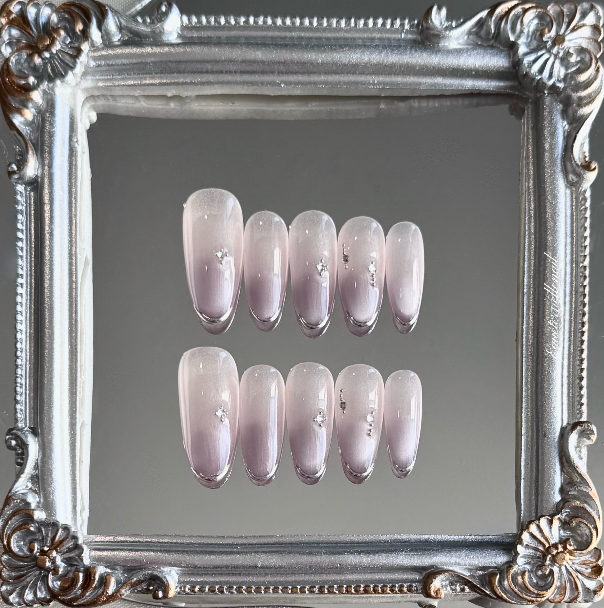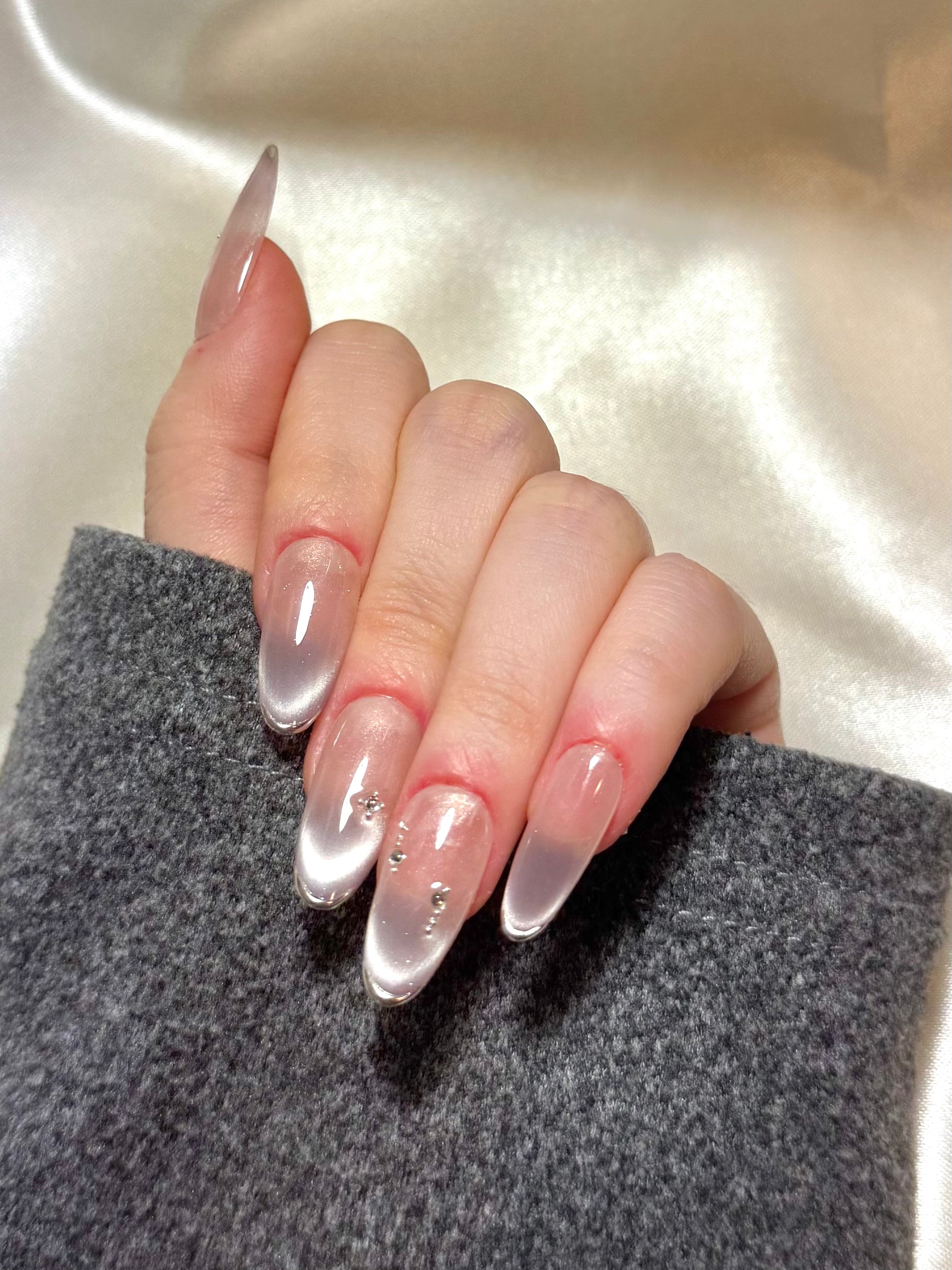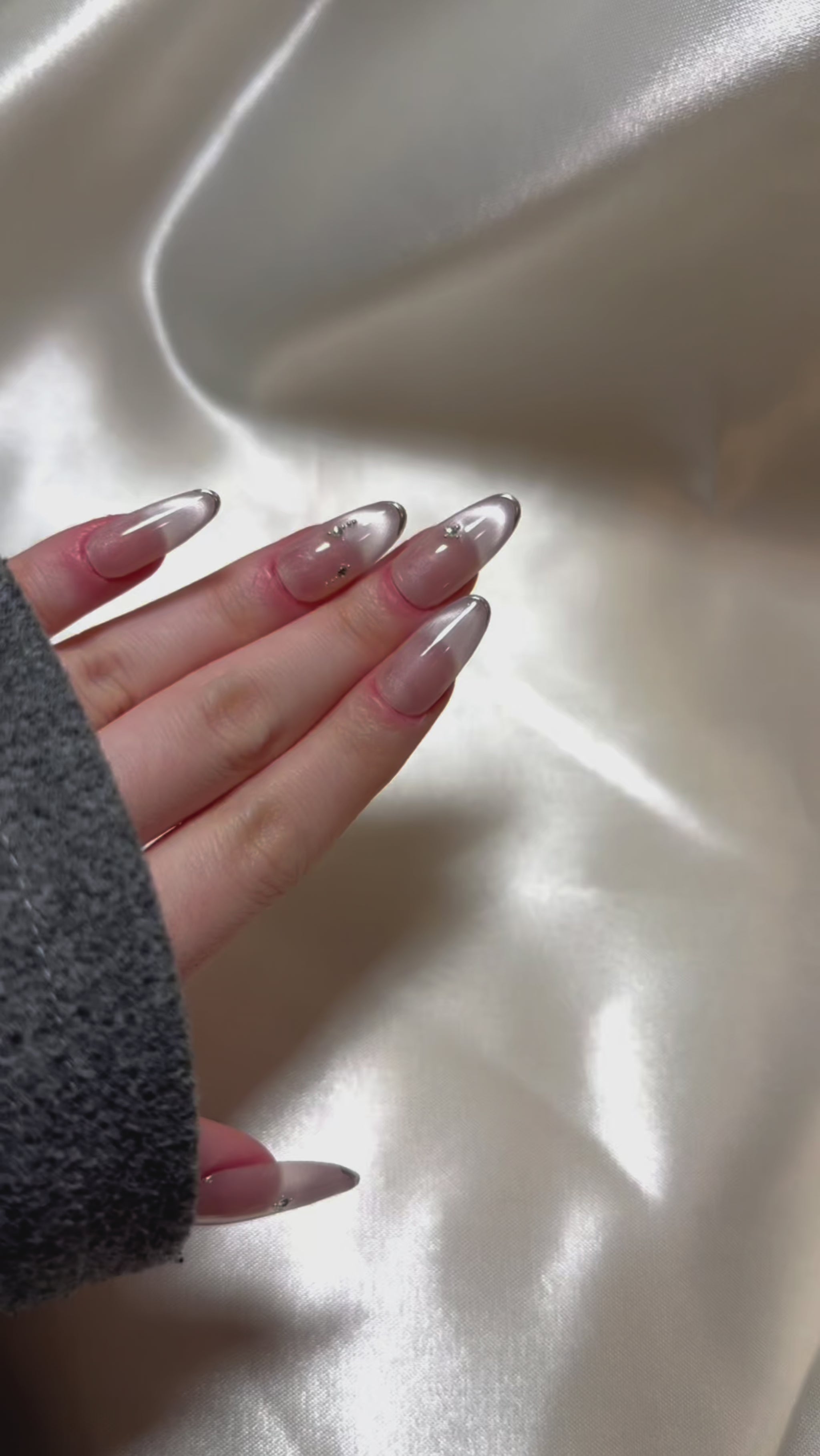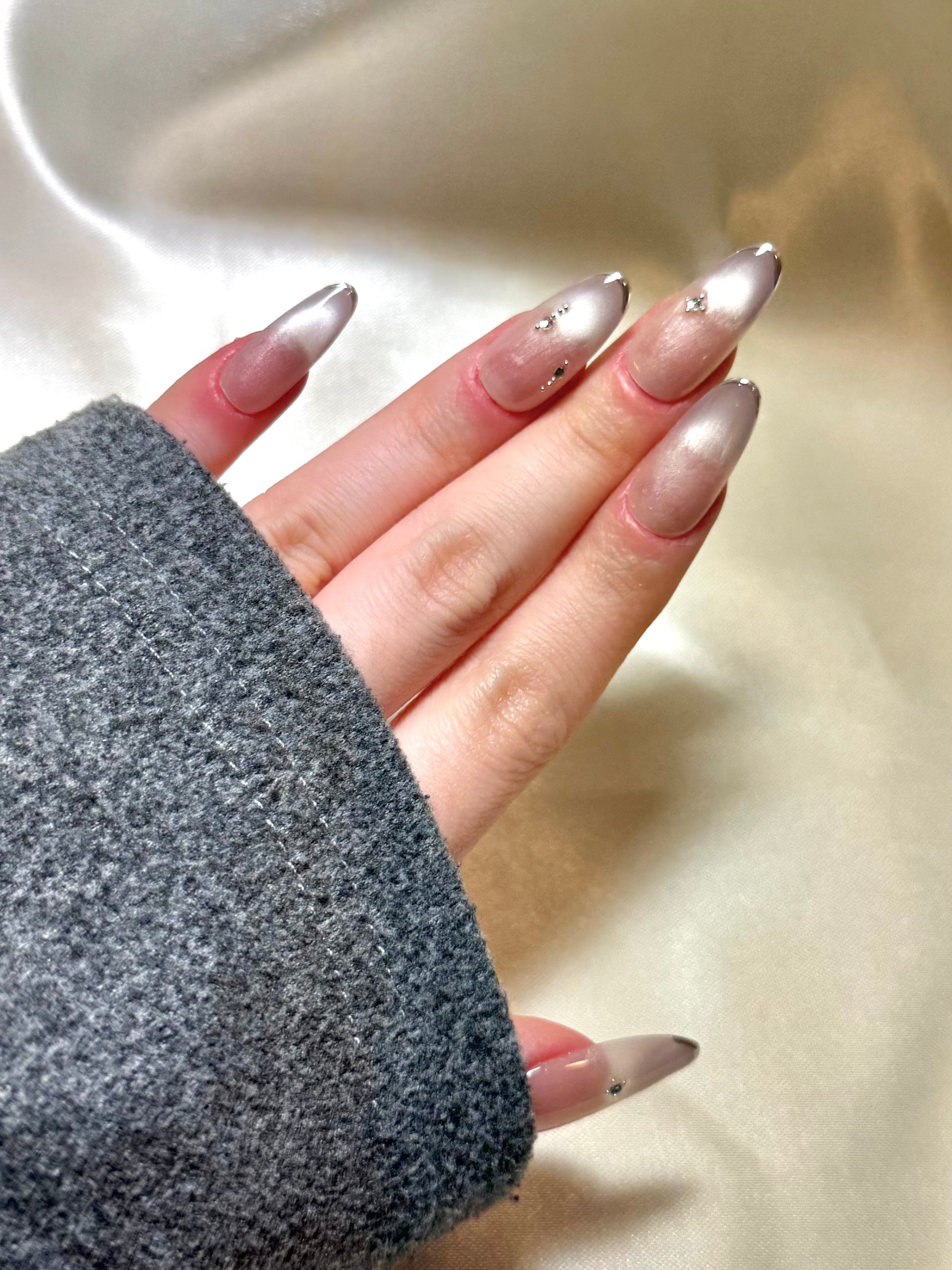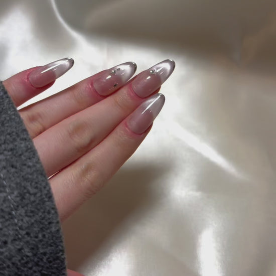 Bathed in the soft luminescence of a champagne-pink base, Silken Dawn evokes the quiet elegance of early morning light. This refined design features a delicate cat-eye shimmer that shifts with movement, achieved through golden polish artistry that creates a silky, diffused glow across the surface. Minimalist crystal accents are strategically placed to catch the light without overpowering the ethereal effect, enhancing its understated luxury. The style exudes a modern romanticism—effortlessly chic and versatile, ideal for formal occasions, bridal moments, or elevating everyday sophistication.