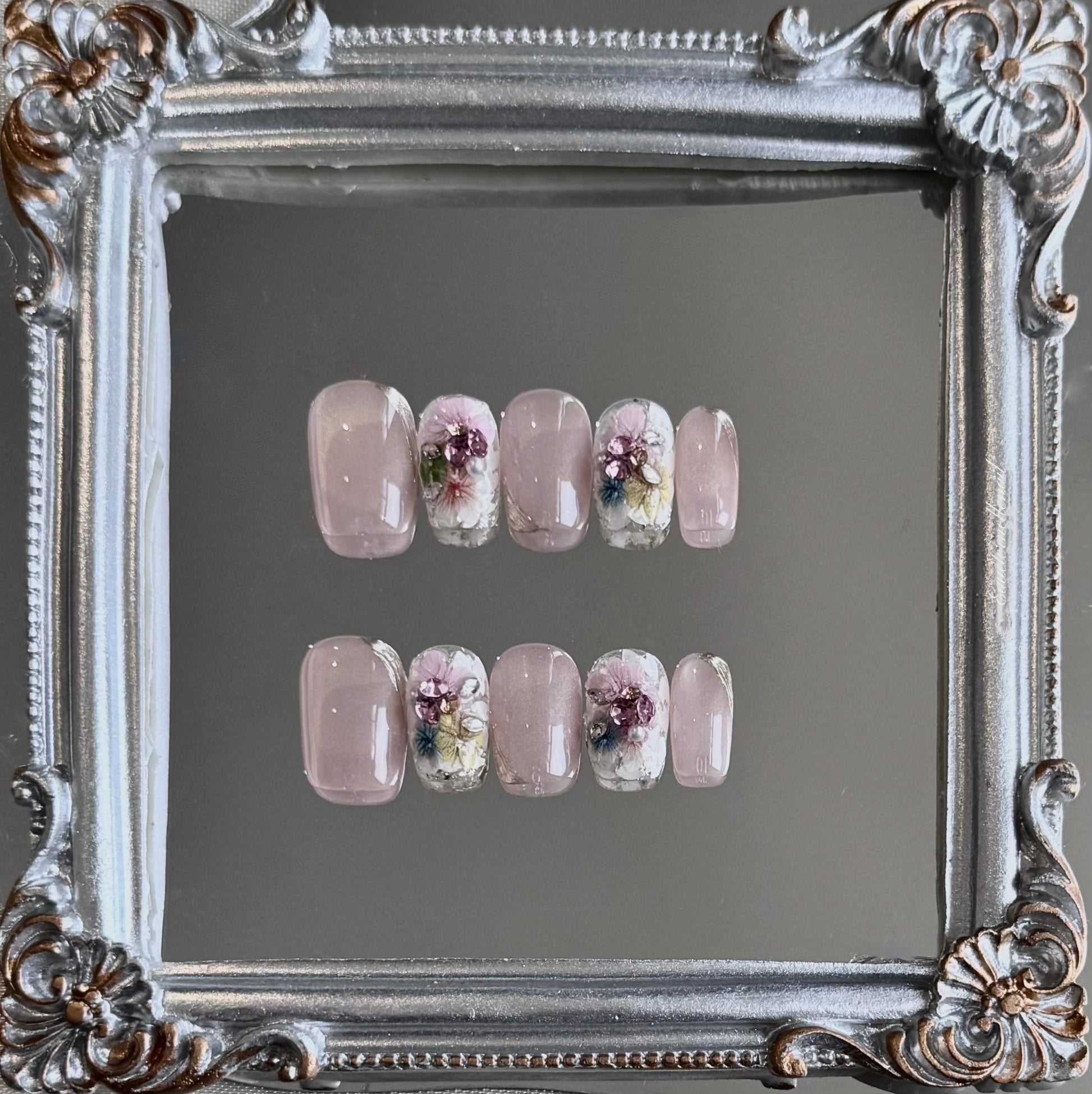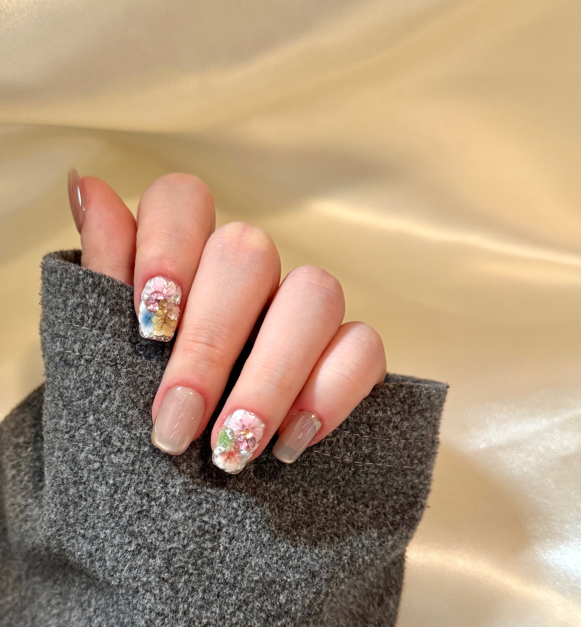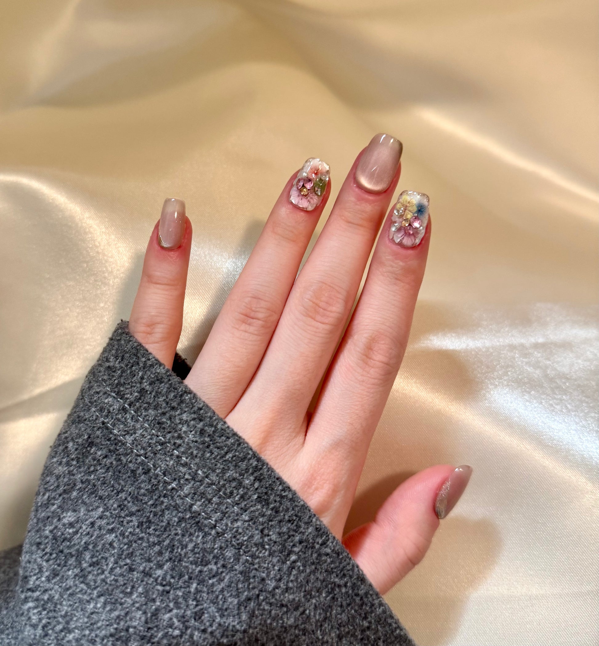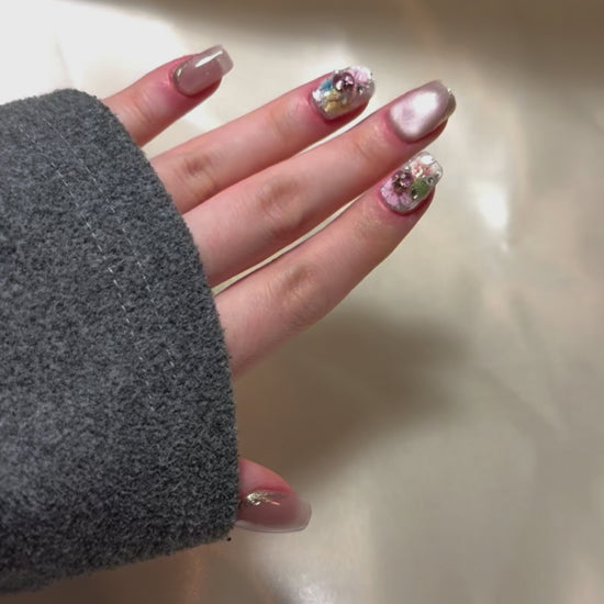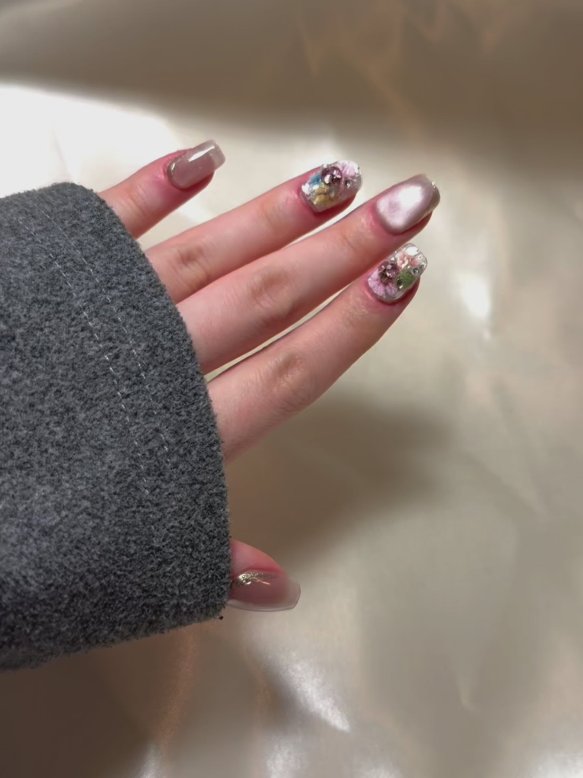 Soft and delicate, Spring’s Promise features a pearlescent nude-pink base with a subtle wide-glow cat eye effect. The short square shape offers a comfortable, everyday silhouette. Alternating nails are adorned with dried flower-inspired 3D embellishments in pastel hues — including blush pink, lavender, and cornflower blue — accented by crystal gems, micro pearls, and metallic gold foil. The overall design feels fresh yet composed, evoking the quiet optimism of early spring. Ideal for daily wear, brunch outings, or seasonal transitions when you want something charming yet refined.