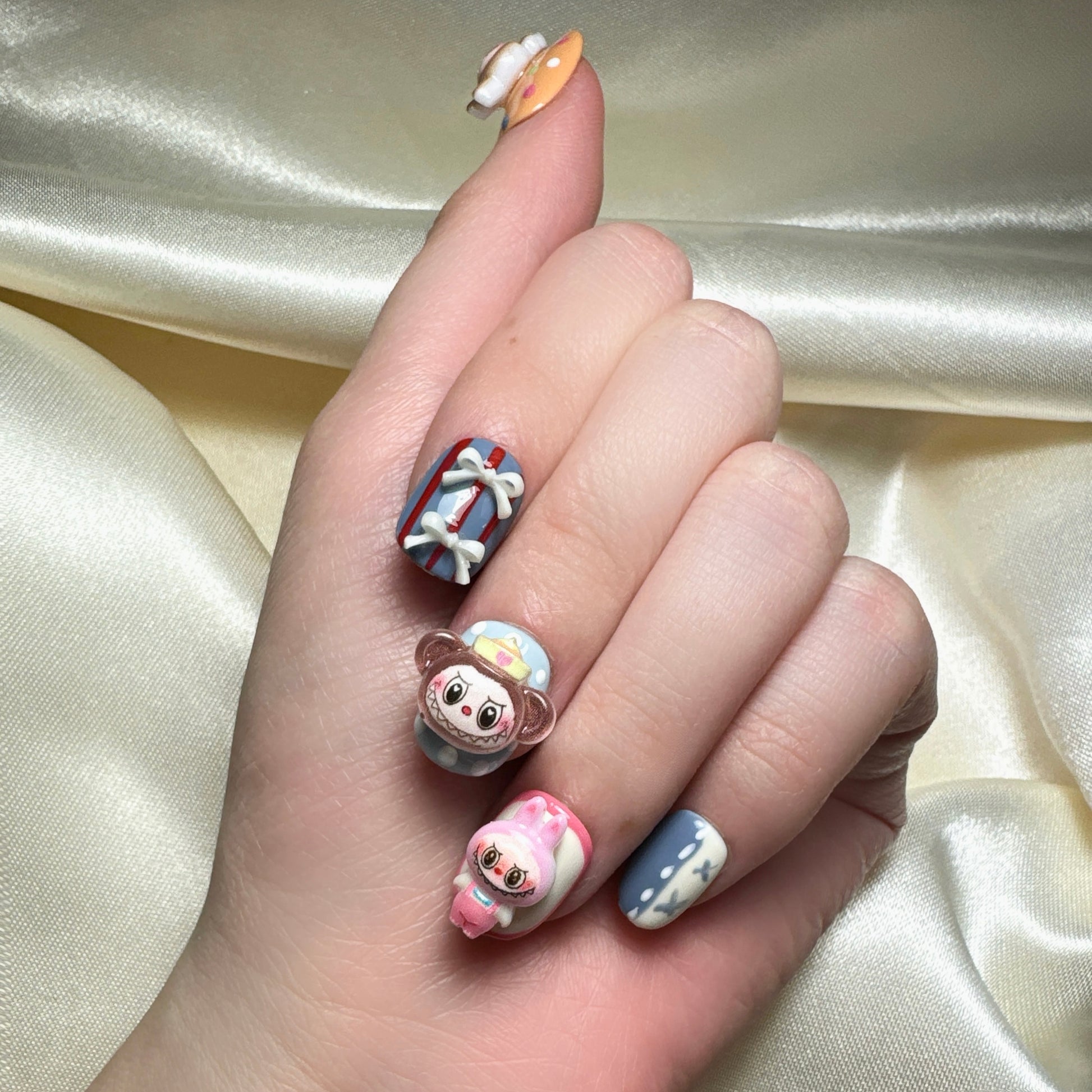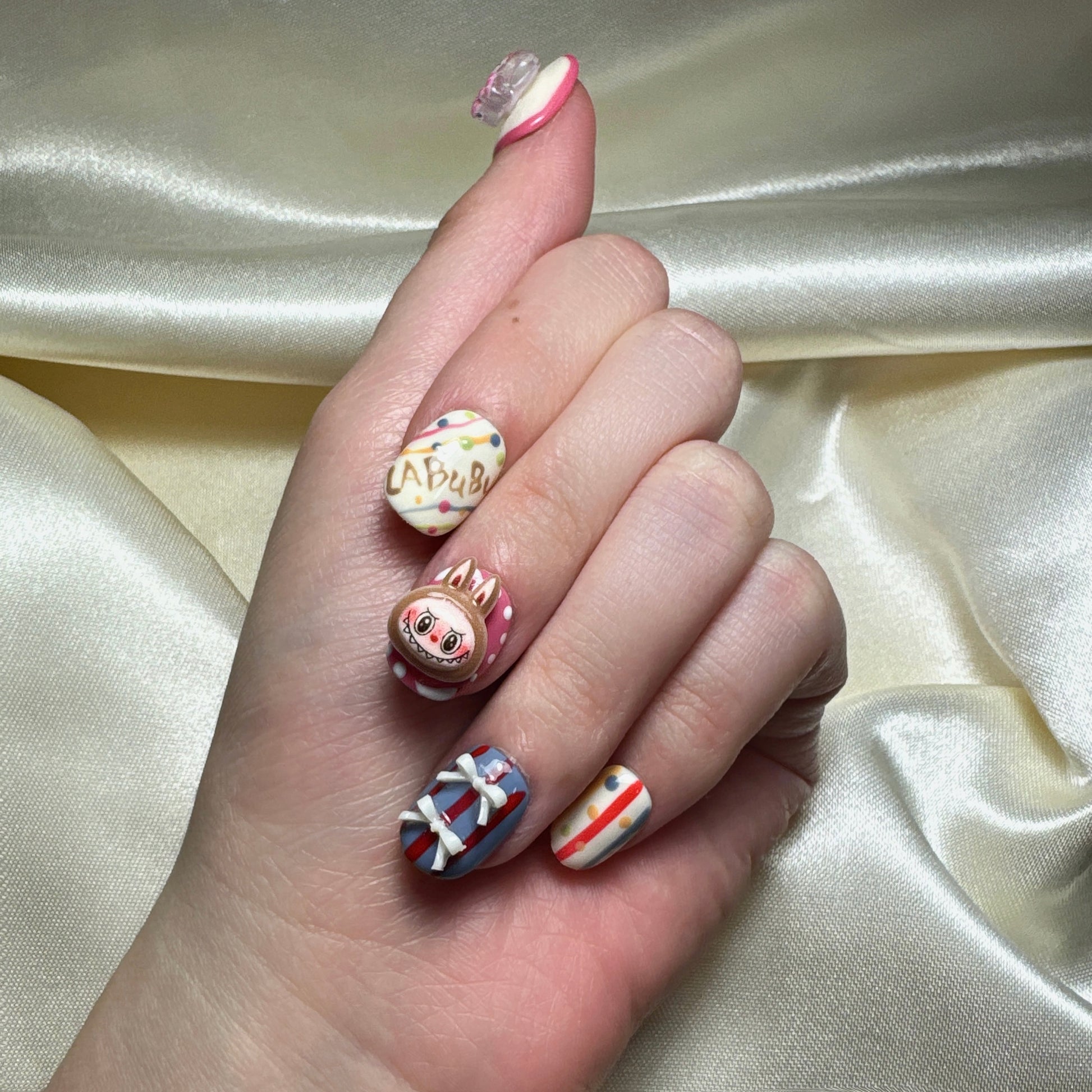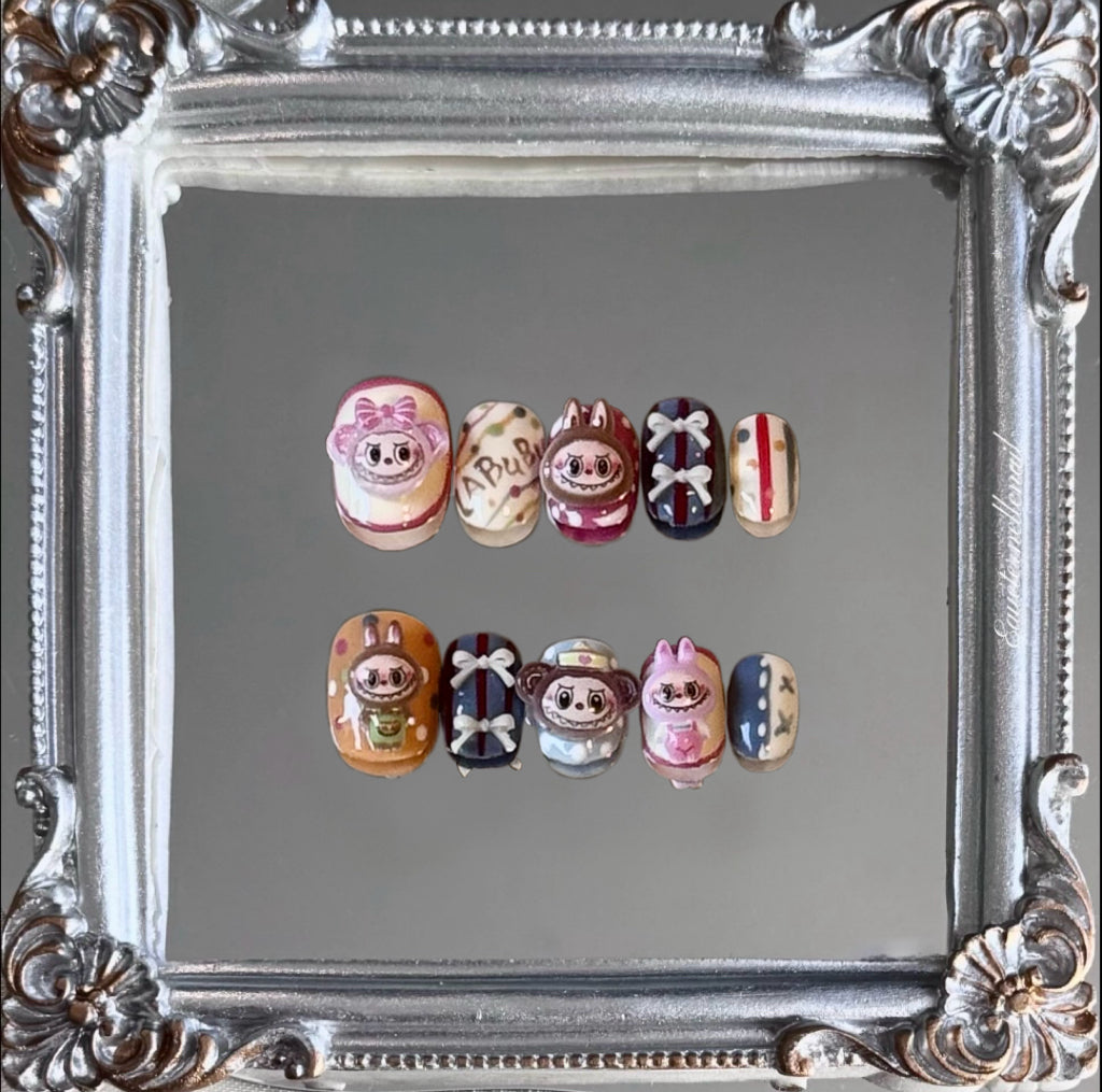 Sugar-sweet with a rebellious wink, Sweetie Labubu is a confection of color, character, and charm. This set brings Labubu’s softer side to life—blushing cheeks, pink bows, and heart-eyed mischief—wrapped in playful, candy-colored polish that looks good enough to eat. But don’t be fooled by the sweetness; this Labubu has spunk. From striped ribbons and confetti dots to sculpted bunny hoods and little sailor outfits, each nail is a scene from a topsy-turvy fairytale where rules are made to be reimagined. The palette balances bubblegum pinks, lemon yellows, blueberry blues, and milky whites, like a vintage sweet shop dipped in fantasy. “Labubu” scrawled in frosting-like script reminds us: cute doesn’t mean quiet. With its mix of 3D characters, gift-box accents, and pastel carnival vibes, Sweetie Labubu is perfect for character fans, kawaii lovers, and maximalists who wear their joy out loud. Ideal for pop-up cafés, themed events, playful dates—or anytime you want your nails to be the main attraction. This isn’t just sweet—it’s sugar with a wild side.