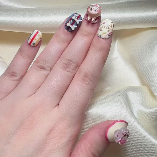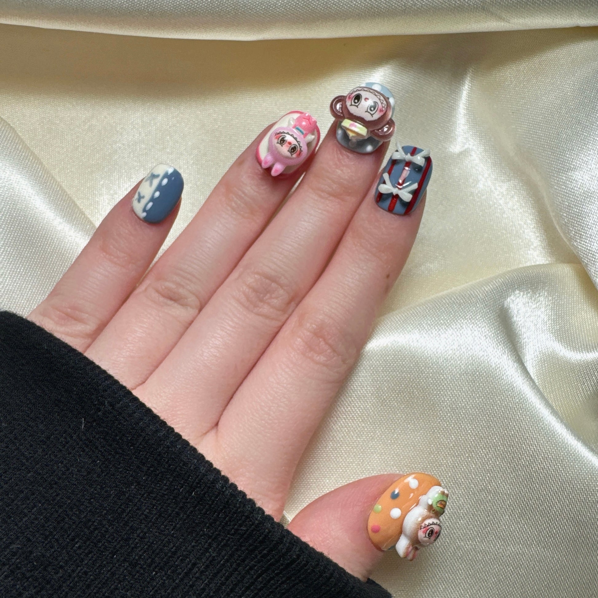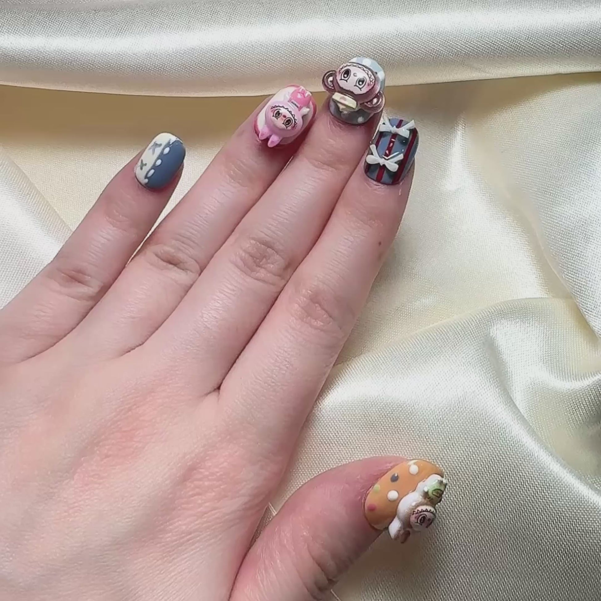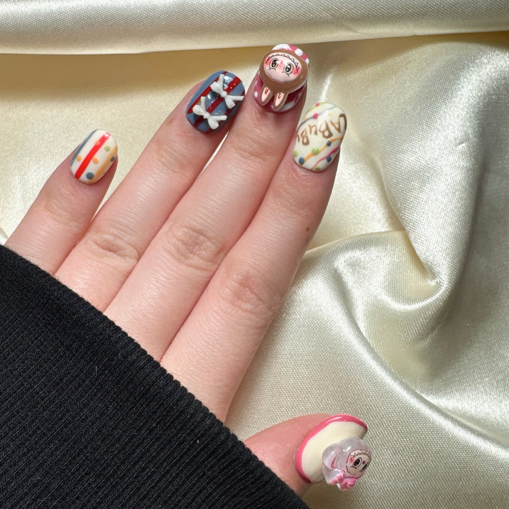 Sugar-sweet with a rebellious wink, Sweetie Labubu is a confection of color, character, and charm. This set brings Labubu’s softer side to life—blushing cheeks, pink bows, and heart-eyed mischief—wrapped in playful, candy-colored polish that looks good enough to eat. But don’t be fooled by the sweetness; this Labubu has spunk. From striped ribbons and confetti dots to sculpted bunny hoods and little sailor outfits, each nail is a scene from a topsy-turvy fairytale where rules are made to be reimagined. The palette balances bubblegum pinks, lemon yellows, blueberry blues, and milky whites, like a vintage sweet shop dipped in fantasy. “Labubu” scrawled in frosting-like script reminds us: cute doesn’t mean quiet. With its mix of 3D characters, gift-box accents, and pastel carnival vibes, Sweetie Labubu is perfect for character fans, kawaii lovers, and maximalists who wear their joy out loud. Ideal for pop-up cafés, themed events, playful dates—or anytime you want your nails to be the main attraction. This isn’t just sweet—it’s sugar with a wild side.