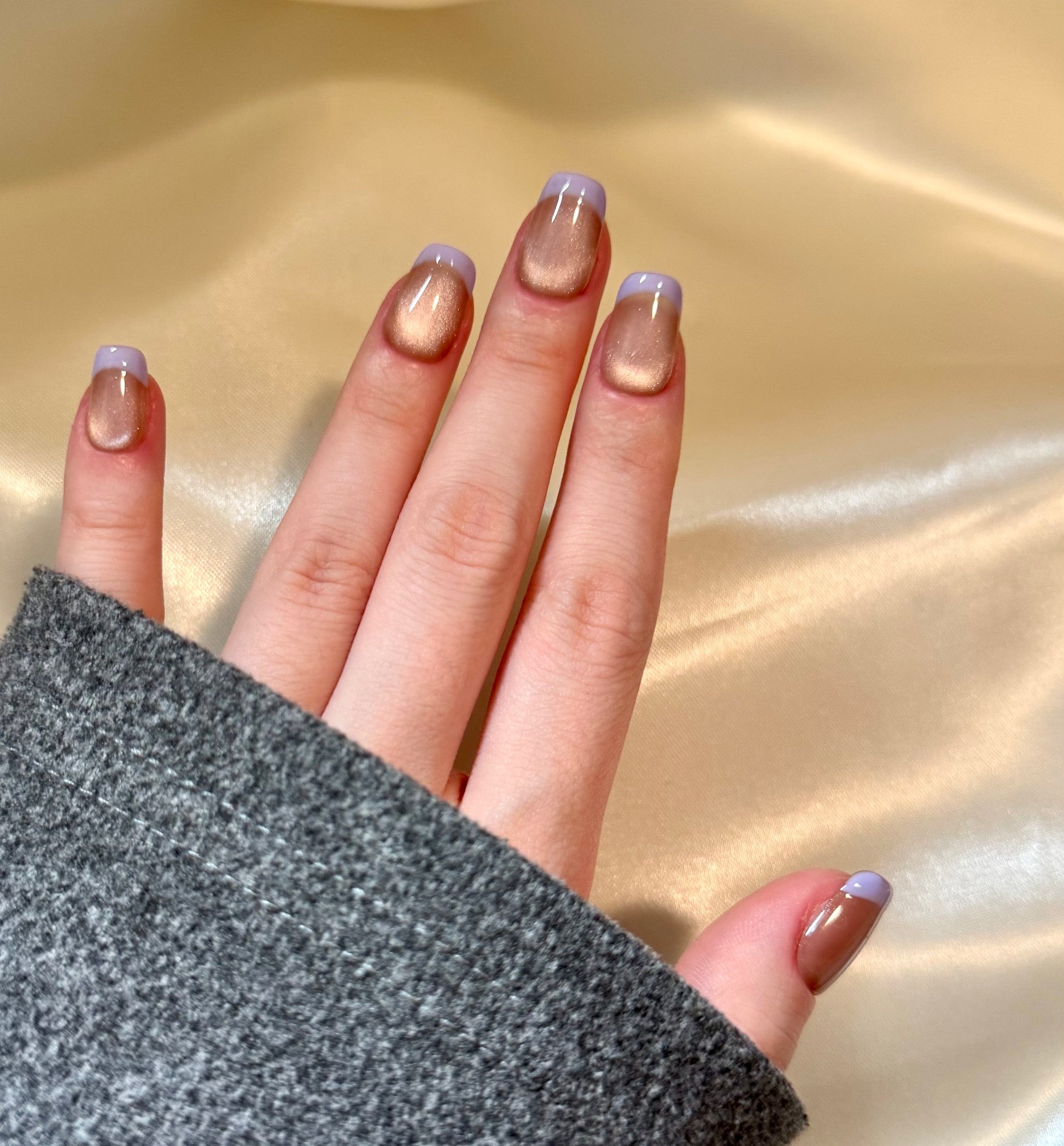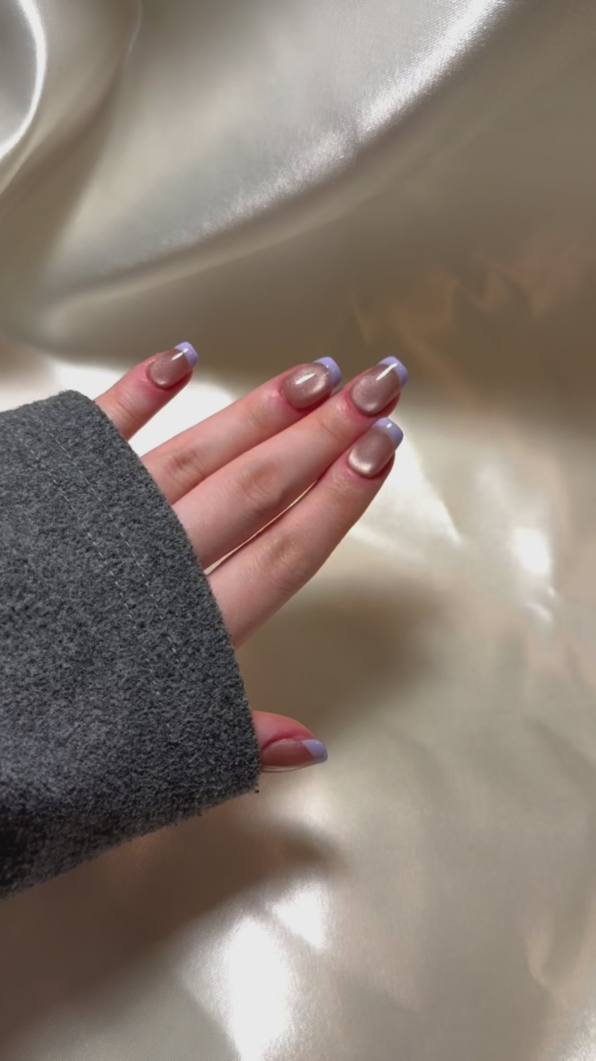 Taro Romance features a soft nude cat eye base paired with pastel lilac French tips in a clean short coffin shape. The luminous sheen and subtle color contrast evoke a sense of calm and freshness, offering a minimal yet refined aesthetic. Perfect for office wear, casual dates, or spring brunches, this design suits anyone who embraces understated charm with a hint of pastel whimsy.