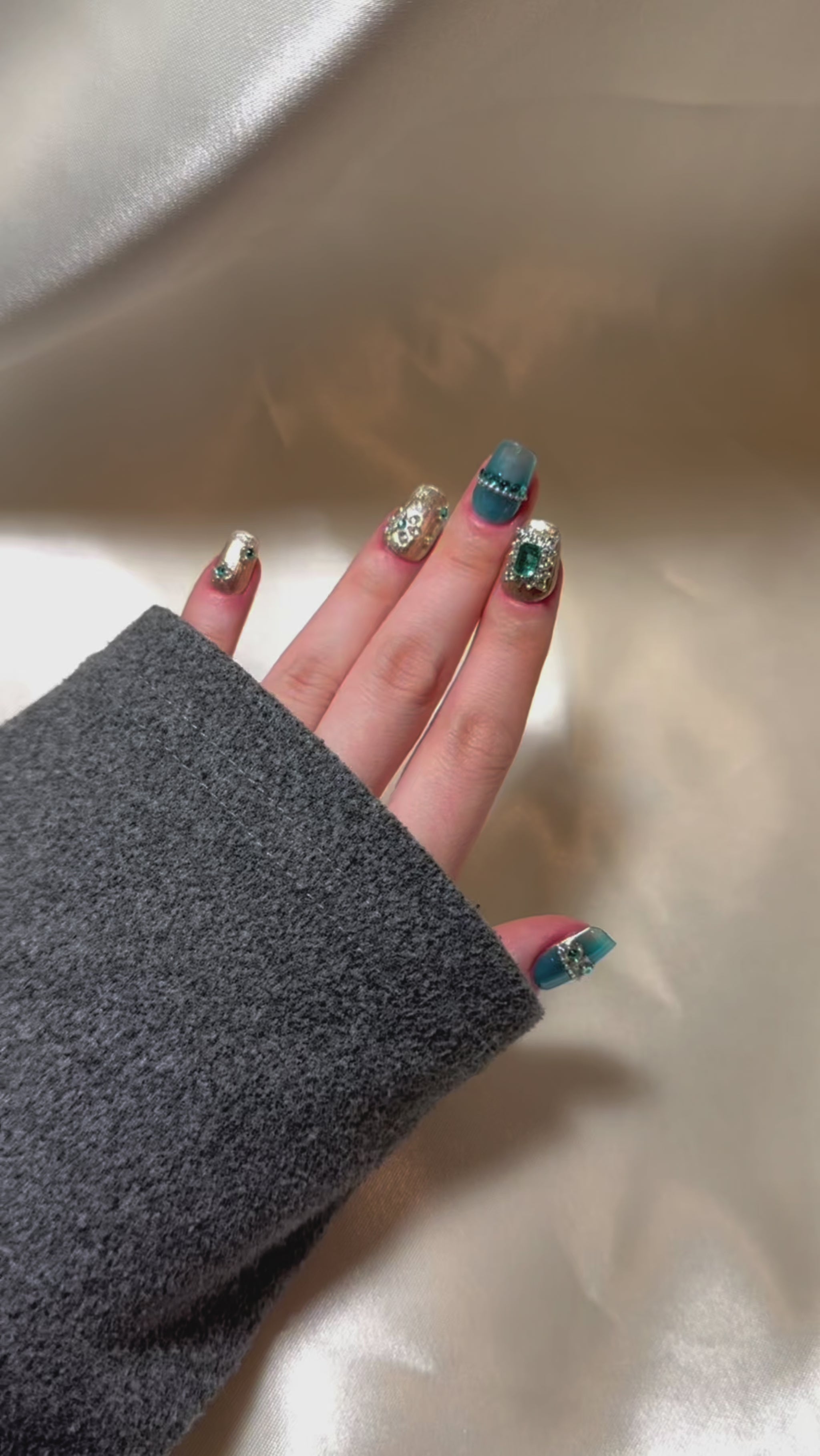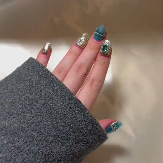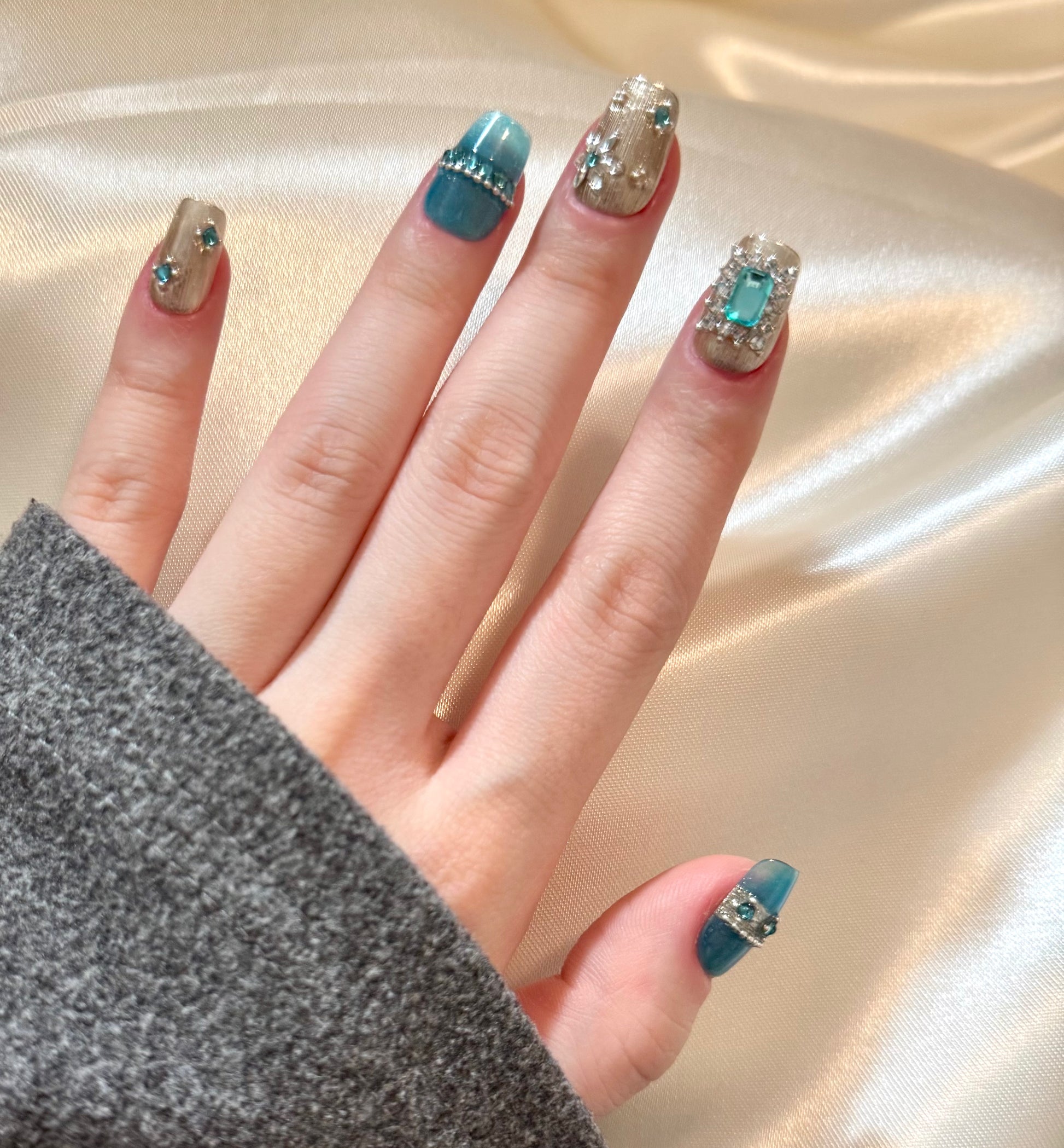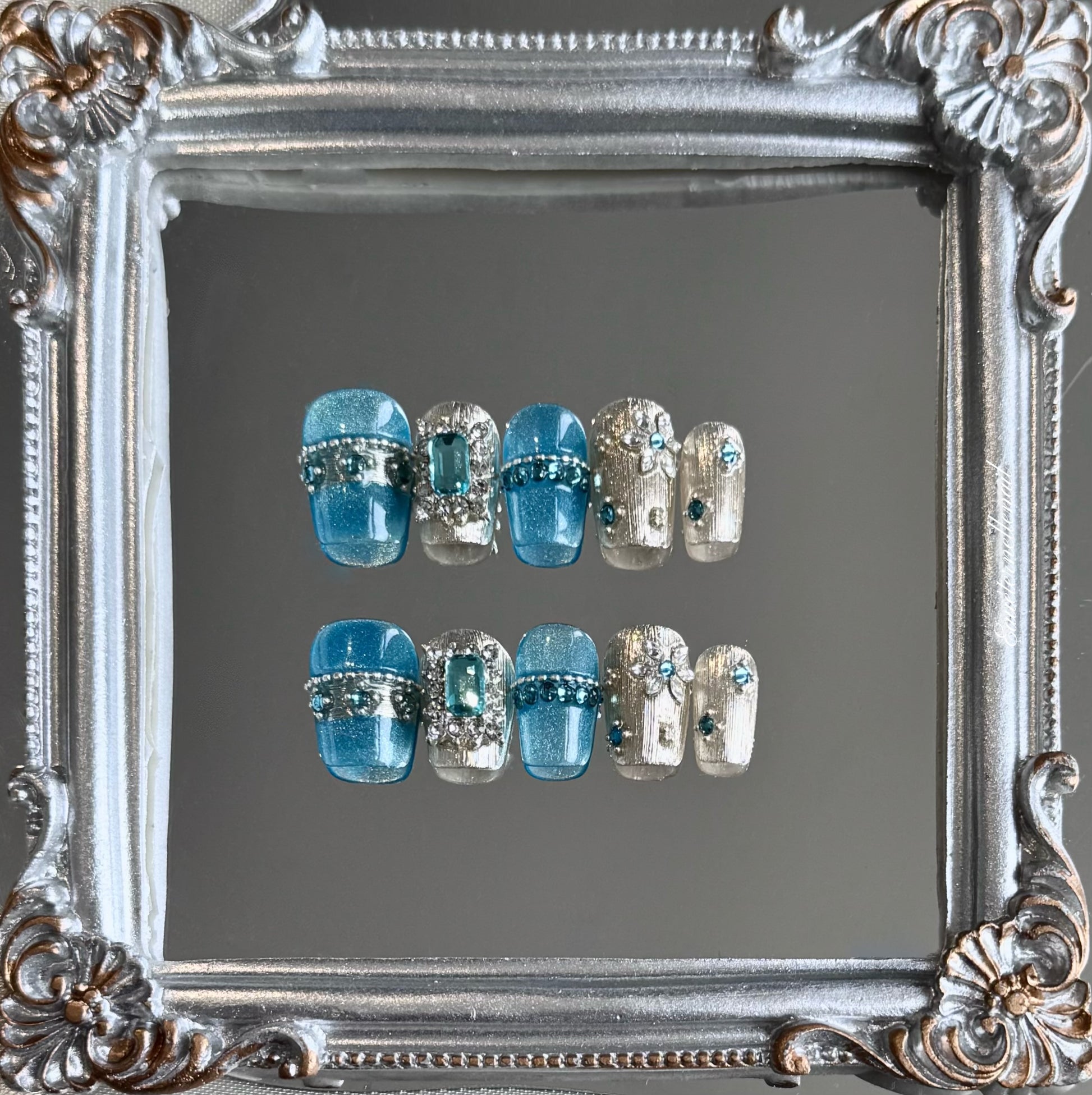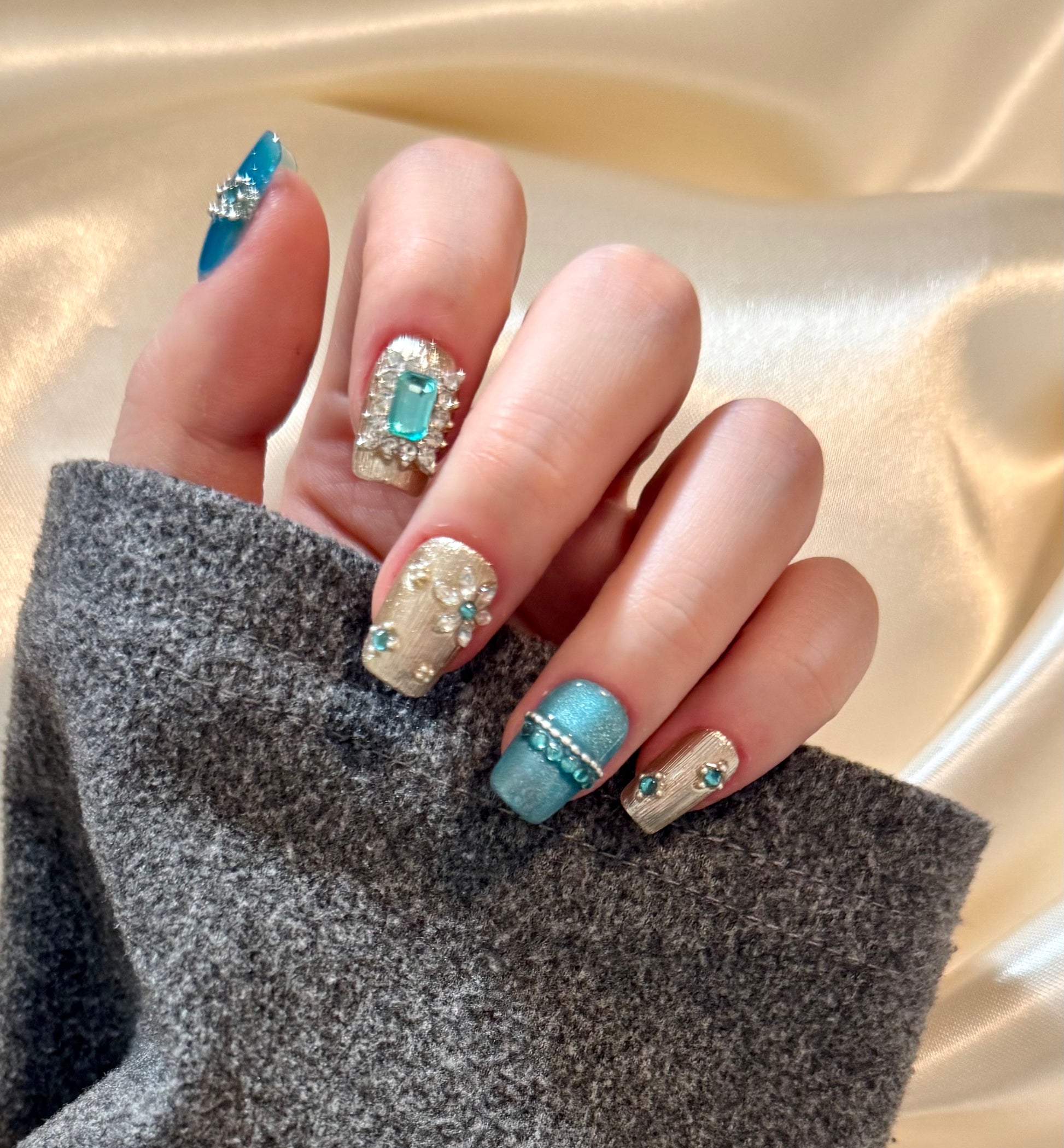 Rich in texture and tone, Velvet Duke combines a regal cat eye blue base with soft velvet shimmer and embossed golden detailing. Set on a short coffin shape, the nails alternate between brushed gold accents and deep sky-blue tones, each separated by delicate metallic striping and crystal studs. A central statement gem resembling an emerald-cut jewel adds a focal point of vintage elegance. Ideal for formal gatherings, evening events, or adding a sophisticated edge to everyday ensembles.