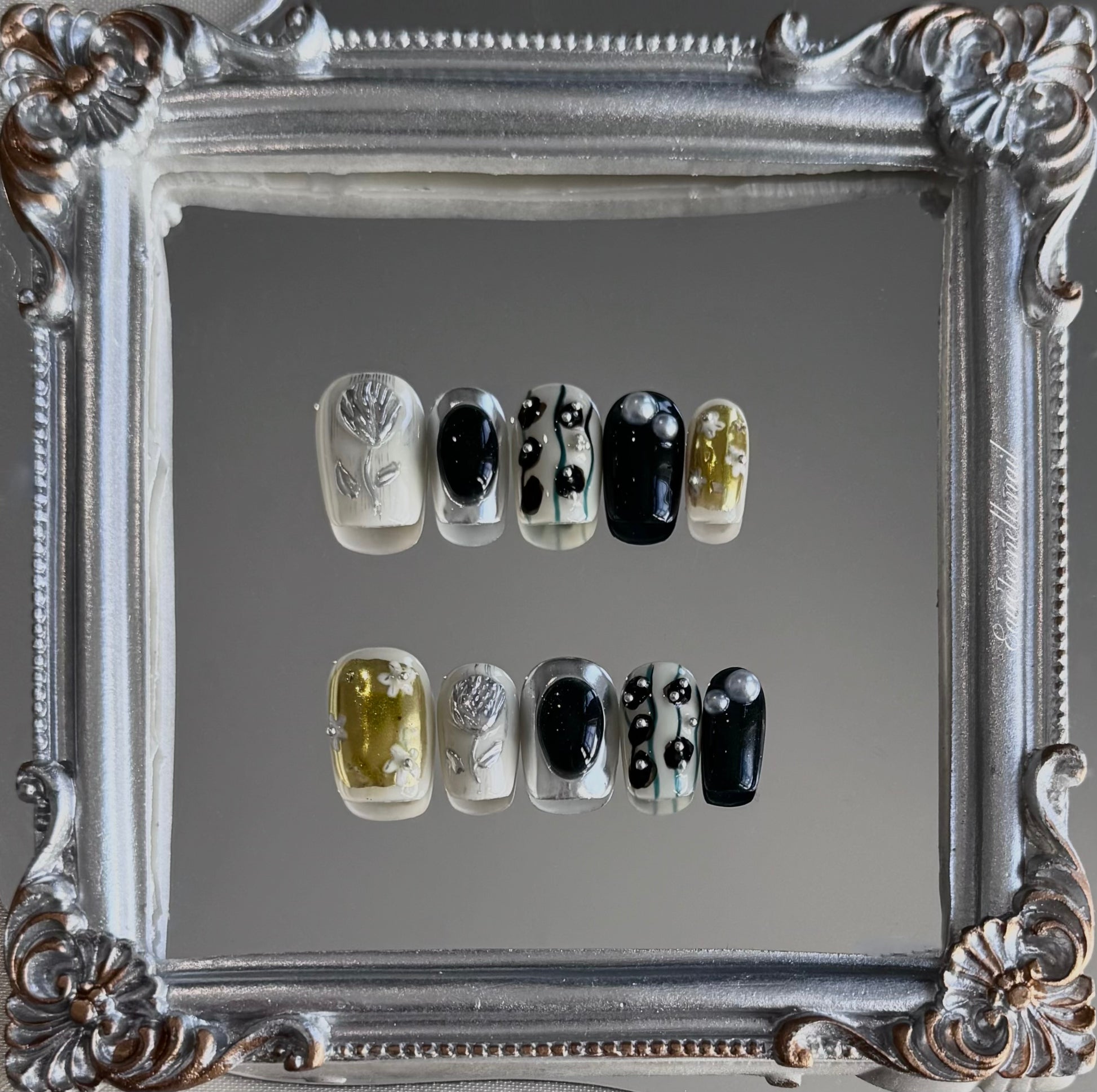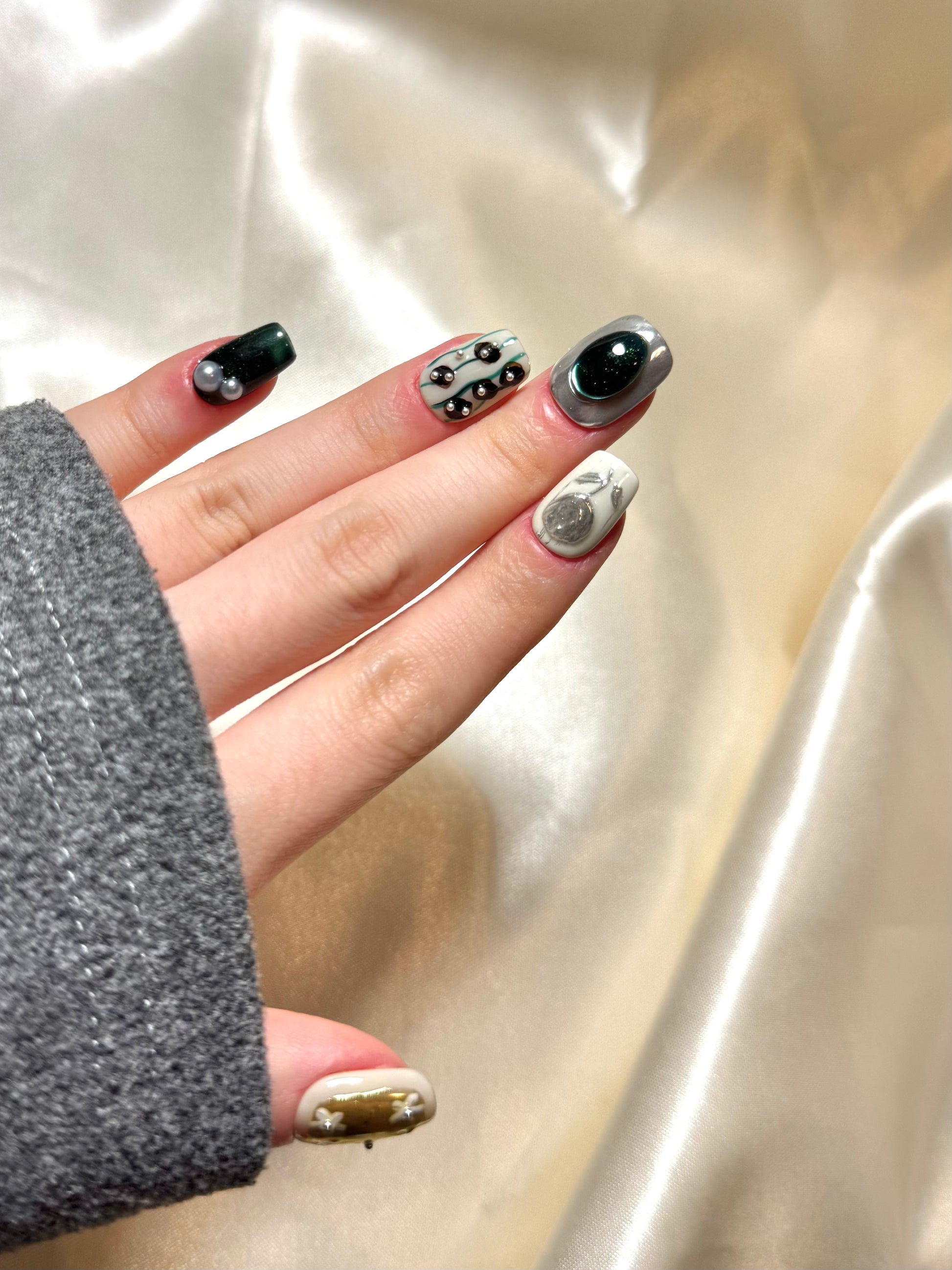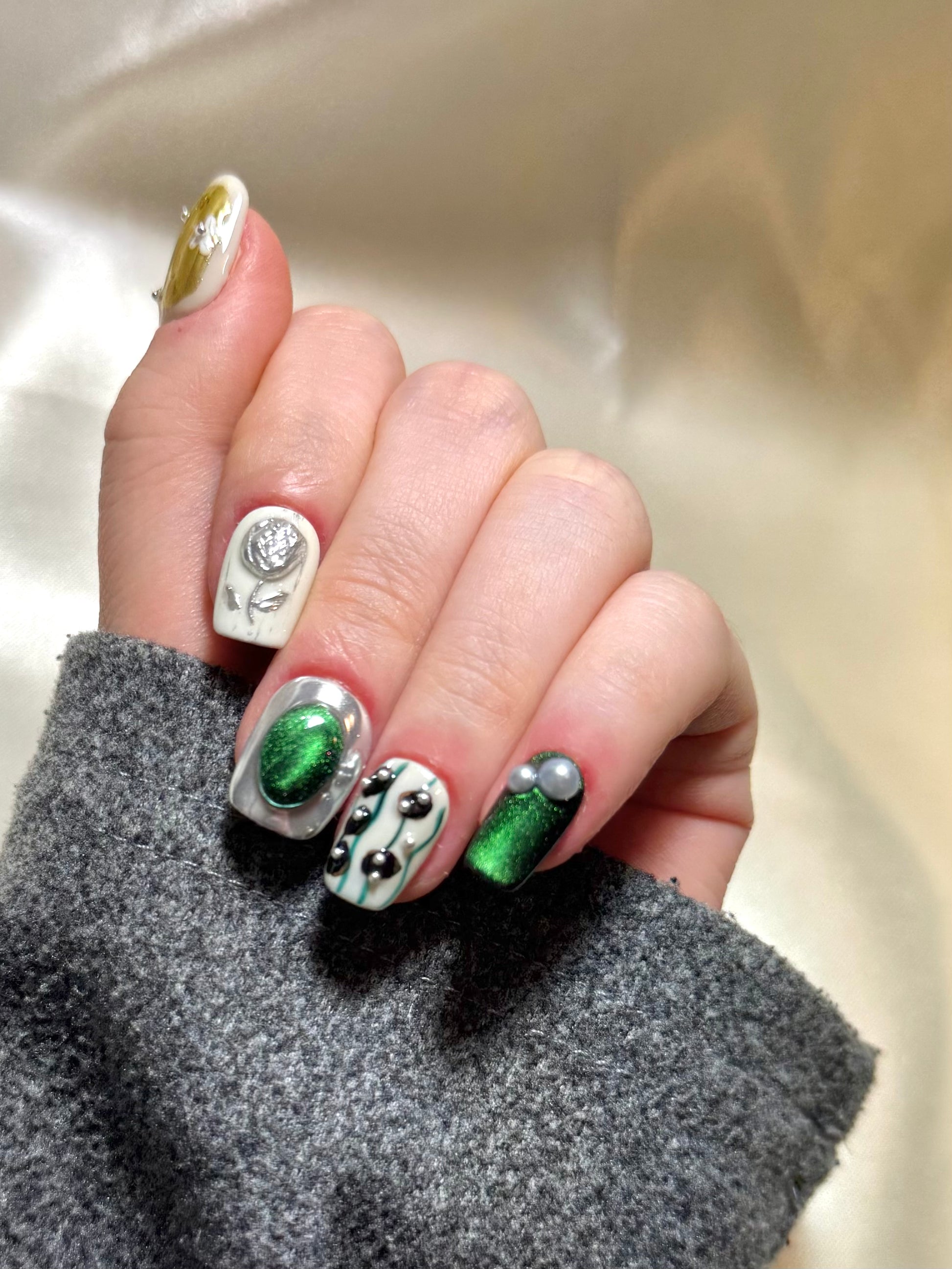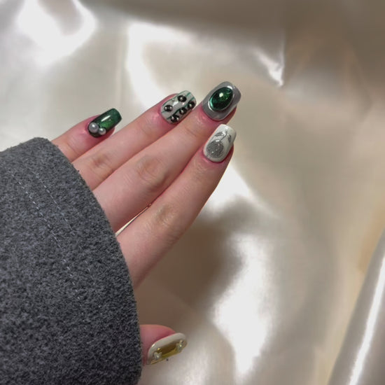 Unexpected pairings often spark the most intriguing designs—Verdant Alloy balances bold contrast with intricate detail. Deep forest green and reflective chrome create the foundation, accented by hand-molded metallic florals and sculptural pearls. Translucent golden panels cradle delicate white florals, like petals floating in liquid sunlight. Hints abstract black-and-white marbling and tiny silver studs introduce an avant-garde rhythm. The result is a look that feels simultaneously organic and futuristic. Ideal for fashion-forward occasions or statement styling.