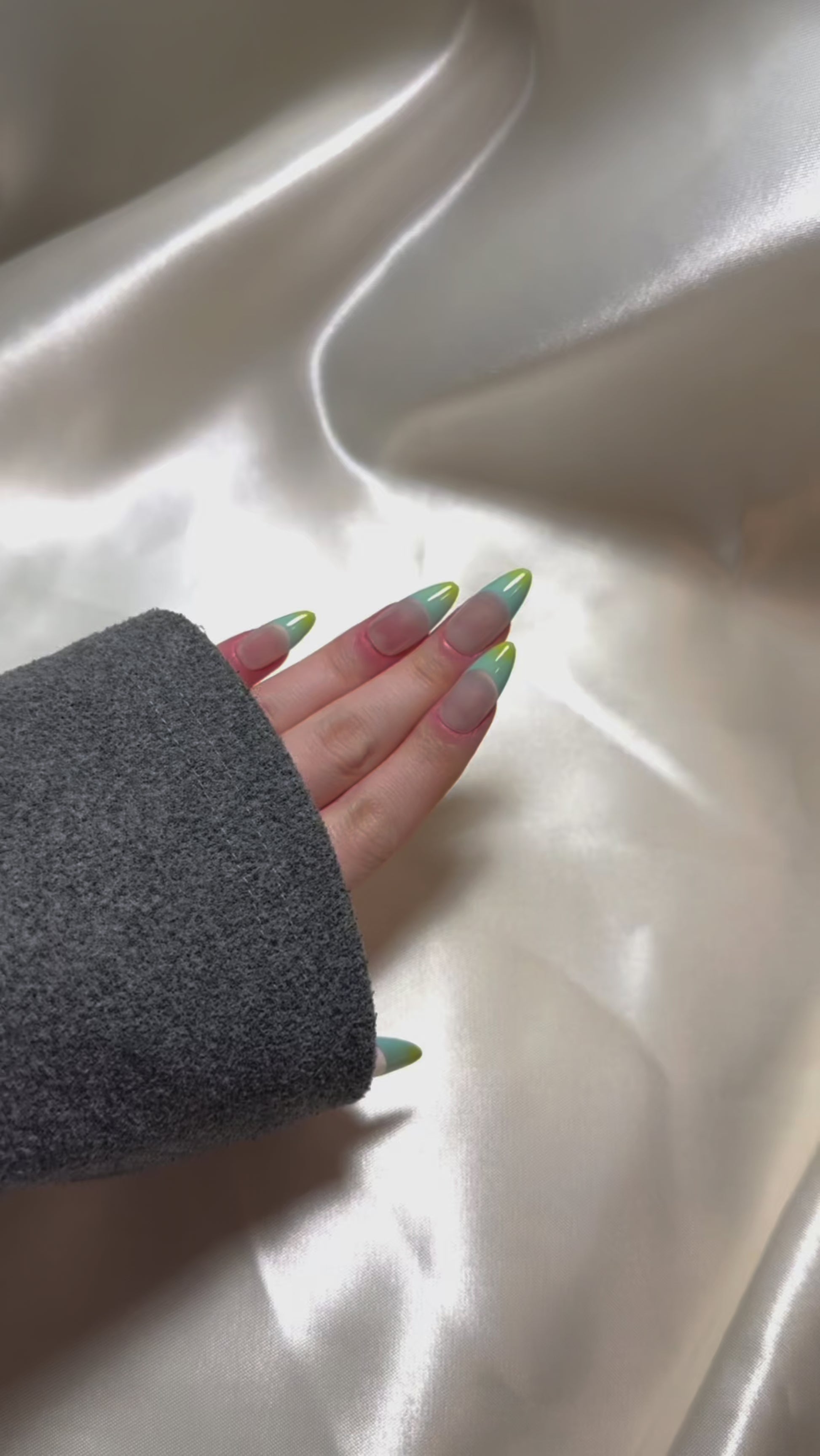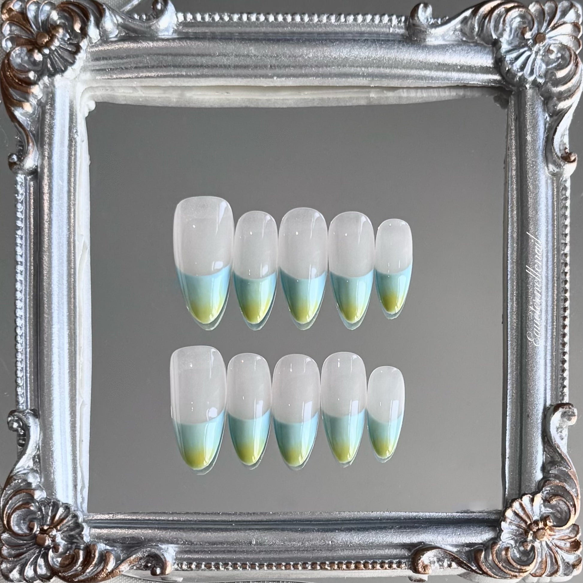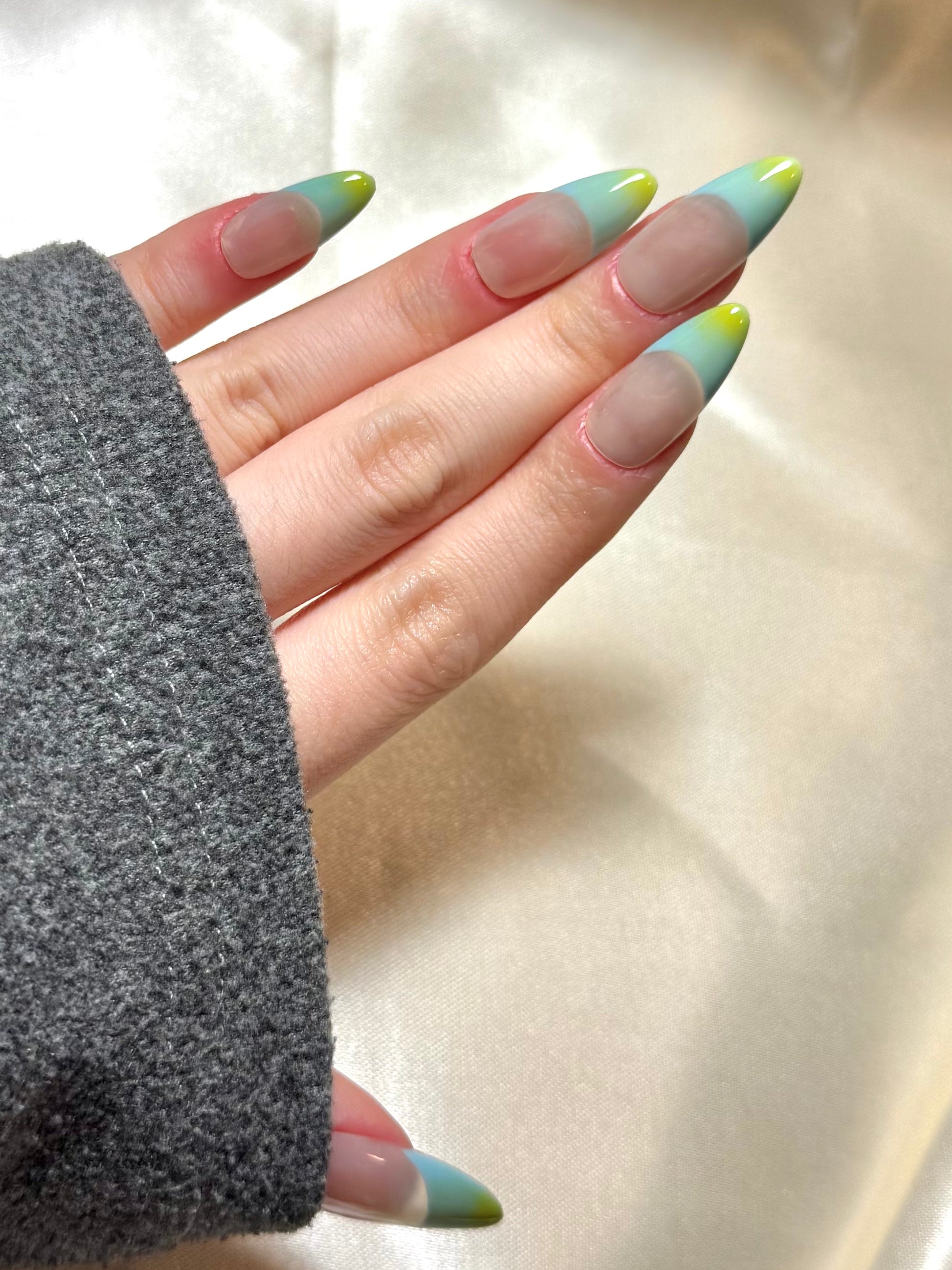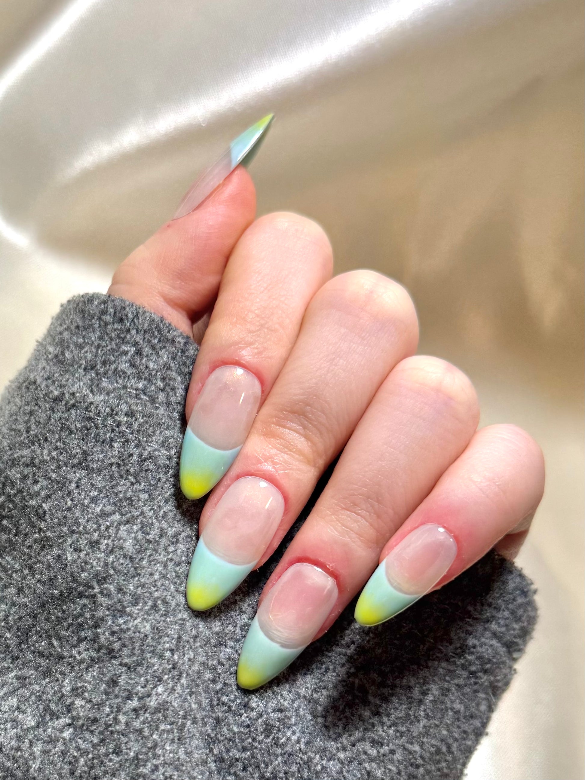 Verdant Shore evokes the tranquil rhythm of ocean tides meeting lush coastline, a refreshing ode to natural simplicity. The translucent nude base creates a clean, breathable canvas, while the V-shaped French tips bloom into a seamless ombré of seafoam blue fading into zesty lime green - a palette inspired by shallow waters lapping against sunlit grass. This minimalist yet vibrant gradient design is hand-blended for a soft-edge transition, offering a serene yet playful twist on classic color blocking. Perfect for beach strolls, weekend brunches, or adding a subtle statement to resort wear.